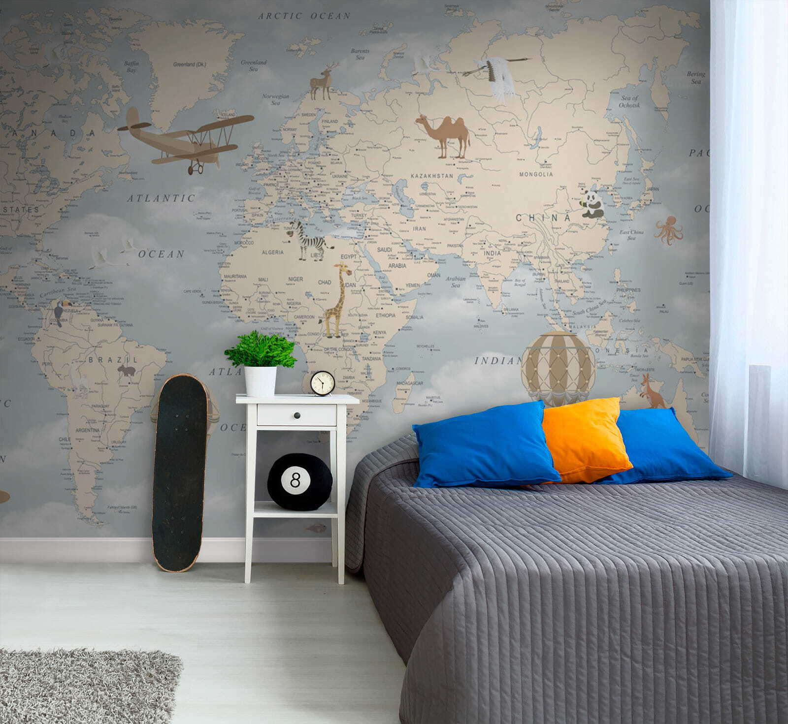 Η ενσωμάτωση αυτής της τοιχογραφίας στο χώρο σας δεν αφορά μόνο τη διακόσμηση, αλλά και τη δημιουργία ενός σκηνικού για ιστορίες και φαντασία. Σκεφτείτε μόνο το παιδί σας να διαγράφει τα δάχτυλά του κατά μήκος του χάρτη, να ονειρεύεται περιπέτειες σε μακρινές χώρες ή ακόμη και να σχεδιάζει μελλοντικά ταξίδια. Επιπλέον, δεν είναι μόνο διασκεδαστικό για τα παιδιά – είναι και αφορμή για συζήτηση για όποιον μπαίνει στο δωμάτιο. Δεν μπορείτε να φανταστείτε τα μικρά παιδιά να δείχνουν πού βρίσκονται στο χάρτη ή να επινοούν ιστορίες για τα ζώα που εντοπίζουν;