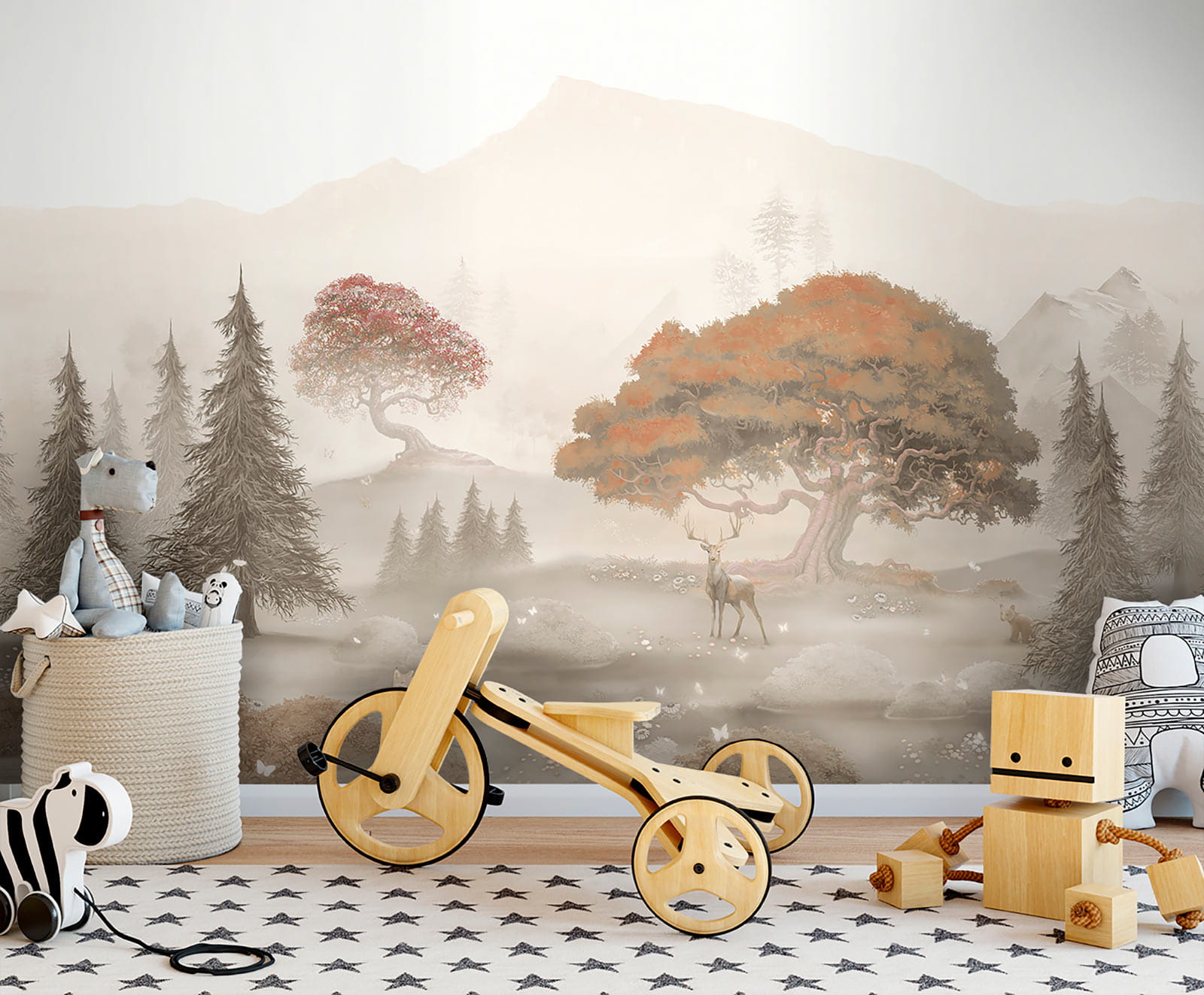 Φανταστείτε να μπαίνετε σε ένα ονειρικό δάσος χωρίς να φύγετε από το σαλόνι σας. Αυτή η ταπετσαρία τοίχου, με τις απαλές αποχρώσεις των δέντρων και των μακρινών βουνών, σας μεταφέρει σε έναν γαλήνιο κόσμο όπου κυριαρχεί η φύση. Φανταστείτε ένα χαλαρό απόγευμα, πίνοντας καφέ ενώ οι πεταλούδες πετούν γύρω σας και τα ελάφια βόσκουν ήσυχα. Είναι σαν να κάνετε μια μικρή απόδραση κάθε μέρα! Τα ζωντανά χρώματα, ειδικά το εντυπωσιακό κόκκινο δέντρο, ξεχωρίζουν στο ομιχλώδες φόντο, δημιουργώντας μια ζεστή ατμόσφαιρα. Μεταμορφώνει κάθε χώρο σε ένα καταφύγιο. Εμπρός λοιπόν, αφήστε τους τοίχους σας να διηγηθούν μια ιστορία ηρεμίας. Δεν θα ήταν υπέροχο;