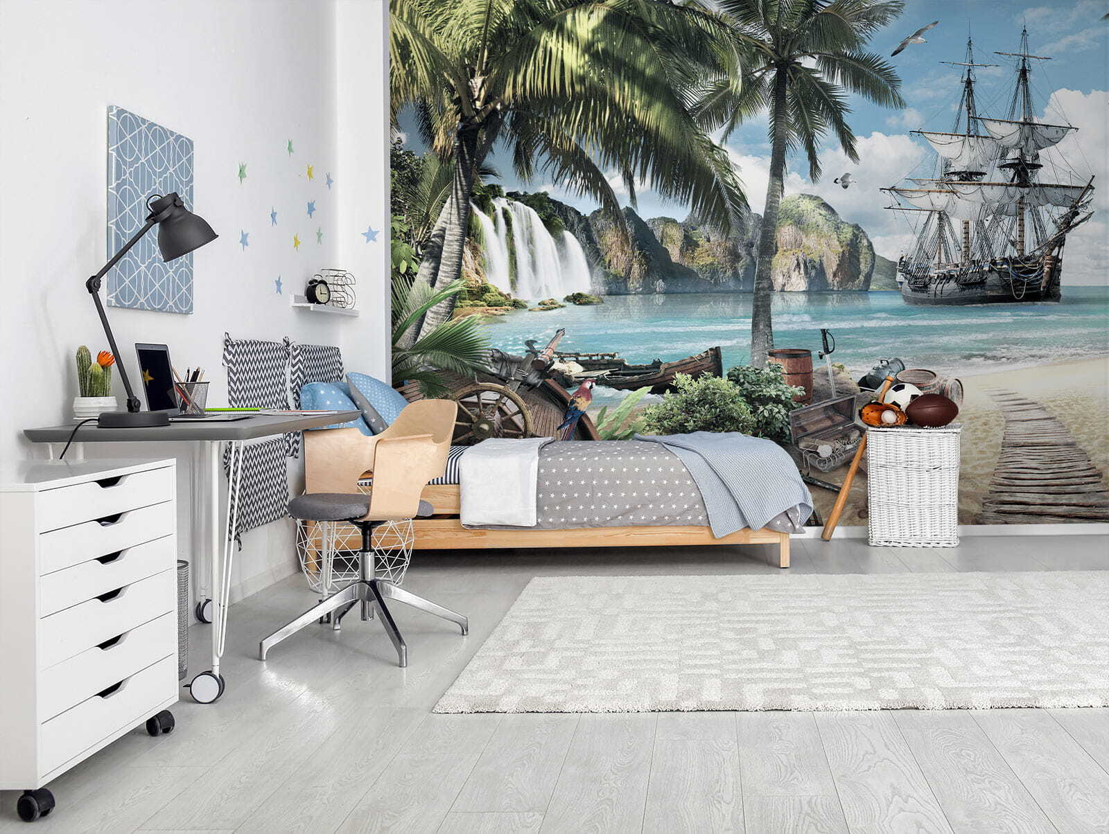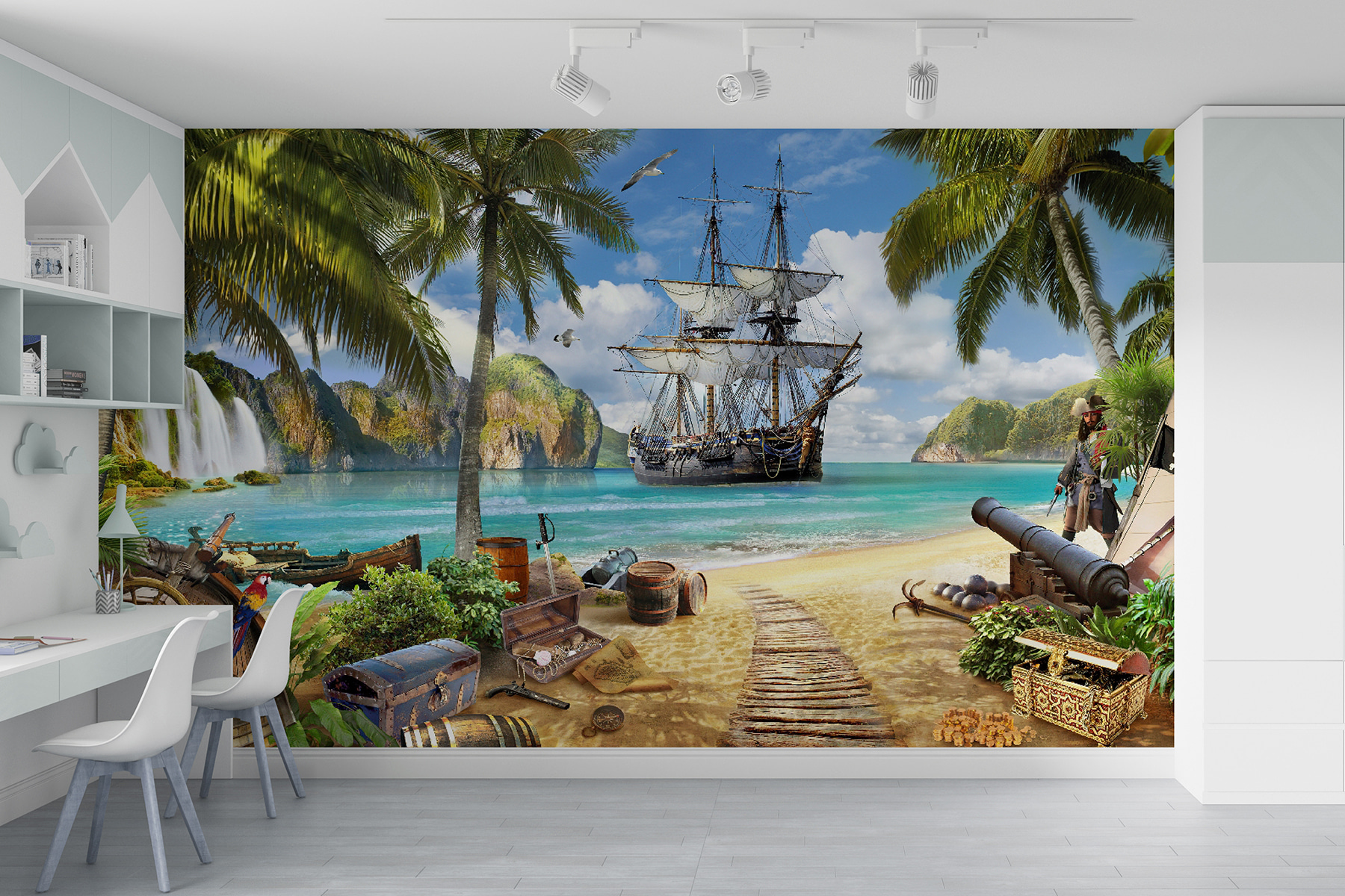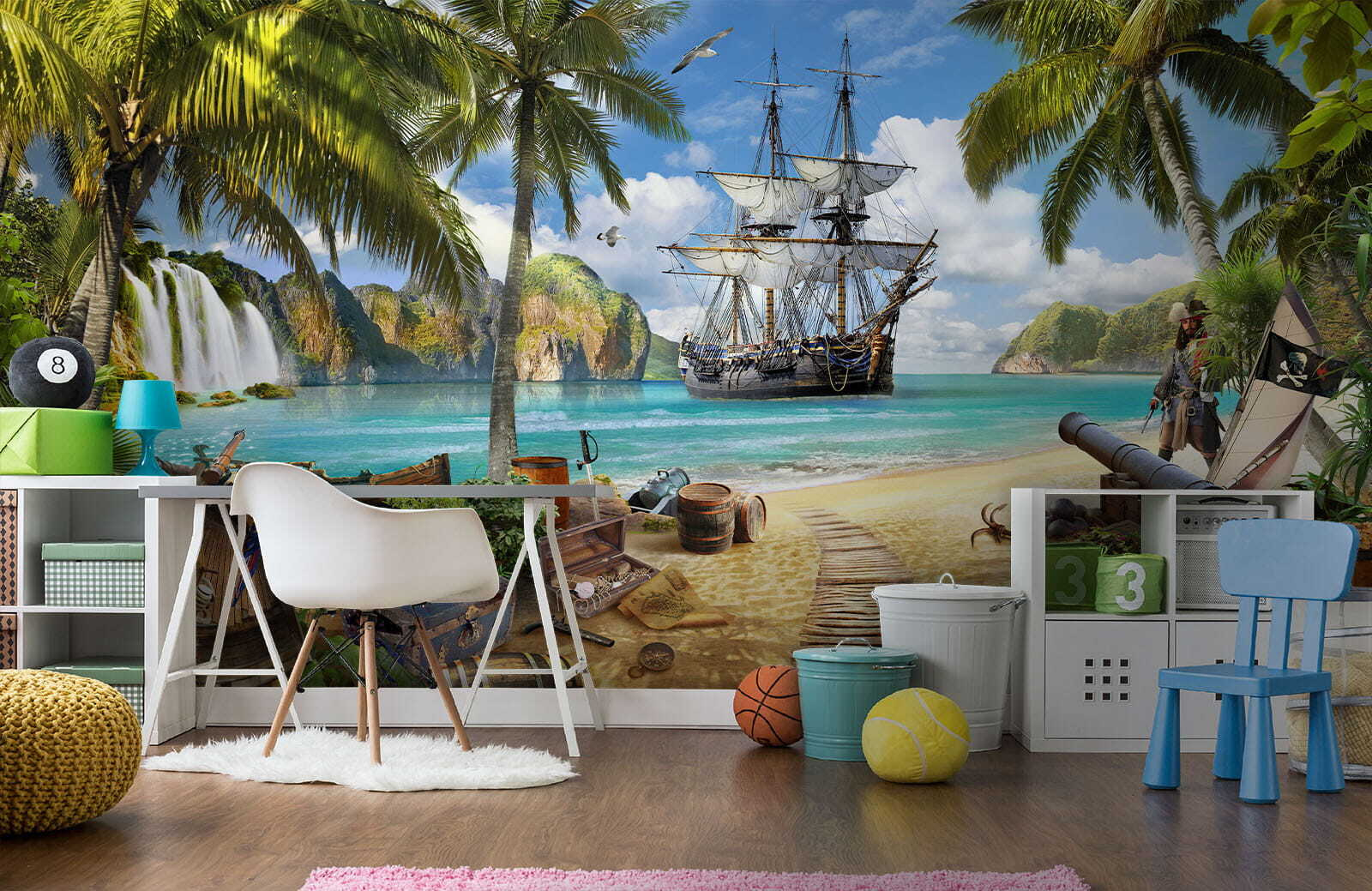 Μεταμορφώστε οποιονδήποτε χώρο σε έναν ηλιόλουστο παράδεισο με την τοιχογραφία “Ταπετσαρίες Pirate Ship Anchored by Tropical Paradise”. Φανταστείτε να μπαίνετε σε έναν κόσμο όπου η θαλασσινή αύρα χτενίζει απαλά το πρόσωπό σας και οι ζωντανές φοινικιές λικνίζονται από πάνω. Αυτή η τοιχογραφία ζωντανεύει μια εκπληκτική σκηνή – ένα περιπετειώδες πειρατικό πλοίο αγκυροβολημένο κοντά σε κρυστάλλινα νερά, περιτριγυρισμένο από θησαυρούς και πλούσια φύση. Τα παιδιά θα νιώσουν σαν να είναι μέρος μιας περιπέτειας που ξεφαντώνει, εξερευνώντας κρυμμένους θησαυρούς και μυστικά νησιά. Είναι κάτι περισσότερο από απλή διακόσμηση- είναι μια σπίθα για δημιουργικότητα, εμπνευσμένες ιστορίες και ατελείωτες ονειροπολήσεις. Ποιος δεν θα ήθελε να σαλπάρει μακριά κάθε φορά που ρίχνει μια ματιά στον τοίχο του; Ιδανική για παιδικά δωμάτια ή υπνοδωμάτια, αυτή η τοιχογραφία δημιουργεί μια γοητευτική απόδραση που σίγουρα θα κάνει όλους να χαμογελάσουν. Αφήστε τη φαντασία να σαλπάρει!