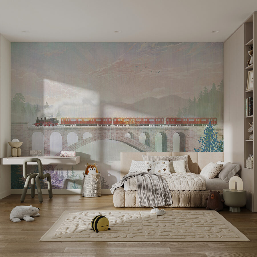 Φανταστείτε το εξής: μπαίνοντας σε ένα δωμάτιο με αυτή την τοιχογραφία, “Bridge over a River”, είναι σαν να μεταφέρεστε σε μια σκηνή βγαλμένη κατευθείαν από μια παλιά ταξιδιωτική καρτ ποστάλ. Φανταστείτε ένα άνετο απόγευμα, πίνοντας τσάι, με αυτή τη σκηνή να κάνει τους τοίχους να βουίζουν σχεδόν από νοσταλγία. Η γοητευτική γέφυρα και το τρένο που τρέχει δημιουργούν μια γαλήνια, σχεδόν παραμυθένια ατμόσφαιρα – ιδανική για όσους επιθυμούν μια πινελιά περιπέτειας από την άνεση του σπιτιού. Δεν είναι απλώς μια τοιχογραφία, είναι μια πρόσκληση για ονειροπόληση. Τα απαλά παστέλ χρώματα και τα ομιχλώδη πεύκα προσθέτουν ένα ηρεμιστικό σκηνικό, κάνοντάς το να αισθάνεστε σαν να ακούτε σχεδόν τα πουλιά να κελαηδούν και να μυρίζετε τη φρέσκια πρωινή δροσιά. Είτε είστε φανατικός λάτρης της διακόσμησης είτε απλά κάποιος που εκτιμά τις μικρές μαγικές στιγμές, αυτή η τοιχογραφία φέρνει έναν αέρα διαχρονικής ταξιδιωτικής γοητείας κατευθείαν στο χώρο σας. Βάλτε δυνατά τις αγαπημένες σας μουσικές, ρίξτε μια ματιά σε αυτή την τοιχογραφία και αφήστε την να σας ταξιδέψει σε αυτή την ειρηνική γέφυρα κάθε μέρα.