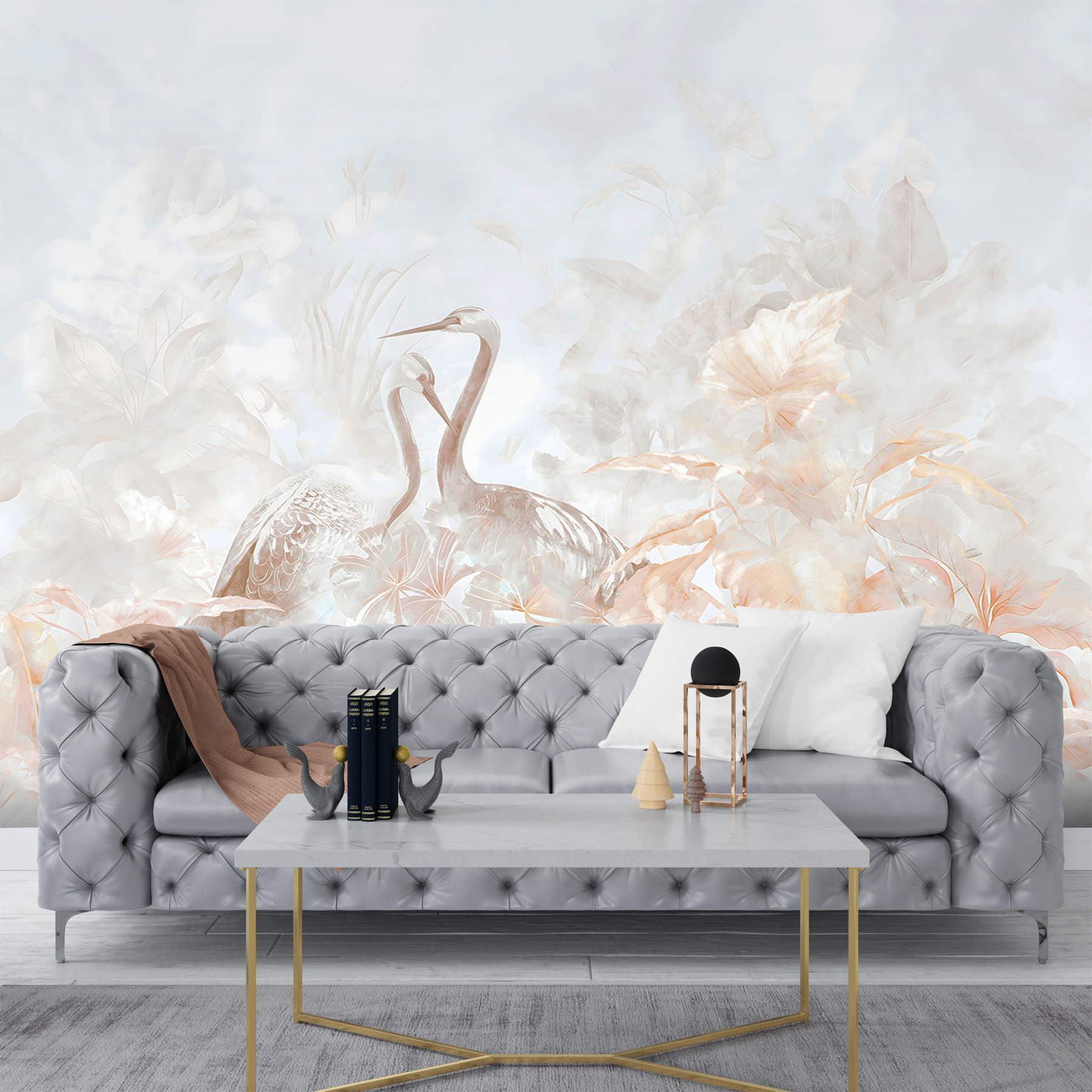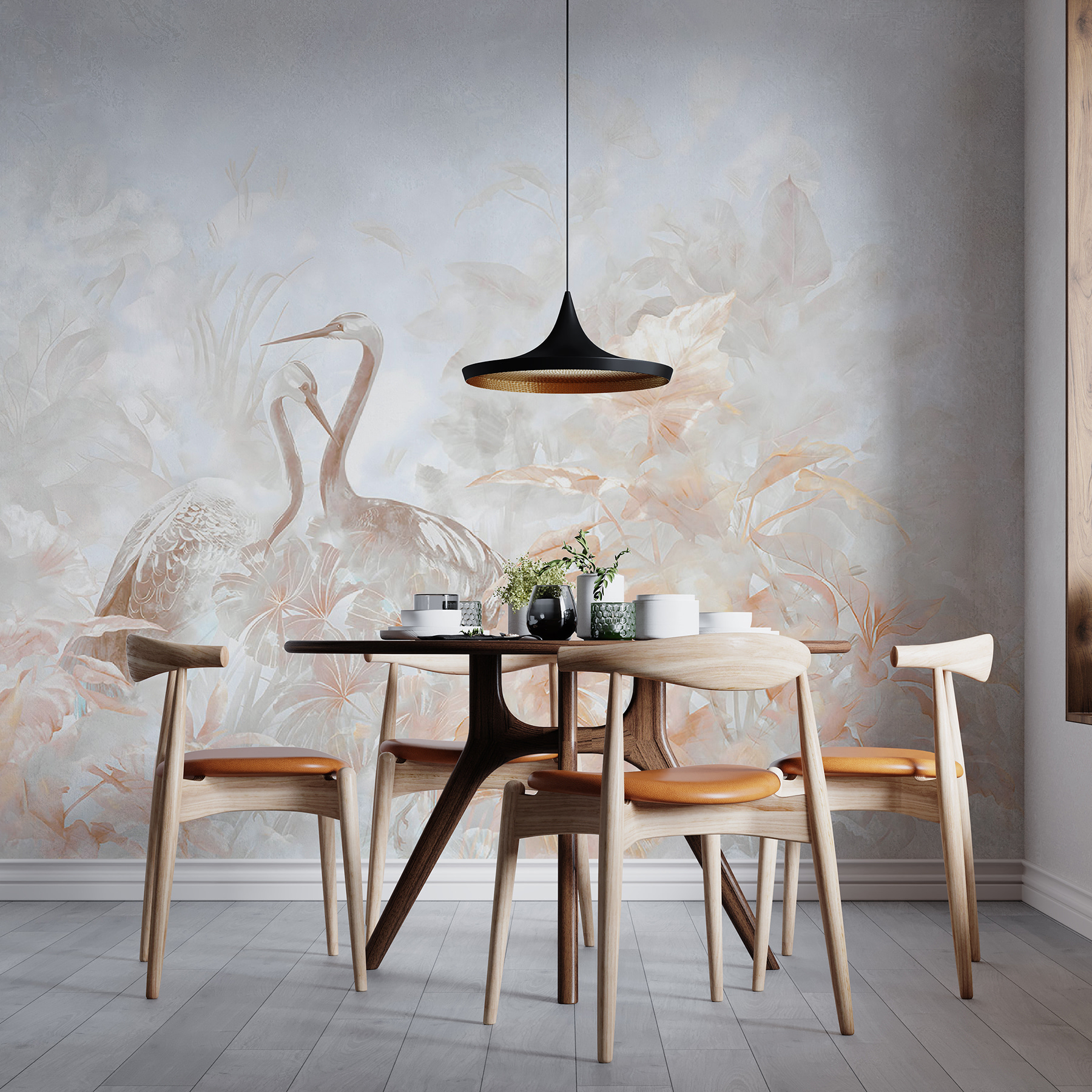 Φανταστείτε να έχετε μια γαλήνια απόδραση ακριβώς στον τοίχο σας με την τοιχογραφία “Γερανοί ανάμεσα σε πλούσια φυλλώματα”. Δεν πρόκειται απλώς για διακόσμηση, αλλά για μια ολόκληρη διάθεση – τέλεια για όποιον λατρεύει λίγη από την κομψότητα της φύσης στο εσωτερικό του. Δύο χαριτωμένοι γερανοί σμίγουν ανάμεσα σε μια θάλασσα από απαλά φύλλα, δημιουργώντας μια εκπληκτική και ήρεμη ατμόσφαιρα. Τα απαλά χρώματα το κάνουν να μοιάζει με ένα ονειρικό, ομιχλώδες πρωινό σε κάποιο εξωτικό μέρος (χωρίς ποτέ να χρειάζεται να επιβιβαστείτε σε αεροπλάνο). Είναι σαν να πατάτε το κουμπί παύσης στη ζωή και να αναπνέετε σε έναν δροσερό, αναζωογονητικό κήπο. Αυτή η τοιχογραφία αποτελεί ένα ωραίο κεντρικό κομμάτι για το σαλόνι σας ή ακόμη και για ένα ήσυχο υπνοδωμάτιο. Θέλετε μια καθημερινή δόση ζεν; Αυτή η τοιχογραφία σας καλύπτει. Επιπλέον, είναι βέβαιο ότι θα αποτελέσει αφορμή για συζήτηση – ποιος δεν θα ήθελε να συνομιλήσει για μια τόσο ειρηνική, όμορφη σκηνή ακριβώς στο σπίτι σας;
