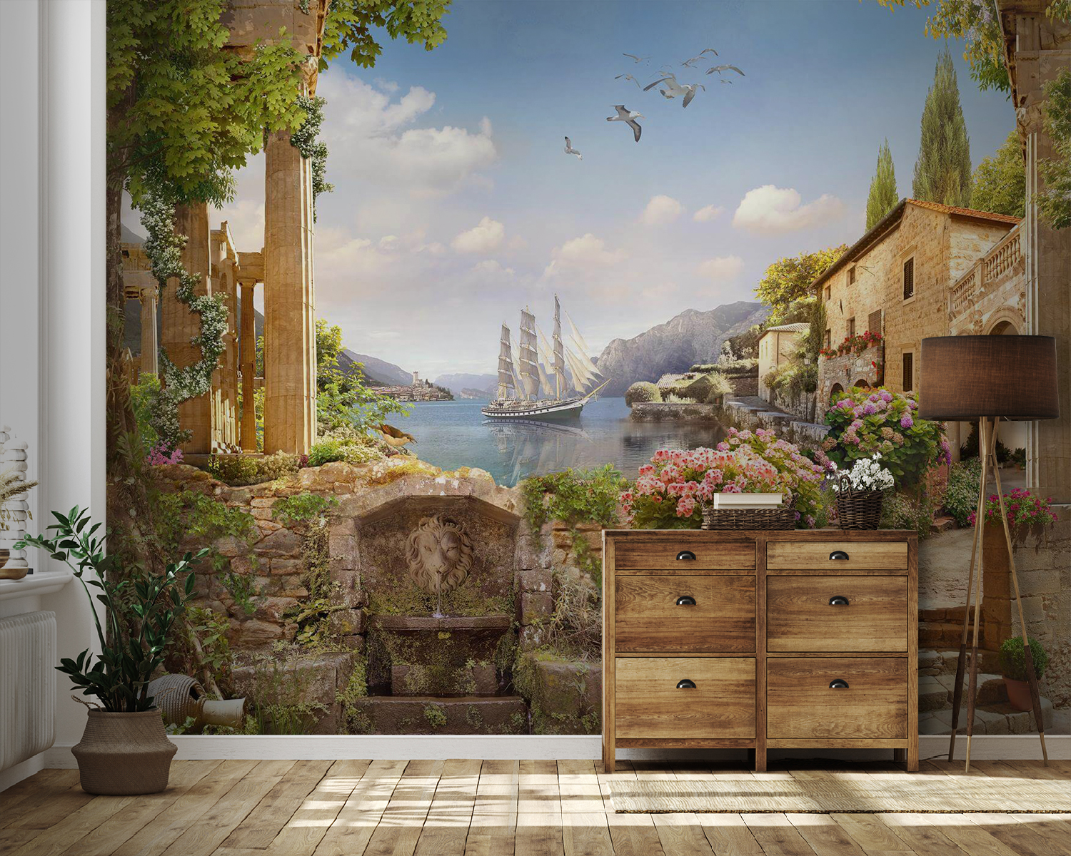 Μπείτε σε μια ονειρεμένη απόδραση με αυτή την εκπληκτική τοιχογραφία τοίχου με ένα πέτρινο κτίριο που βρίσκεται δίπλα σε γαλήνια νερά. Φανταστείτε το: ηλιόλουστες μέρες και απαλό αεράκι, καθώς ένα χαριτωμένο σκάφος γλιστρά δίπλα σας, ενώ πολύχρωμα λουλούδια ξεχειλίζουν στις άκρες της γερασμένης πέτρας. Η ατμόσφαιρα; Καθαρή ηρεμία. Αυτή η τοιχογραφία φέρνει ένα κομμάτι της φύσης στους εσωτερικούς χώρους, κάνοντας κάθε δωμάτιο να μοιάζει με μια ζεστή απόδραση. Οι φίλοι σας μπορεί ακόμη και να ρωτήσουν αν μετατρέψατε το χώρο σας σε μια γοητευτική παραθαλάσσια απόδραση! Είναι ιδανικό για να προκαλέσει αυτά τα συναισθήματα της περιπλάνησης, ενώ είστε άνετα στο σπίτι σας. Μεταμορφώστε τους τοίχους σας και αφήστε την περιπέτεια να ξεκινήσει!