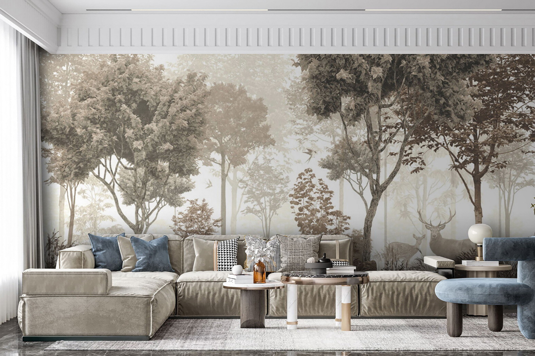 Φανταστείτε το στο σαλόνι σας ή ακόμα και σε μια ζεστή γωνιά ανάγνωσης – είναι βέβαιο ότι θα σας προκαλέσει γαλήνια, ονειρική ατμόσφαιρα. Επιπλέον, αυτά τα απαλά, ουδέτερα χρώματα είναι τόσο ηρεμιστικά. Αισθάνεστε σαν μια βαθιά ανάσα φρέσκου δασικού αέρα. Είτε είστε λάτρης της φύσης είτε κάποιος που θέλει απλώς να προσθέσει μια ήρεμη πινελιά στο χώρο του, αυτή η τοιχογραφία κάνει τη δουλειά της υπέροχα.