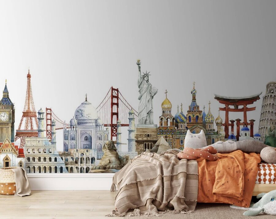 Μεταμορφώστε έναν κενό τοίχο σε μια ονειρεμένη απόδραση με αυτή τη ζωντανή τοιχογραφία ακουαρέλας με εμβληματικά ορόσημα. Φανταστείτε να απολαμβάνετε τον καφέ σας ατενίζοντας τον Πύργο του Άιφελ ή να ονειρεύεστε το Ταζ Μαχάλ – αυτή η τοιχογραφία προσκαλεί κάθε επισκέπτη να εξερευνήσει τα θαύματα του κόσμου από το σπίτι του. Κάθε πινελιά αιχμαλωτίζει το πνεύμα του ταξιδιού, κάνοντάς το να μοιάζει με μια μικρή περιπέτεια στο σαλόνι σας. Αυτή η τοιχογραφία δεν είναι απλώς διακόσμηση- πυροδοτεί ιστορίες και ζεστές αναμνήσεις. Ιδανική για τις ταξιδιάρες ψυχές ή για όποιον απλώς αγαπάει μια καλή οπτική γιορτή – είναι σαν μια ανοιχτή πρόσκληση για εξερεύνηση!