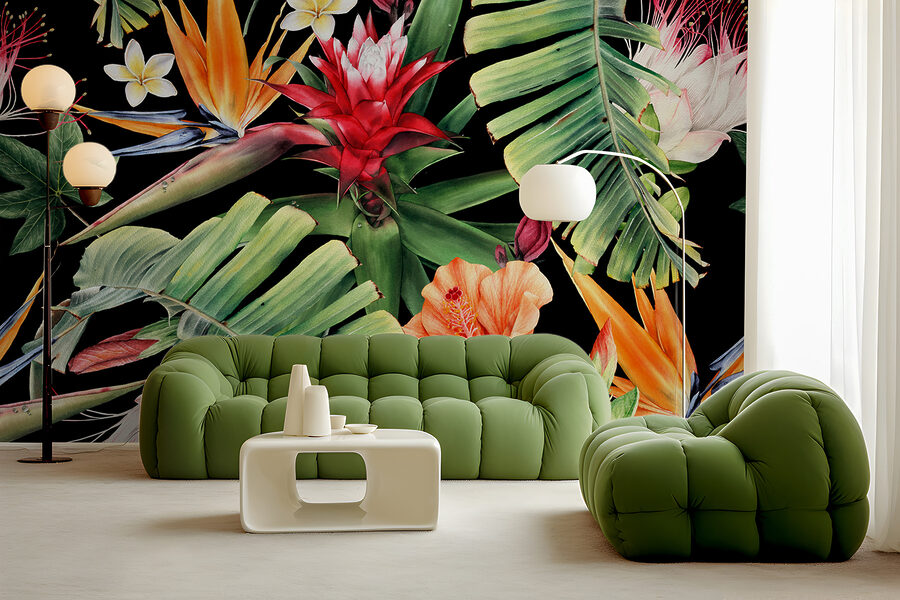 Μεταμορφώστε το χώρο σας σε έναν τροπικό παράδεισο με αυτή τη ζωντανή τοιχογραφία. Φανταστείτε να μπαίνετε σε μια ζούγκλα με έντονα χρώματα, όπου φλεγόμενα κόκκινα άνθη αναμειγνύονται με πλούσια φύλλα, όλα σε ένα κομψό μαύρο φόντο. Είναι σαν να φέρνετε ένα μικρό κομμάτι από μια ηλιόλουστη απόδραση στο σαλόνι σας. Οι φίλοι σας θα περάσουν από εκεί και θα νομίζουν ότι είστε επαγγελματίας διακοσμητής – ή ίσως απλά κρυφός βοτανολόγος! Επιπλέον, τα χαρούμενα λουλούδια μπορούν να ανεβάσουν κάθε διάθεση, δημιουργώντας μια χαρούμενη, φιλόξενη ατμόσφαιρα. Είναι τέλειο για έναν τοίχο προφοράς ή για εκείνο το σημείο που χρειάζεται μια πνοή προσωπικότητας. Ποιος δεν θα ήθελε να αισθάνεται σαν να βρίσκεται σε διακοπές κάθε μέρα; Βυθιστείτε σε αυτό το ζωντανό μοτίβο και δείτε τους τοίχους σας να ζωντανεύουν!