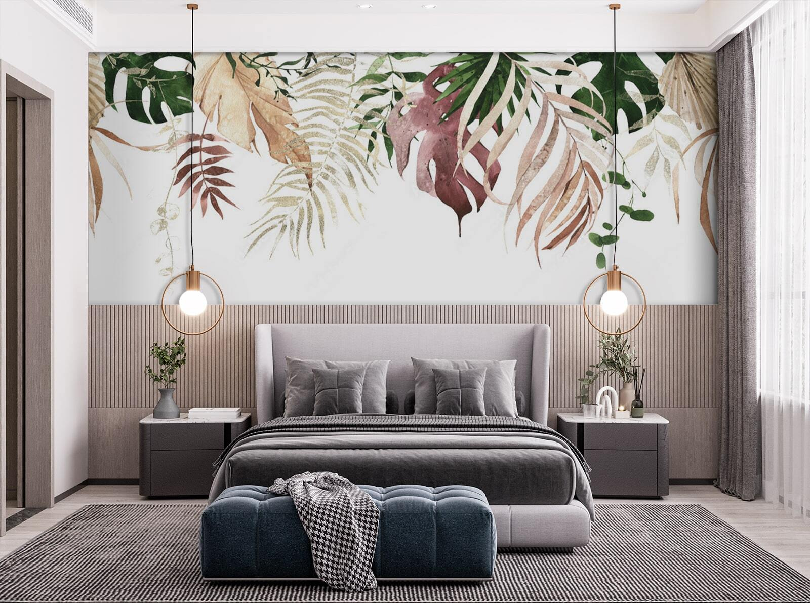 Ευχηθήκατε ποτέ το σαλόνι σας να έμοιαζε περισσότερο με ηλιόλουστο καταφύγιο ζούγκλας; Γνωρίστε την τοιχογραφία “Τροπικά φύλλα σε γήινους τόνους”. Είναι σαν κάποιος να μάζεψε τα ωραιότερα φύλλα από ένα τροπικό δάσος, να τα βούτηξε σε γαλήνιες, φυσικές αποχρώσεις, και ιδού – στιγμιαία ηρεμία στον τοίχο σας. Φανταστείτε να πίνετε καφέ, να αισθάνεστε ζεν, περιτριγυρισμένοι από αυτά τα απαλά, ζεστά χρώματα. Είτε είστε κάτοικος της πόλης που επιθυμεί μια ιδέα από τη φύση, είτε απλά κάποιος που εκτιμά μια καλή στιγμή με φύλλα, αυτή η τοιχογραφία έχει μια χαλαρή ατμόσφαιρα που μεταμορφώνει κάθε χώρο σε μια ζεστή, φυλλώδη απόδραση.