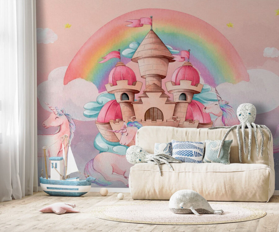 Οι απολαυστικές λεπτομέρειες -όπως το καλάθι με τα τρόφιμα που ένας μονόκερος μεταφέρει άνετα- προσθέτουν μια παιχνιδιάρικη πινελιά που εξάπτει τη φαντασία. Θα μπορούσε κανείς να φανταστεί ένα ονειρεμένο πάρτι τσαγιού ακριβώς δίπλα στο κάστρο, κάτω από έναν ουρανό γεμάτο αστέρια που λαμπυρίζουν και χνουδωτά σύννεφα. Τα απαλά παστέλ χρώματα ζεσταίνουν την καρδιά, καθιστώντας την τοιχογραφία ένα ζεστό και φιλόξενο κεντρικό κομμάτι. Δεν είναι απλώς διακόσμηση τοίχου- είναι μια πύλη για ονειροπολήσεις και περιπέτειες.