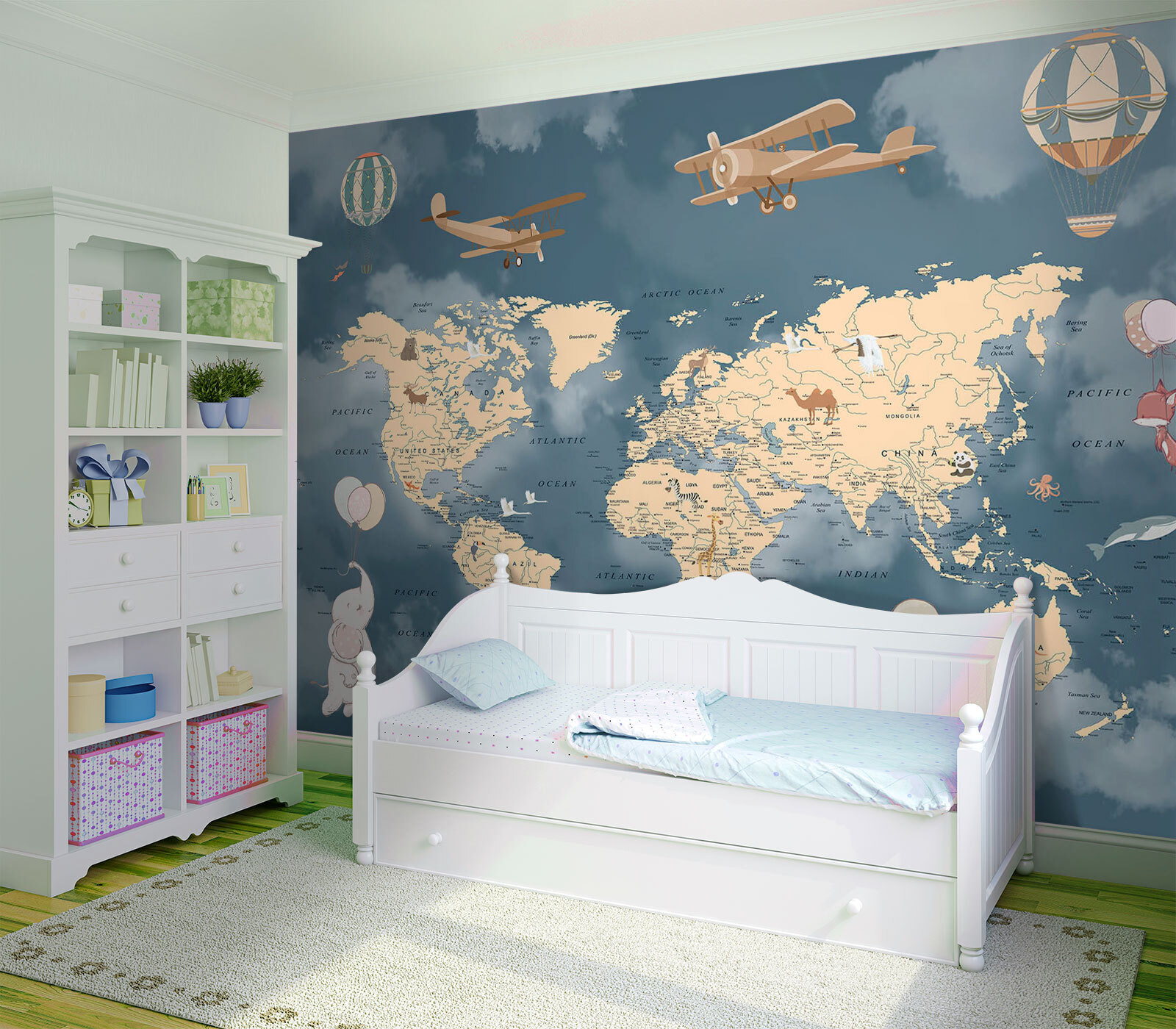 Ονειρευτήκατε ποτέ να πετάξετε στους ουρανούς με ένα αερόστατο, αλλά, ξέρετε, στην άνεση του σπιτιού σας; Λοιπόν, αυτή η τοιχογραφία τοίχου σας καλύπτει. Η τοιχογραφία “Hot Air Balloon in the Sky” μεταμορφώνει έναν απλό τοίχο σε έναν ιδιόρρυθμο παγκόσμιο χάρτη, με αιωρούμενα μπαλόνια και γοητευτικά ζώα που κρέμονται πάνω του. Είναι σαν μια μίνι περιπέτεια για τα παιδιά -και ειλικρινά, σας κάνει να θέλετε να τα ακολουθήσετε, σωστά; Ιδανικό για να κεντρίσετε την περιέργεια και να δώσετε σε κάθε δωμάτιο μια παιχνιδιάρικη, ονειρική ατμόσφαιρα. Φανταστείτε ιστορίες για ύπνο ή παιχνίδι με αυτό το σκηνικό – άπειρες δυνατότητες! Κάνει τα μαθήματα γεωγραφίας να μοιάζουν με ταξίδια σε όλο τον κόσμο. Οι εξερευνητές όλων των ηλικιών θα το λατρέψουν.