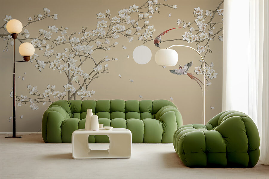 Ετοιμαστείτε να μεταμορφώσετε το χώρο σας με την τοιχογραφία “Ταπετσαρίες Bird Flying in the Air”. Φανταστείτε τη γαλήνια ομορφιά της φύσης ακριβώς στο σαλόνι σας – λεπτεπίλεπτα κλαδιά δέντρων στολισμένα με απαλά άνθη και δύο πουλιά που πετούν χαρούμενα σε ένα ηρεμιστικό φόντο. Ιδανική για να προσθέσετε μια πινελιά ηρεμίας και κομψότητας σε οποιοδήποτε δωμάτιο, αυτή η τοιχογραφία φέρνει αβίαστα την ύπαιθρο μέσα.