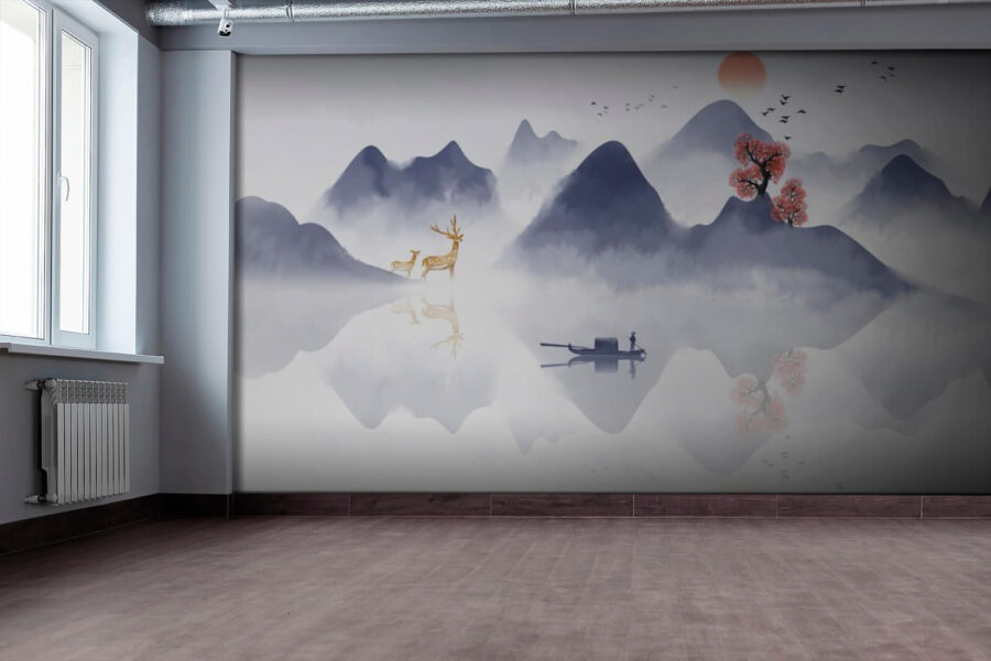 Μεταμορφώστε οποιοδήποτε δωμάτιο σε ένα γαλήνιο καταφύγιο με αυτή την εκπληκτική ταπετσαρία τοίχου. Με ένα ήρεμο σκάφος που γλιστρά μέσα από ένα ομιχλώδες δάσος, περιτριγυρισμένο από επιβλητικά βουνά και ζωντανά δέντρα, σας προσκαλεί να ονειρευτείτε λίγο. Φανταστείτε να πίνετε τον καφέ σας ενώ ο ήλιος ανατέλλει στον ορίζοντα, ρίχνοντας απαλές αποχρώσεις στο νερό. Είναι σαν να κάνετε μίνι διακοπές κάθε φορά που περνάτε από μπροστά της. Ιδανική για εκείνες τις ζεστές γωνιές ή ένα γραφείο που χρειάζεται λίγη ζεν ατμόσφαιρα. Επιπλέον, υπάρχει και ένα ελάφι – γιατί ποιος δεν θα ήθελε να παρατηρήσει τη φύση χωρίς να βγει από το σπίτι; Αγκαλιάστε αυτή τη φυσική γοητεία!