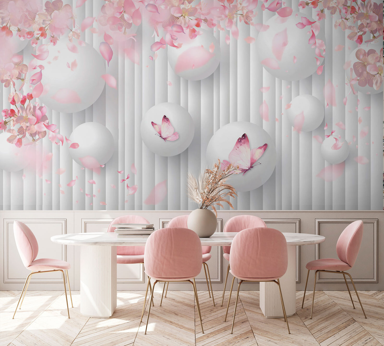 Μεταμορφώστε αυτόν τον απλό τοίχο σε ένα έργο τέχνης με αυτήν την υπέροχη τοιχογραφία, που απεικονίζει έναν φανταστικό χορό λευκών σφαιρών στολισμένων με γοητευτικές ροζ πεταλούδες. Φανταστείτε να πίνετε τον πρωινό σας καφέ σε έναν χώρο που μοιάζει με έναν γαλήνιο ιαπωνικό κήπο, όπου κάθε ματιά στον τοίχο σας προσφέρει μια μικρή έκρηξη χαράς. Τα απαλά πέταλα που πετούν γύρω σας προκαλούν την ευχάριστη αίσθηση της άνοιξης, φέρνοντας μια ζεστή, χαρούμενη ατμόσφαιρα. Είναι σαν να έχετε τη φύση μέσα στο σπίτι, χωρίς την αλλεργία στη γύρη! Ιδανική για κάθε δωμάτιο που χρειάζεται μια πινελιά ηρεμίας και δημιουργικότητας — απλά ετοιμαστείτε για τα κομπλιμέντα που θα σας κατακλύσουν! Αυτή η ταπετσαρία δεν είναι απλά διακόσμηση, είναι κάτι που σας ανεβάζει τη διάθεση.