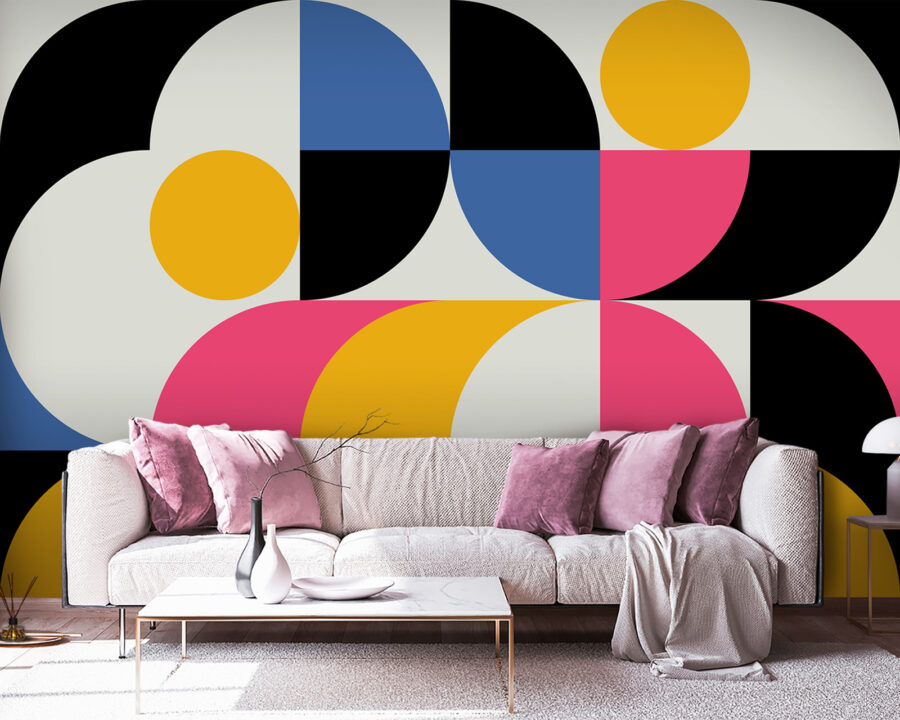Δείτε αυτή τη ζωντανή τοιχογραφία με τίτλο “Κίτρινος κύκλος με γκρι φόντο”. Είναι σαν ένα μουσείο μοντέρνας τέχνης να αποφάσισε να μετακομίσει στο σπίτι σας! Οι τολμηροί κίτρινοι κύκλοι ξεπροβάλλουν στο γκρι, δημιουργώντας ένα εκπληκτικό εστιακό σημείο. Προσθέστε πιτσιλιές μπλε, ροζ και μαύρου χρώματος και έχετε ένα πάρτι στον τοίχο σας, σαν κομφετί που έχει παγώσει στο χρόνο.