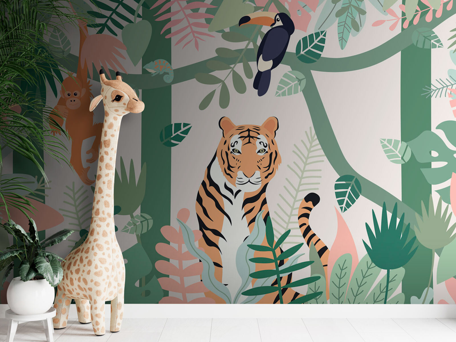 Αυτή η τοιχογραφία τοίχου μοιάζει με όνειρο ζούγκλας. Απαλά, παστέλ φύλλα πλαισιώνουν τη σκηνή, δημιουργώντας ένα χαλαρωτικό σκηνικό για τους πολύχρωμους χαρακτήρες. Φανταστείτε τα παιδιά σας να ξυπνούν και να νιώθουν ότι βρίσκονται σε ένα τροπικό δάσος ή να λένε παραμύθια για ύπνο κάτω από αναρριχώμενα αμπέλια και άγρια ζώα που κρυφοκοιτάζουν. Δεν είναι απλώς διακοσμητικό – δημιουργεί το σκηνικό για τη φαντασία και τη χαρά. Ιδανικό για να κεντρίσετε τη δημιουργικότητα και να κάνετε τις βροχερές μέρες μέσα στο σπίτι λίγο πιο μαγικές. Απλά ένα αριστούργημα για το δωμάτιο κάθε μικρού εξερευνητή!