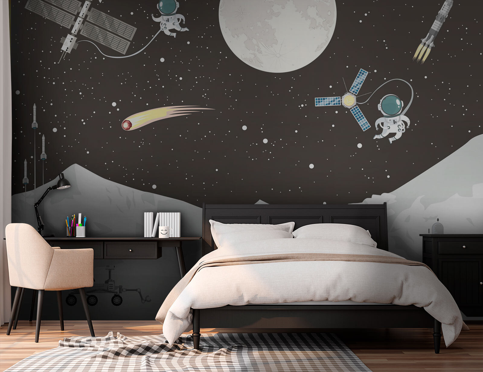 Ονειρευτήκατε ποτέ να περιπλανηθείτε ανάμεσα στα αστέρια; Λοιπόν, αυτή η τοιχογραφία τοίχου “Πανσέληνος στον ουρανό” μπορεί να ζωντανέψει αυτό το κοσμικό όνειρο. Ιδανική για ονειροπόλους, νυχτοπούλια και λάτρεις του διαστήματος, μετατρέπει κάθε δωμάτιο σε γαλαξιακή απόδραση. Φανταστείτε να επιστρέφετε στο σπίτι μετά από μια κουραστική μέρα, να πέφτετε στον καναπέ σας και να νιώθετε ότι έχετε μια θέση στην πρώτη σειρά για το σύμπαν. Είναι σαν μια νυχτερινή απόδραση, χωρίς το διαστημόπλοιο! Σεληνιασμένα βουνά, αστροναύτες που αιωρούνται – όλα είναι εδώ, δίνοντας μια ατμόσφαιρα που είναι ταυτόχρονα περιπετειώδης και ηρεμιστική. Ιδανικό για παιδικό δωμάτιο, ο χώρος μπορεί να εμπνεύσει ακόμα και έναν ή δύο μελλοντικούς αστροναύτες! Είναι μια παιχνιδιάρικη αλλά και γαλήνια προσθήκη σε κάθε τοίχο, που εξάπτει τη φαντασία και την αίσθηση του θαύματος.