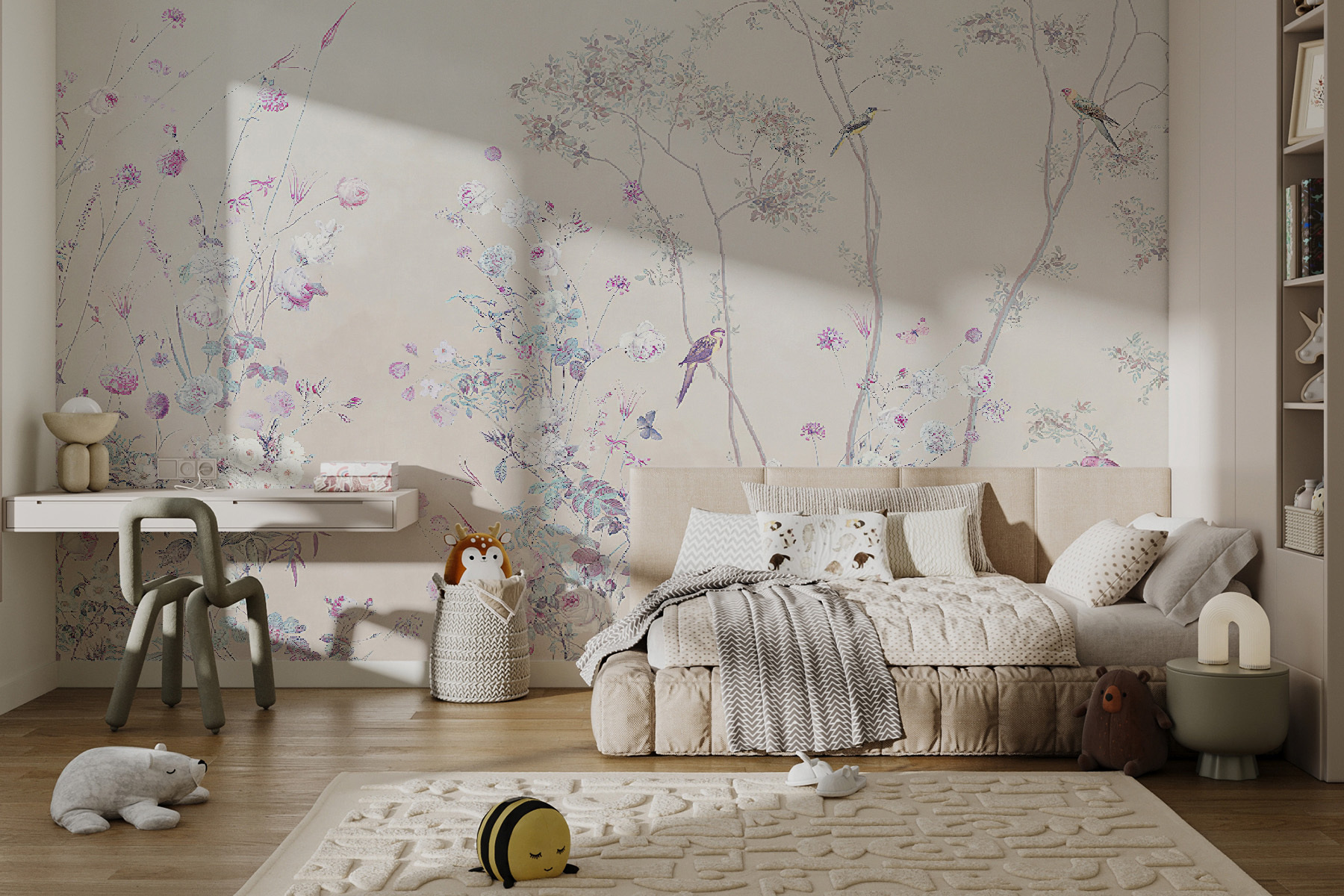 Αυτή η τοιχογραφία, “Παστέλ λουλούδια και πουλιά σε αρμονία”, είναι σαν μια απαλή, ονειρική μελωδία για τους τοίχους σας. Φανταστείτε να γεμίζετε το χώρο σας με άνθη και ντελικάτα πουλιά, όλα σε ηρεμιστικές παστέλ αποχρώσεις. Είναι ιδανική για όποιον αγαπά την ομορφιά της φύσης και θέλει να φέρει μια πινελιά από την ύπαιθρο μέσα στο σπίτι χωρίς να έχει να κάνει, ξέρετε, με πραγματική βρωμιά ή έντομα. Θα μπορούσε να είναι ό,τι πρέπει για να μεταμορφώσει ένα βαρετό δωμάτιο σε ένα γλυκό μικρό καταφύγιο. Τα απαλά χρώματα και η καταπραϋντική σκηνή μπορεί να σας κάνουν να νιώσετε σαν να βρίσκεστε σε έναν μαγεμένο κήπο. Ιδανικό για ένα υπνοδωμάτιο ή μια ζεστή γωνιά ανάγνωσης όπου μπορείτε να ονειροπολήσετε το απόγευμα. Και ε, ποιος δεν θα ήθελε να ξυπνάει κάθε πρωί σε ένα χωράφι με λουλούδια και την ευγενική συντροφιά γραφικών μικρών πουλιών;