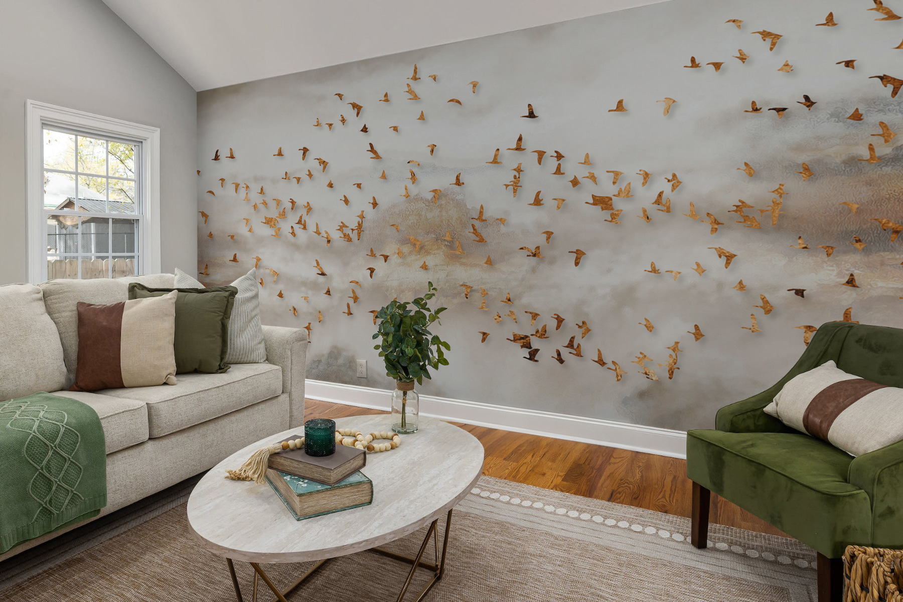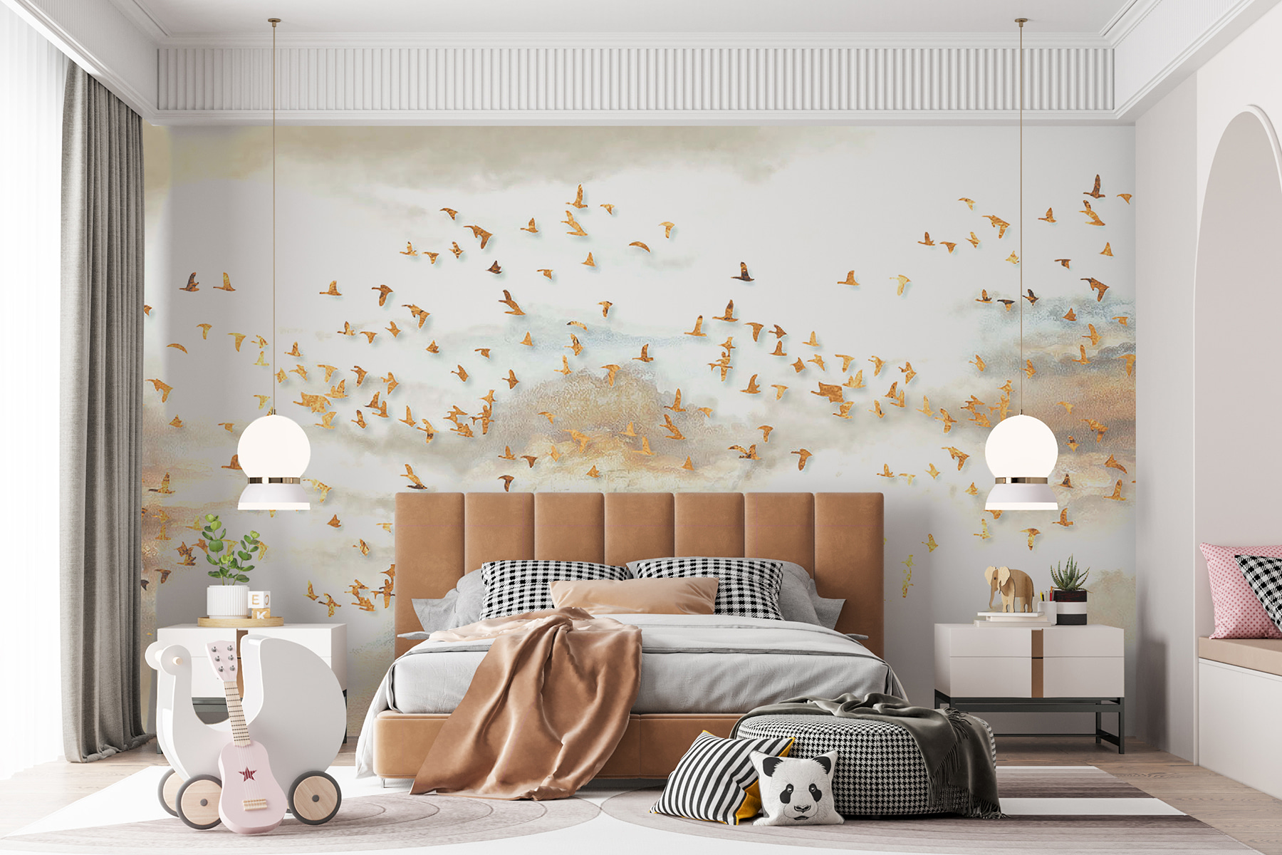 Μεταμορφώστε οποιοδήποτε δωμάτιο σε μια γαλήνια απόδραση με αυτή την εκπληκτική τοιχογραφία τοίχου με μια ομάδα πουλιών που πετούν σε έναν ονειρικό ουρανό. Τα απαλά χρώματα και τα χαριτωμένα πουλιά δημιουργούν μια ατμόσφαιρα που μοιάζει ήρεμη και ανεβαστική, όπως ένα φρέσκο αεράκι μια ανοιξιάτικη μέρα. Φανταστείτε να απολαμβάνετε τον πρωινό καφέ ή να χαλαρώνετε μετά από μια κουραστική μέρα κοιτάζοντας αυτή τη μαγευτική σκηνή. Σας προσελκύει, προκαλώντας ονειροπολήσεις και ιστορίες. Επιπλέον, προσθέτει μια κομψή πινελιά σε κάθε χώρο, είτε πρόκειται για ένα άνετο σαλόνι είτε για ένα ήρεμο υπνοδωμάτιο. Ποιος δεν θα ήθελε να αισθάνεται σαν να πετάει στα σύννεφα;