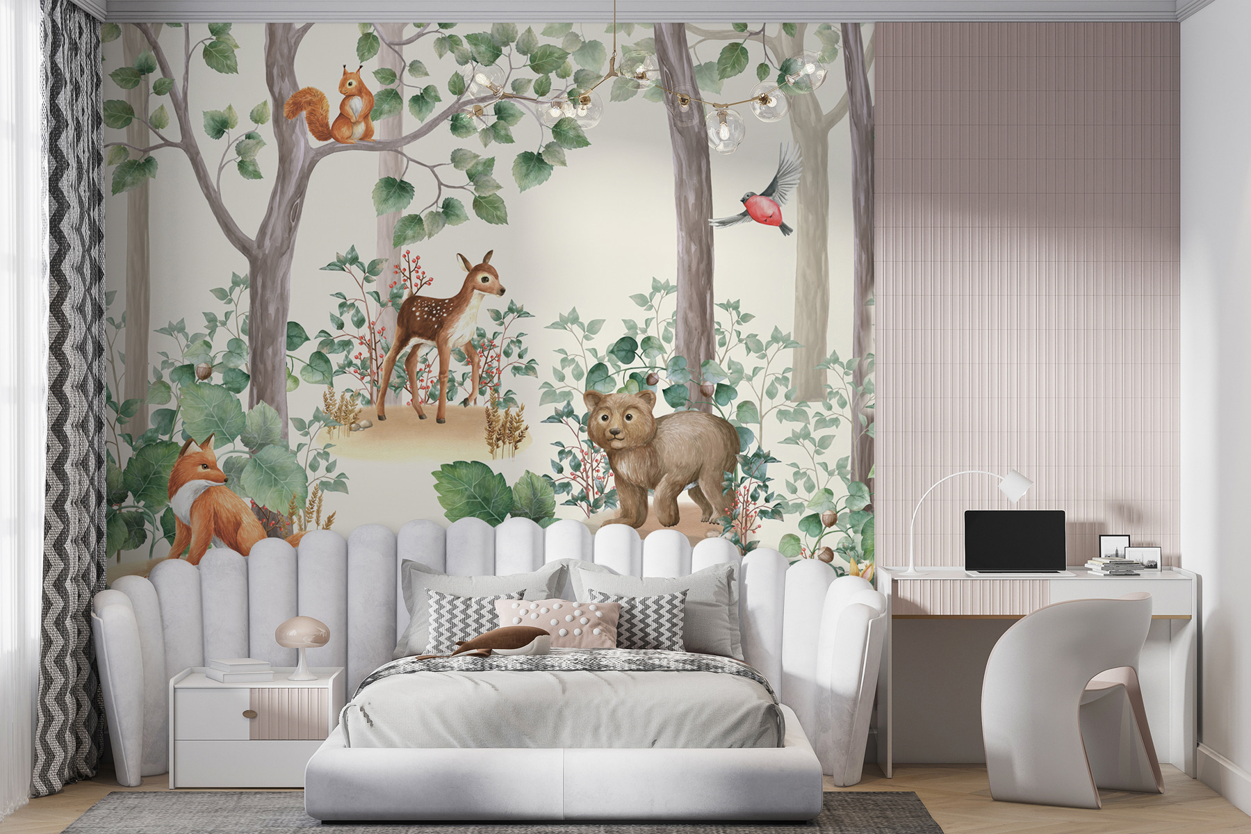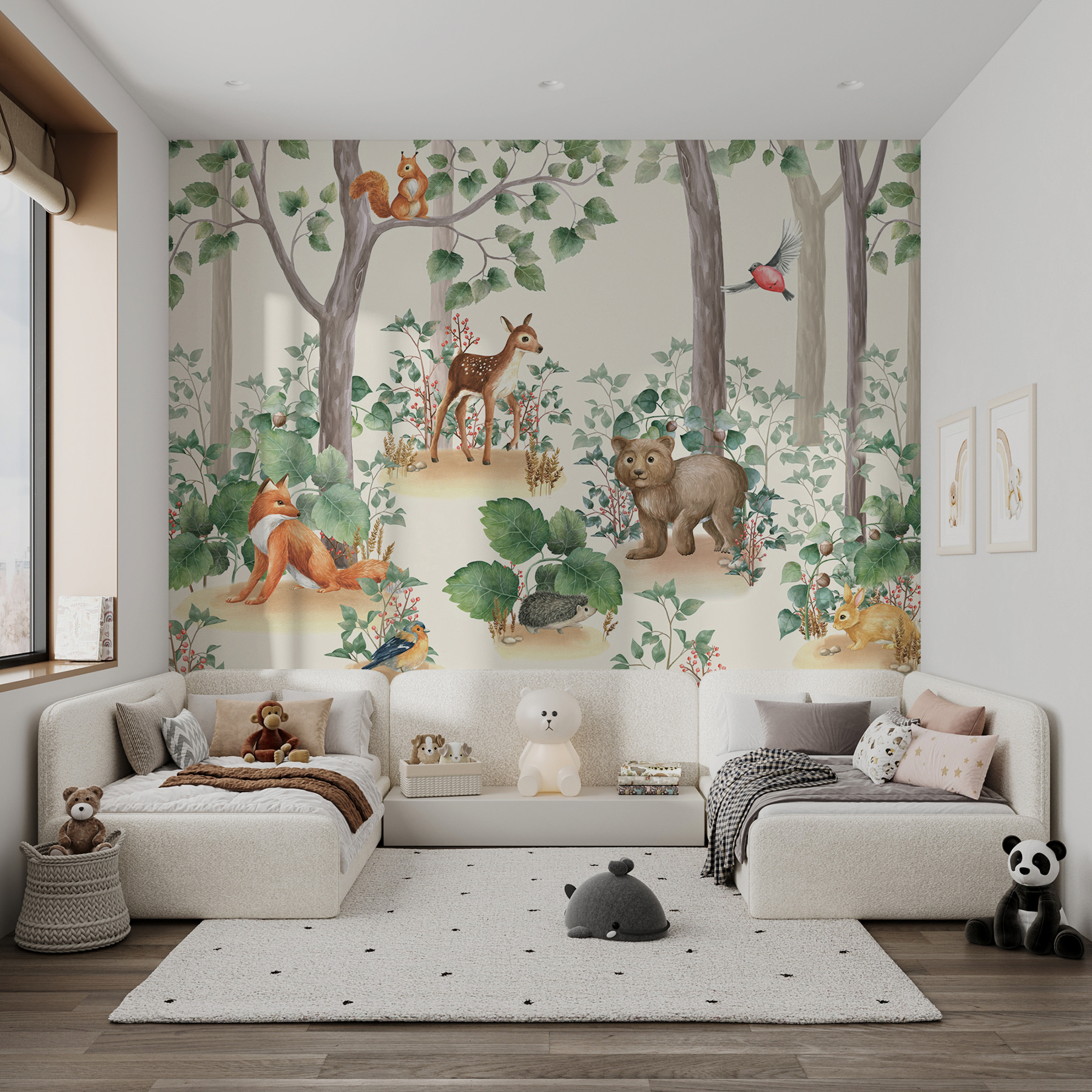 Επιπλέον, έχει μια ηρεμιστική ατμόσφαιρα με όλες αυτές τις αποχρώσεις του πράσινου και τα απαλά καφέ – ακριβώς ό,τι χρειάζεστε για να κάνετε το δωμάτιο να αισθάνεται φρέσκο και φιλόξενο. Φανταστείτε μόνο τις ιστορίες που θα μπορούσατε να σκαρφιστείτε με αυτούς τους χαρακτήρες! Δεν είναι απλώς μια τοιχογραφία, είναι μια ολόκληρη περιπέτεια στο δάσος που περιμένει να συμβεί!