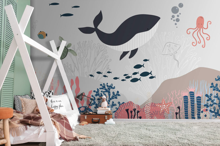 Ψάχνετε να προσθέσετε μια πινελιά διασκέδασης στο δωμάτιο του παιδιού σας; Δείτε τις “τοιχογραφίες τοίχου Φάλαινα και χελώνα κάτω από το νερό!” Αυτή η τοιχογραφία δεν είναι μόνο για τοίχους – είναι μια περιπέτεια κάτω από τη θάλασσα, μέσα στο σπίτι σας. Φανταστείτε μια χαρούμενη φάλαινα και μια περίεργη χελώνα, να κολυμπούν μαζί σε έναν πολύχρωμο υποβρύχιο κόσμο. Είναι ιδανική για να κεντρίσετε τη φαντασία των μικρών παιδιών και να δημιουργήσετε ιστορίες για τον ύπνο με περιπέτειες στον ωκεανό. Επιπλέον, δεν είναι υπερβολικά πολυάσχολη ή φωτεινή – μόνο μια απαλή παλέτα που καταπραΰνει και διασκεδάζει. Φανταστείτε τα μάτια του παιδιού σας να φωτίζονται όταν εντοπίζει το χταπόδι ή το κοπάδι ψαριών! Είναι σαν να έχετε ένα ενυδρείο χωρίς τη συντήρηση. Μια απολαυστική, παράξενη πινελιά για κάθε υπνοδωμάτιο ή παιδικό δωμάτιο. Βουτήξτε σε αυτή την τοιχογραφία και αφήστε την υποβρύχια μαγεία να ξεκινήσει!