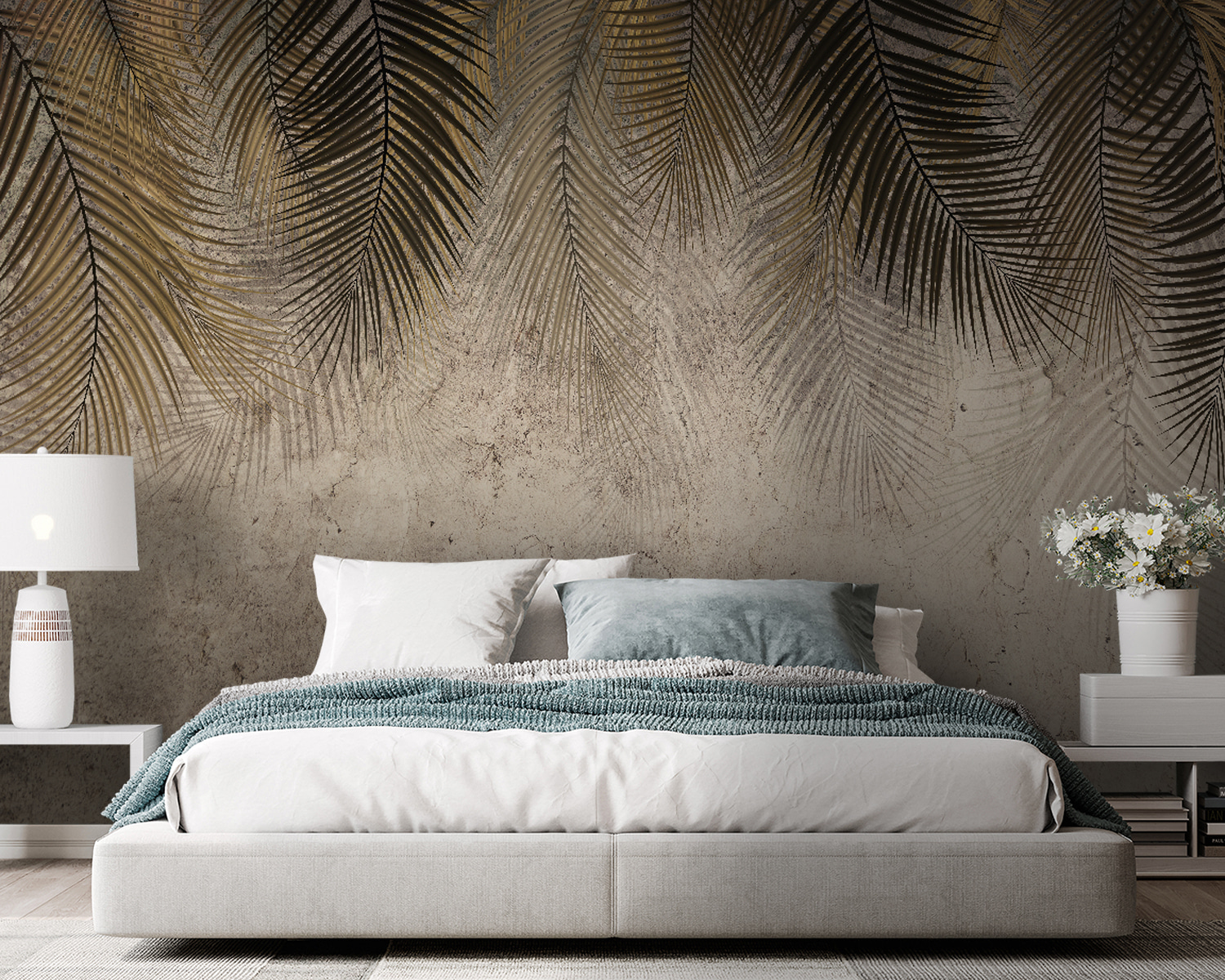 Μεταμορφώστε το χώρο σας με αυτή την τοιχογραφία με φύλλα φοίνικα σε έναν απαλό τοίχο. Είναι σαν να φέρνετε τη γαλήνη μιας τροπικής απόδρασης κατευθείαν στο σπίτι σας. Φανταστείτε να πίνετε καφέ σε μια ζεστή γωνιά, με αυτούς τους φυλλώδεις φίλους να ρίχνουν παιχνιδιάρικες σκιές καθ’ όλη τη διάρκεια της ημέρας. Η χρωματική παλέτα είναι ζεστή αλλά και αναζωογονητική, μια τέλεια υπενθύμιση για να χαλαρώσετε – κατά προτίμηση με λίγη ηλιοφάνεια. Είτε πρόκειται για το σαλόνι είτε για ένα γαλήνιο γραφείο, αυτή η τοιχογραφία προσκαλεί σε χαλάρωση και μια πινελιά περιπέτειας. Αφήστε τους φοίνικες να λικνιστούν στα όνειρά σας, ακόμα και τις πιο θλιβερές μέρες.