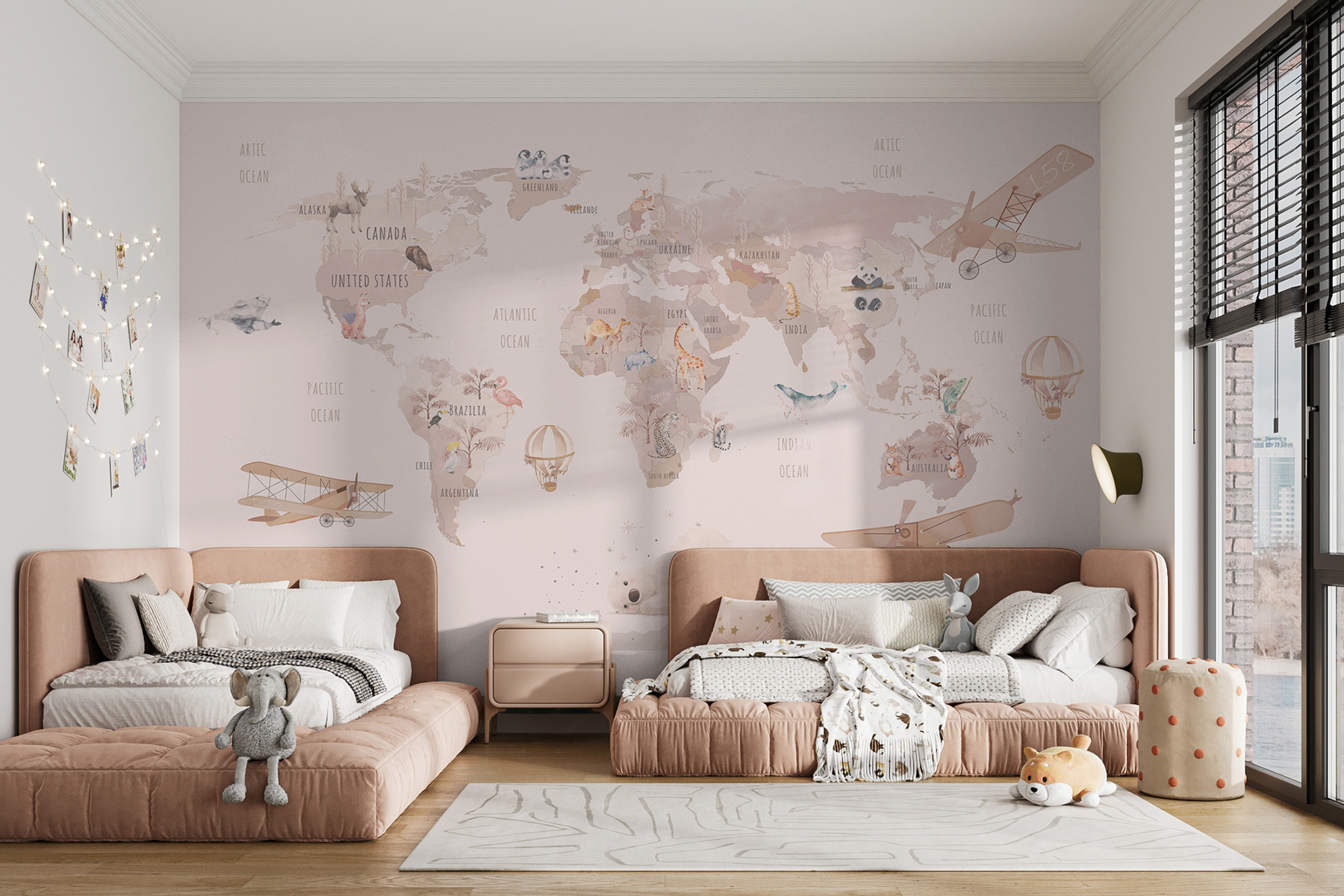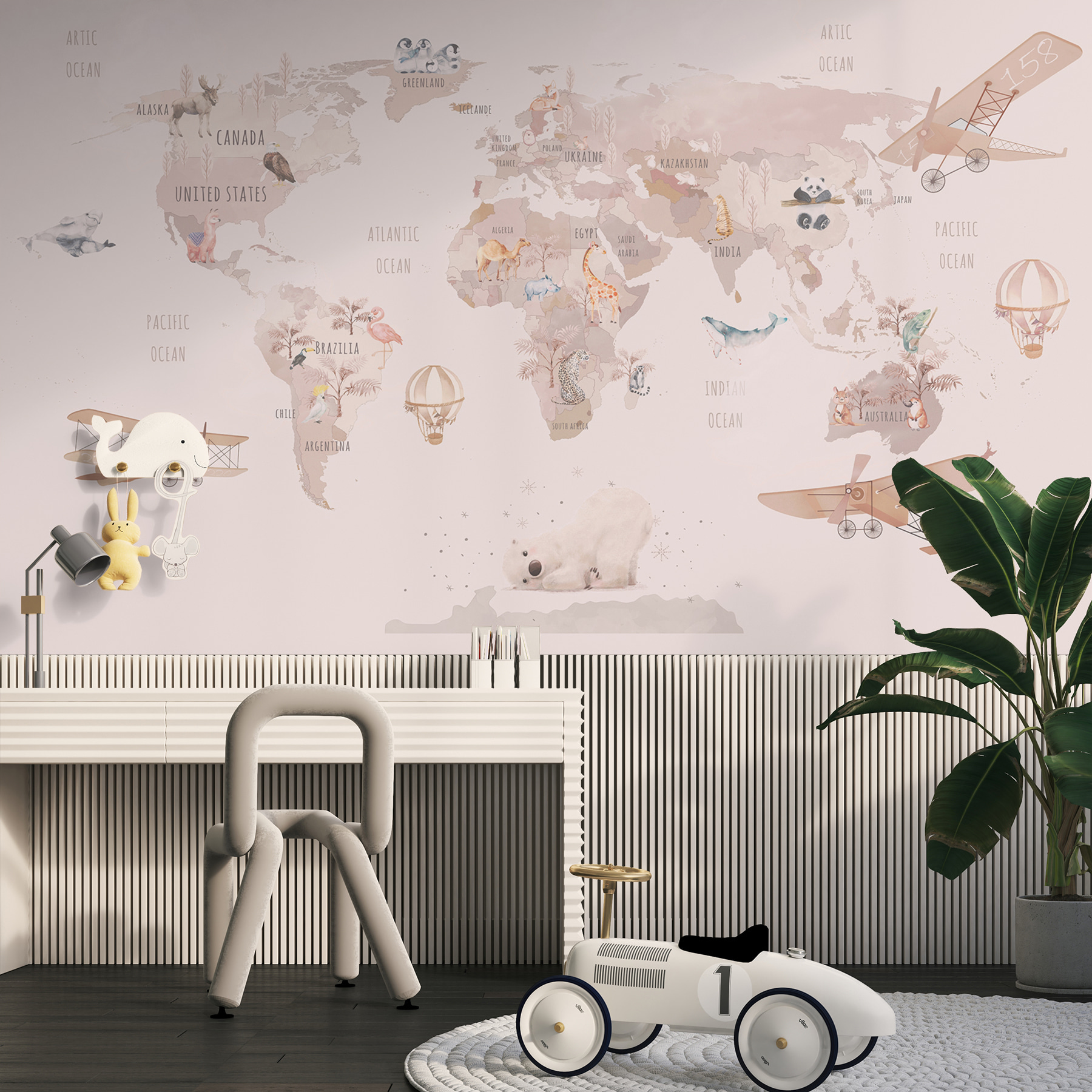 Μεταμορφώστε οποιοδήποτε δωμάτιο σε ένα ιδιόρρυθμο ταξίδι στον κόσμο με αυτή την απολαυστική τοιχογραφία “Χάρτης του κόσμου”. Είναι σαν ένα ερωτικό γράμμα στην περιπέτεια, με μαγευτικές απεικονίσεις ζώων και παιχνιδιάρικα αεροσκάφη, που κεντρίζουν αμέσως την περιέργεια και τη λαχτάρα για περιπλάνηση. Φανταστείτε τα μικρά παιδιά να επισημαίνουν τις αγαπημένες τους χώρες ή να ονειρεύονται εξωτικές χώρες, ενώ περιβάλλονται από αυτά τα γοητευτικά σχέδια. Με απαλά χρώματα και παιχνιδιάρικα στοιχεία, μετατρέπει τους τοίχους σε έναν καμβά φαντασίας – ιδανικό για παιδικά δωμάτια ή παιδότοπους. Αυτή η τοιχογραφία δεν διακοσμεί απλώς- προσκαλεί σε ιστορίες και όνειρα. Ας ξεκινήσουμε λοιπόν την εξερεύνηση!
