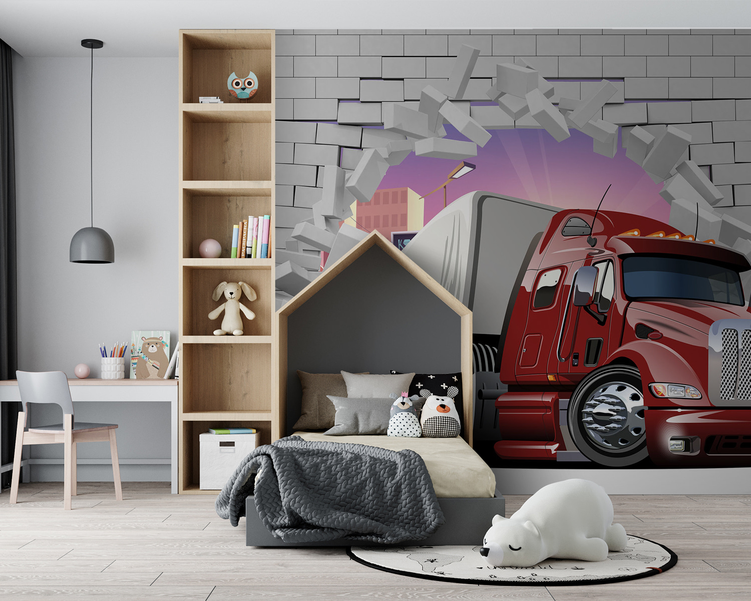 Αυτή η τοιχογραφία ονομάζεται “Φορτηγό διαπερνά τον τοίχο”, και είναι αντάξια του ονόματός της! Φανταστείτε να έχετε ένα τεράστιο, κόκκινο φορτηγό να σπάει τον τοίχο του σαλονιού σας – είναι σαν να ζείτε μια σκηνή από ταινία δράσης. Έχετε ένα παιδί με εμμονή με τα αυτοκίνητα; Αυτό θα τους τρελάνει το μυαλό και ίσως τους κάνει να κάνουν τα μαθήματά τους σε χρόνο μηδέν (ελπίζω)! Η λεπτομέρεια είναι τόσο καθαρή, που σχεδόν σε κάνει να θες να σκύψεις! Ιδανικό για να προσθέσετε ένα ποπ διασκέδασης σε ένα παιδικό δωμάτιο ή ακόμα και σε ένα γκαράζ. Ο κόσμος θα κοιτάζει διπλά κάθε φορά που θα περνάει από εκεί. Επιπλέον, δεν είναι μόνο για παιδιά – οι λάτρεις των αυτοκινήτων θα το λατρέψουν. Αναζωογονήστε την ατμόσφαιρα του χώρου σας με αυτή την εντυπωσιακή τοιχογραφία που προκαλεί συζητήσεις. Είναι απροσδόκητη, μοναδική και λίγο επαναστατική!