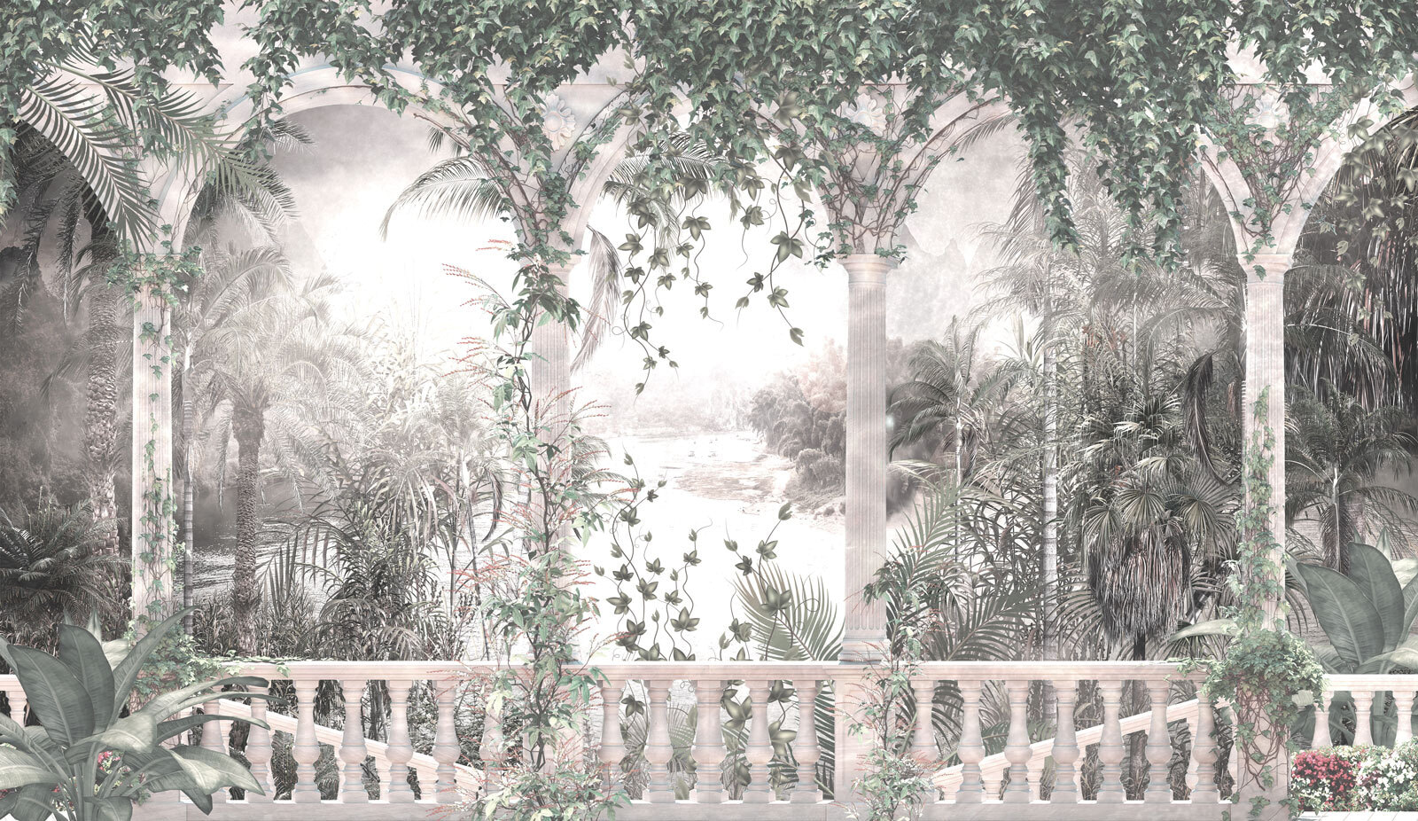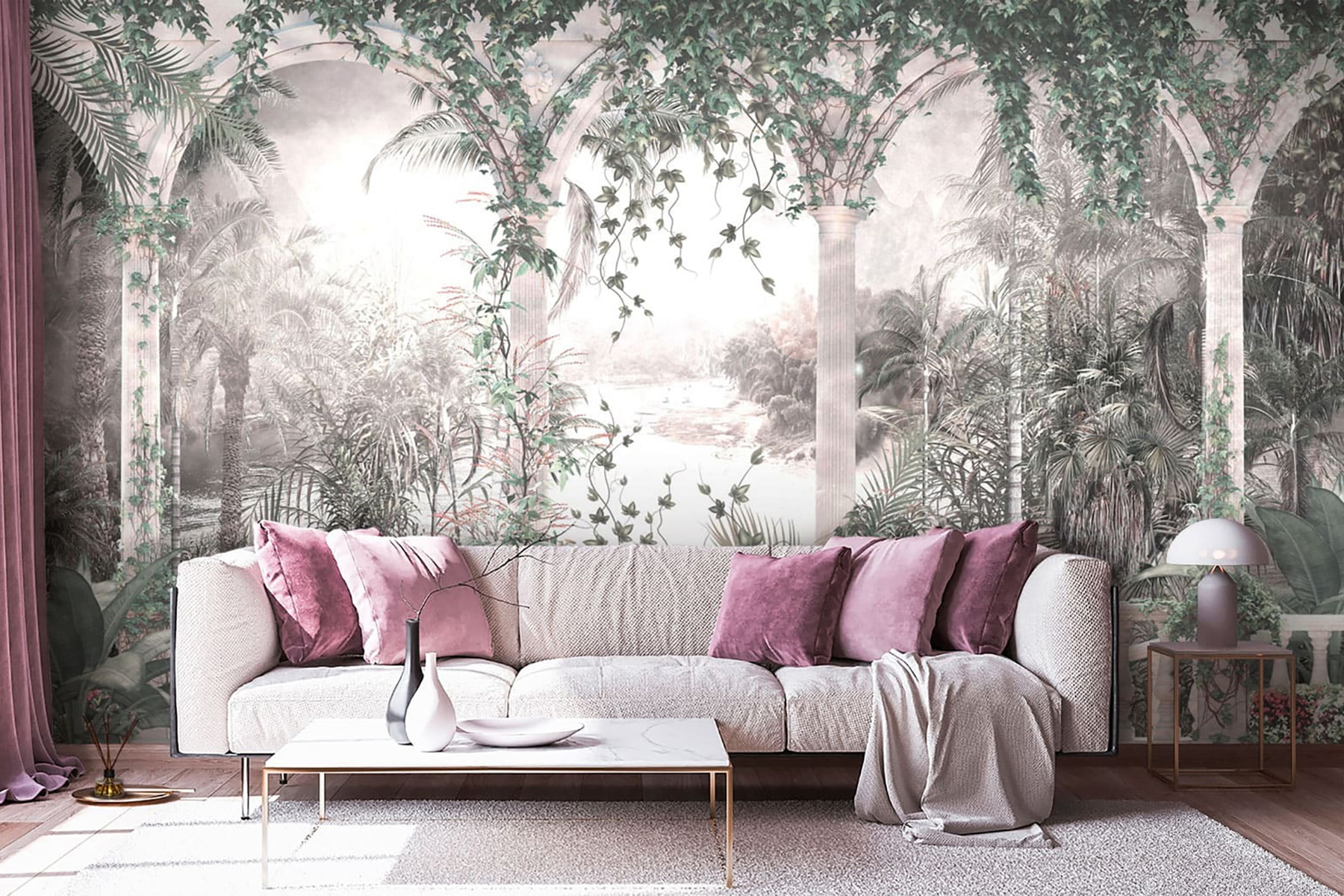 Μπείτε σε μια γαλήνια απόδραση με αυτή την τοιχογραφία, προσκαλώντας πλούσια αμπέλια και χαριτωμένες καμάρες κατευθείαν στο σπίτι σας. Φανταστείτε να πίνετε τον πρωινό σας καφέ καθώς το φως του ήλιου φιλτράρεται μέσα από τα φυλλώδη χόρτα, δημιουργώντας μια γαλήνια ατμόσφαιρα που μοιάζει αναζωογονητική και διαχρονική. Το απαλό φόντο παραπέμπει σε ένα γαλήνιο τοπίο, κάνοντάς το εύκολο να ξεχάσετε τον έξω κόσμο. Αυτή η τοιχογραφία δεν είναι απλώς διακόσμηση τοίχου- είναι μια μίνι-διακοπή που περιμένει να συμβεί. Ιδανική για τη μετατροπή ενός βαρετού δωματίου σε μια ζεστή γωνιά, προσθέτει ένα στρώμα ζεστασιάς και γοητείας που εξάπτει τη φαντασία.