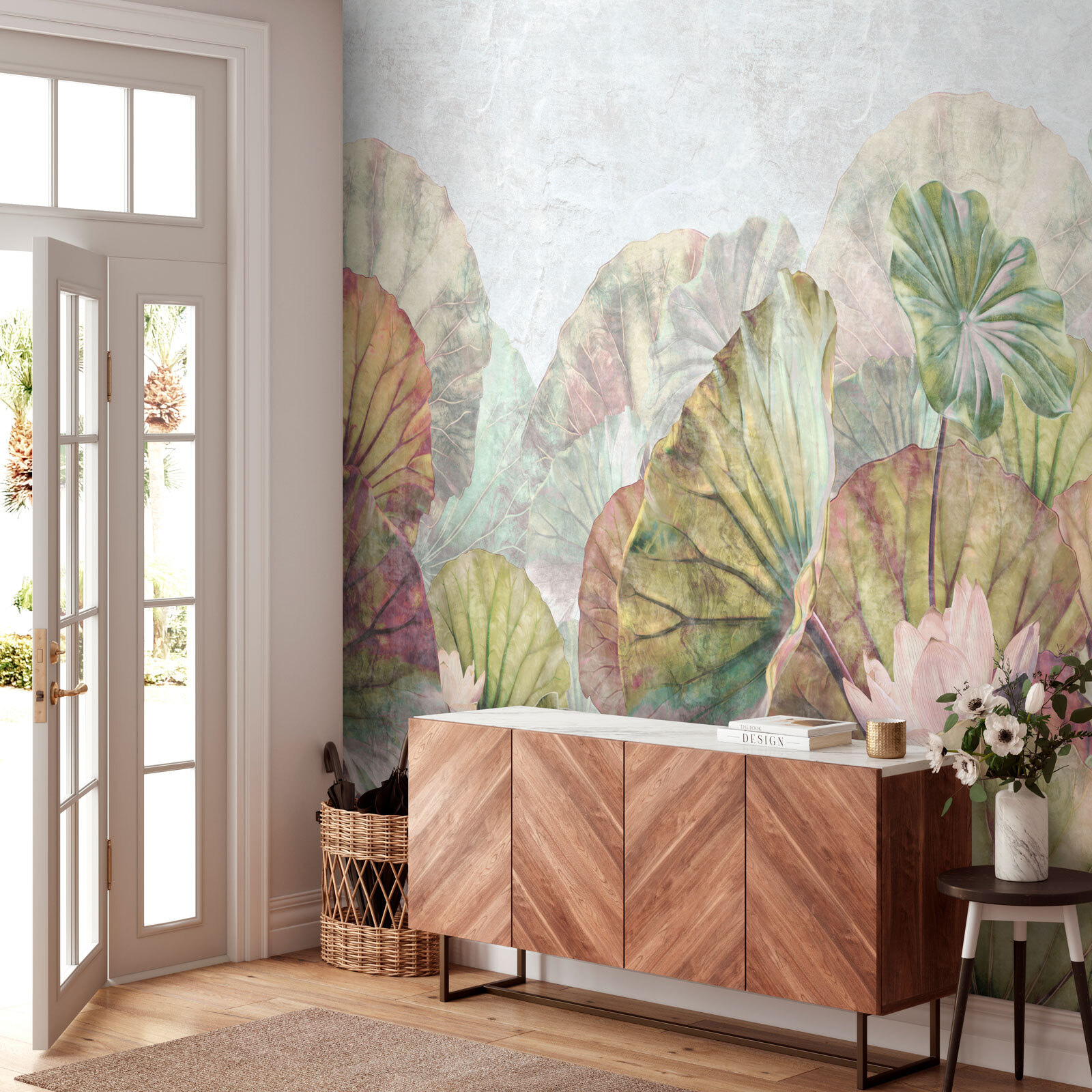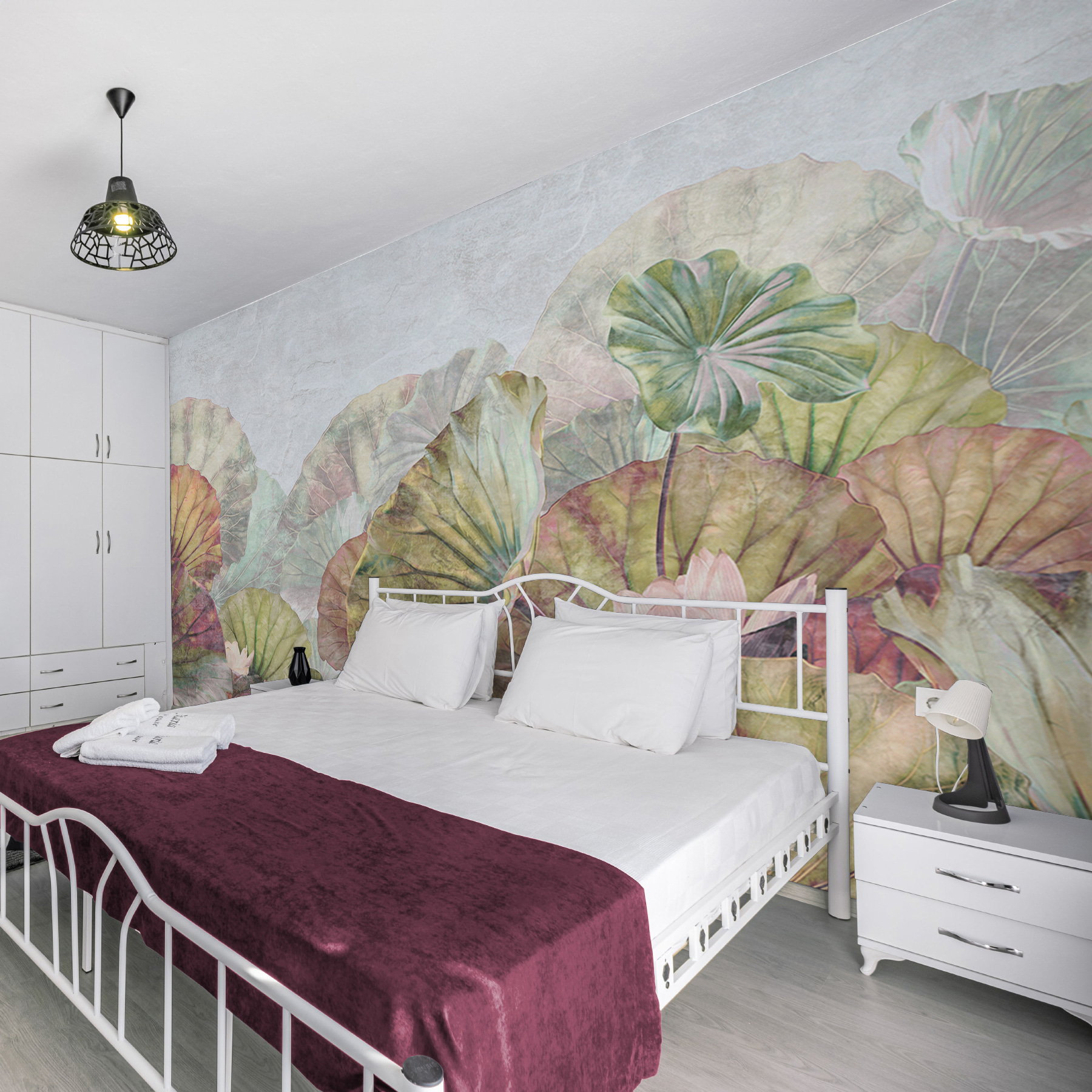 Φανταστείτε το εξής: μπαίνετε σε ένα δωμάτιο και αμέσως σας περιβάλλουν οι χαλαρωτικές, γαλήνιες δονήσεις των φύλλων λωτού ζωγραφισμένων σε απαλά παστέλ χρώματα. Αυτή η τοιχογραφία δεν είναι απλώς μια ταπετσαρία – είναι σαν να μπαίνετε σε ένα γαλήνιο καταφύγιο στη μέση μιας πολύβουης πόλης. Τα χρώματα είναι ψιθυριστά-μαλακά, κάνοντας τα φύλλα να ξεπροβάλλουν με μια λεπτή χάρη.