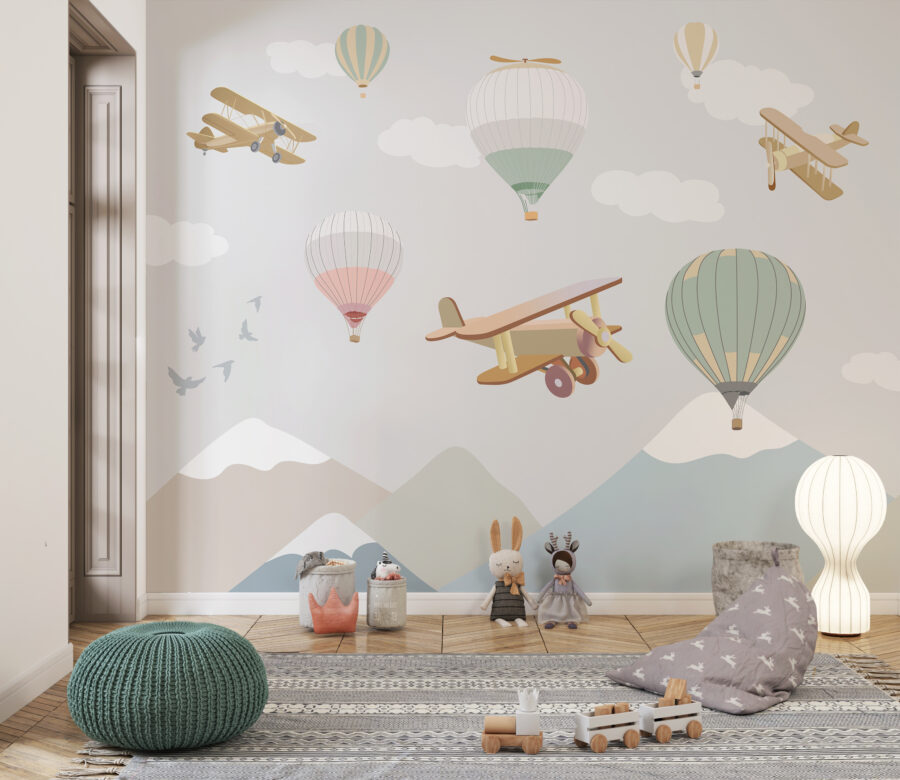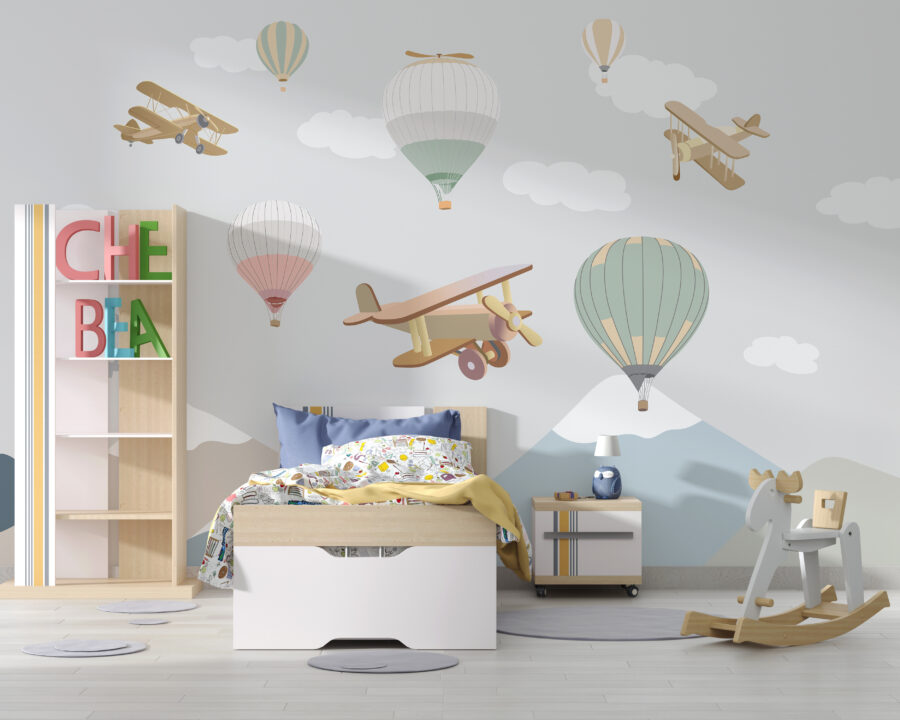 Έχετε έναν άγριο τυχοδιώκτη στην οικογένεια; Η τοιχογραφία “Hot Air Balloon in the Sky” είναι σαν να ανοίγει ένα παράθυρο σε μια ιδιόρρυθμη ονειρική χώρα. Ιδανική για παιδικά δωμάτια και δωμάτια μικρών εξερευνητών, αυτή η τοιχογραφία εκτοξεύει απαλά παστέλ αερόστατα και vintage αεροπλάνα σε απαλά, χνουδωτά σύννεφα που πετούν πάνω από γαλήνια βουνά. Φανταστείτε αυτά τα μικροσκοπικά χαχανητά καθώς το παιδί σας πέφτει στον ύπνο, ονειρευόμενο ιπτάμενες περιπέτειες! Είναι ηρεμιστικό αλλά και συναρπαστικό, πυροδοτώντας τη φαντασία, διατηρώντας παράλληλα τα πράγματα πολύ άνετα. Εγγυημένα ευχάριστα όνειρα!
