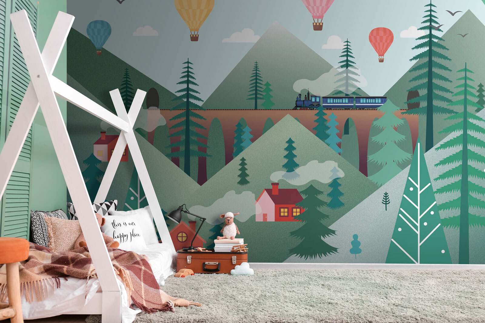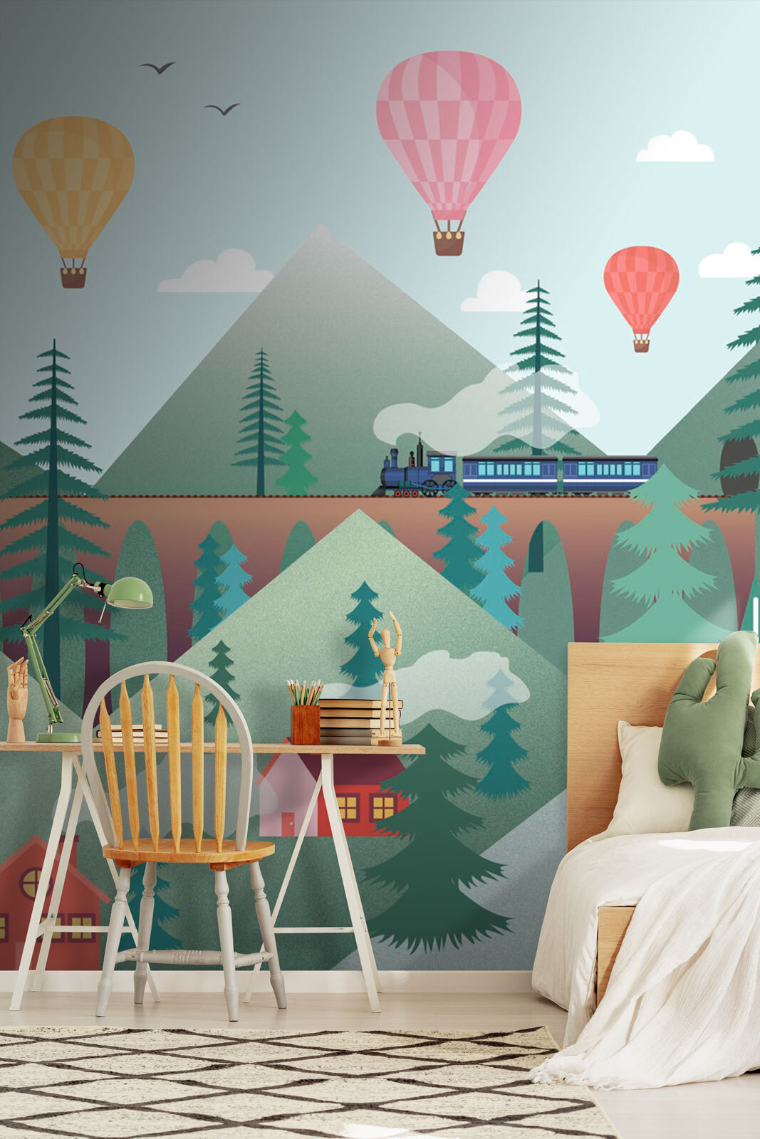 Ονειρευτήκατε ποτέ να πετάξετε στον ουρανό με ένα αερόστατο θερμού αέρα; Λοιπόν, αυτή η ιδιόρρυθμη τοιχογραφία “Ροζ αερόστατο θερμού αέρα” μπορεί να είναι το επόμενο καλύτερο πράγμα. Φανταστείτε να μετατρέψετε ένα παιδικό δωμάτιο ή ένα δωμάτιο παιχνιδιού σε έναν παστέλ παράδεισο όπου πολύχρωμα μπαλόνια αιωρούνται πάνω από γοητευτικά σπίτια και επιβλητικά βουνά. Είναι σαν μια σελίδα από παραμύθι – όπου κάθε ματιά τροφοδοτεί τη φαντασία του μικρού σας. Φωτεινό, διασκεδαστικό και πραγματικά αξιολάτρευτο, φέρνει μια αίσθηση ηρεμίας και θαυμασμού σε κάθε δωμάτιο. Επιπλέον, ποιος δεν θα λάτρευε ένα άνετο, γραφικό σκηνικό για τις ιστορίες πριν τον ύπνο ή τις περιπέτειες του παιχνιδιού; Αυτές οι μικροσκοπικές λεπτομέρειες -ο φουσκωμένος καπνός από τις καμινάδες και τα γαλήνια βουνά- προσθέτουν μια δόση μαγείας που είναι τόσο ελκυστική. Δεν είναι απλώς διακόσμηση, είναι μια καθημερινή δόση χαράς τυλιγμένη σε μια τοιχογραφία.