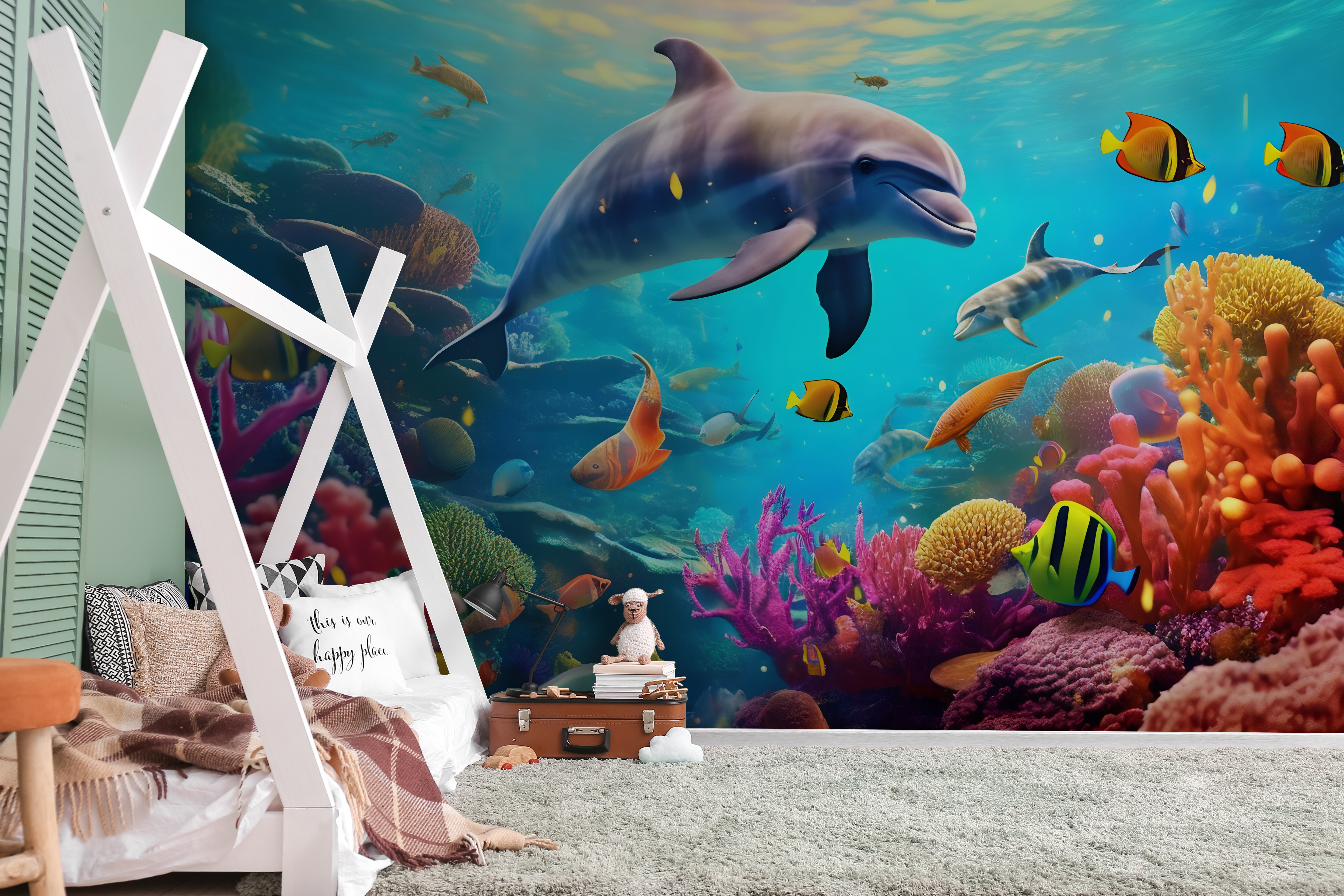 Βυθιστείτε σε έναν κόσμο χρωμάτων και χαράς με αυτή τη μαγευτική τοιχογραφία με δελφίνια που γλιστρούν μέσα σε έναν ζωντανό κοραλλιογενή ύφαλο. Ιδανική για να φωτίσει το δωμάτιο ενός παιδιού ή να προσθέσει μια πινελιά διασκέδασης σε οποιονδήποτε χώρο, φέρνει το θαύμα του ωκεανού στους τοίχους σας. Φανταστείτε τα μικρά παιδιά να χαμογελούν καθώς εξερευνούν την υποβρύχια σκηνή, γεμάτη με φιλικά ψάρια και παιχνιδιάρικα δελφίνια. Κάθε ματιά μοιάζει με μίνι διακοπές! Οι αποχρώσεις θα χορεύουν στο φως, δημιουργώντας μια ζωντανή ατμόσφαιρα που εξάπτει τη φαντασία και την περιπέτεια. Ποιος δεν θα ήθελε να κολυμπήσει με δελφίνια στα όνειρά του;