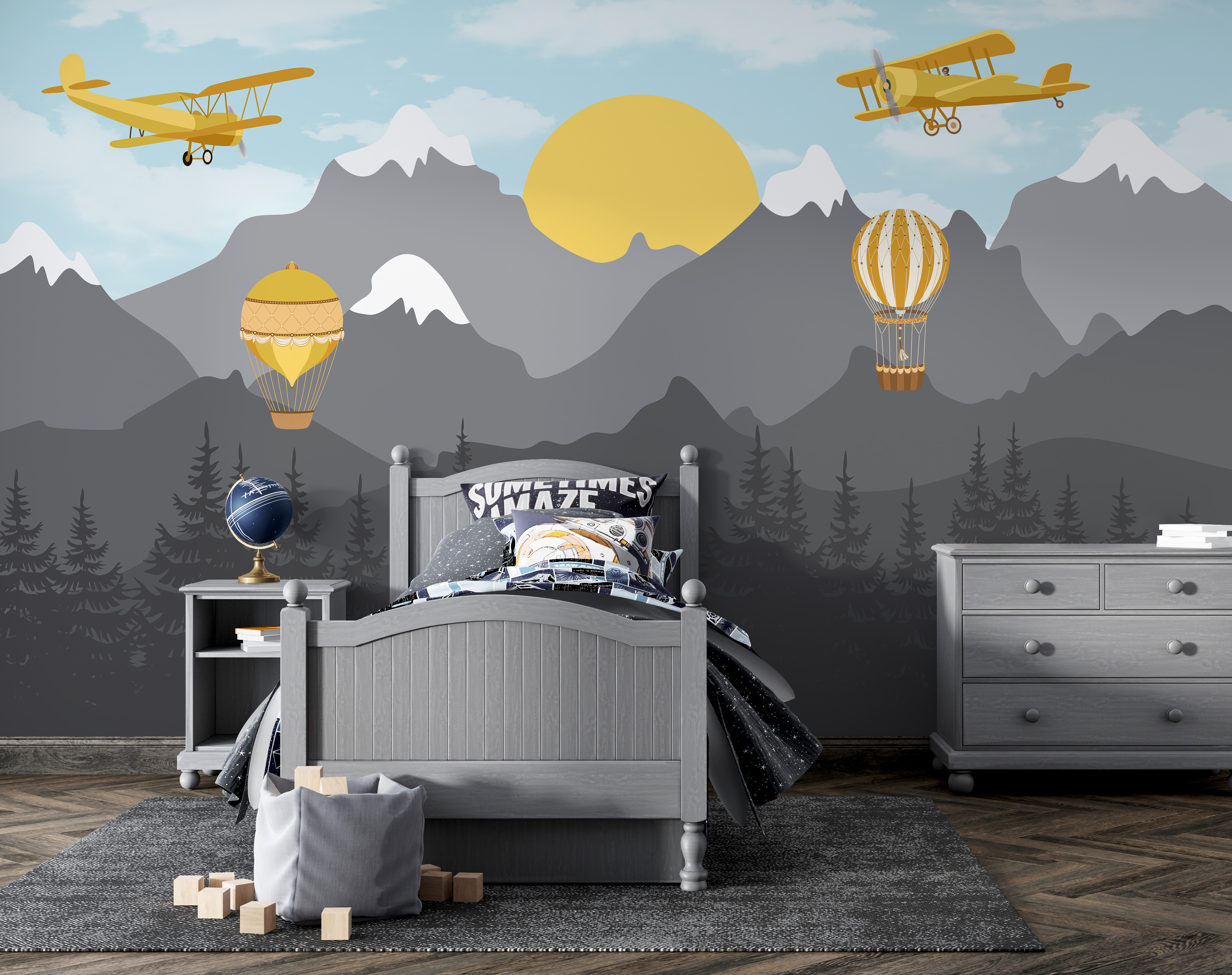 Μεταμορφώστε το δωμάτιο ενός παιδιού σε μια ιδιόρρυθμη ουράνια περιπέτεια με αυτή την απολαυστική τοιχογραφία με ένα κίτρινο αεροπλάνο που πετάει πάνω από μεγαλοπρεπή βουνά και παιχνιδιάρικα αερόστατα. Φανταστείτε τον ενθουσιασμό καθώς τα μικρά παιδιά ατενίζουν ψηλά, ονειρεύονται μακρινές χώρες και τη συγκίνηση της πτήσης. Τα απαλά μπλε και τα σιωπηλά γκρι χρώματα δημιουργούν ένα ηρεμιστικό σκηνικό, ενώ το χαρούμενο κίτρινο ξεπροβάλλει για να τραβήξει τα βλέμματα – και να προκαλέσει χαρά. Κρεμάστε το σε ένα υπνοδωμάτιο ή σε έναν χώρο παιχνιδιού και δείτε τη φαντασία να παίρνει φτερά! Είναι σαν να έχετε ένα μικρό κομμάτι του ουρανού σε εσωτερικό χώρο – μόνο που ίσως όχι με αληθινά σύννεφα. Ιδανικό για περιπετειώδη πνεύματα!