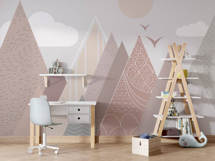 Φανταστείτε να μπαίνετε σε ένα δωμάτιο και να αισθάνεστε αμέσως μια αίσθηση ηρεμίας και ιδιοτροπίας – κάτι σαν ένα άνετο όνειρο της ημέρας. Η τοιχογραφία τοίχου “Γεωμετρικά βουνά με πουλιά που πετούν” κάνει ακριβώς αυτό. Φέρνει μια γλυκιά, γαλήνια ατμόσφαιρα σε κάθε παιδικό δωμάτιο με τα παιχνιδιάρικα, παστέλ βουνά και τα φιλικά πουλιά που πετούν. Ιδανική για παιδικούς σταθμούς και παιδικά υπνοδωμάτια, πασπαλίζει λίγη μαγεία χωρίς να είναι υπερβολικά δυνατή.