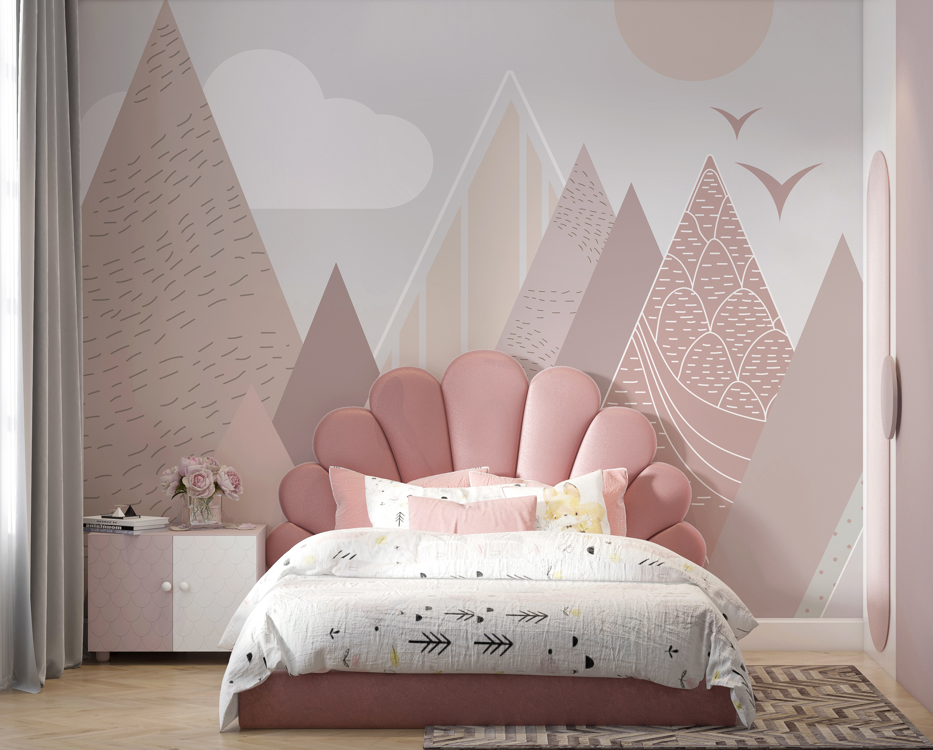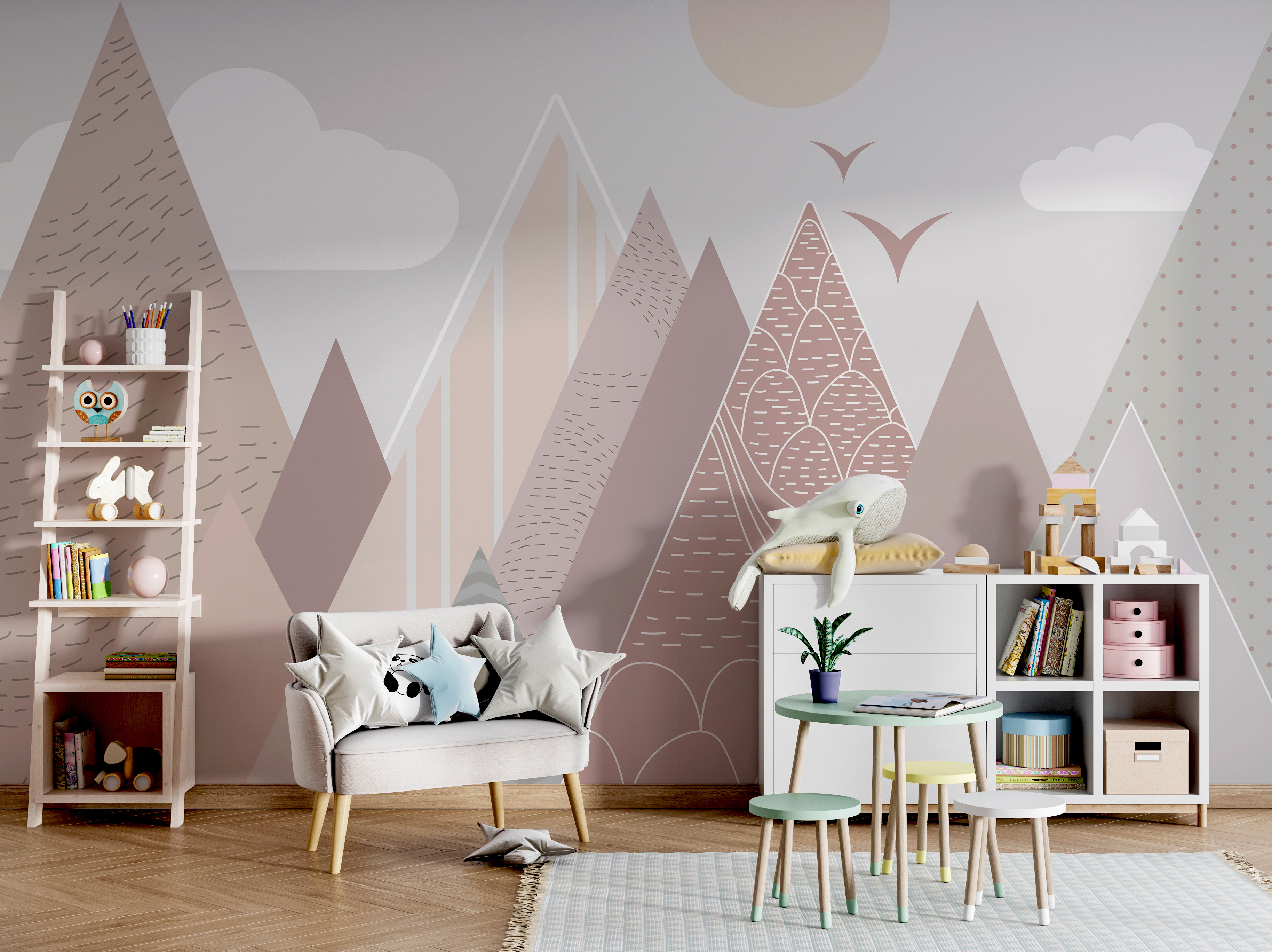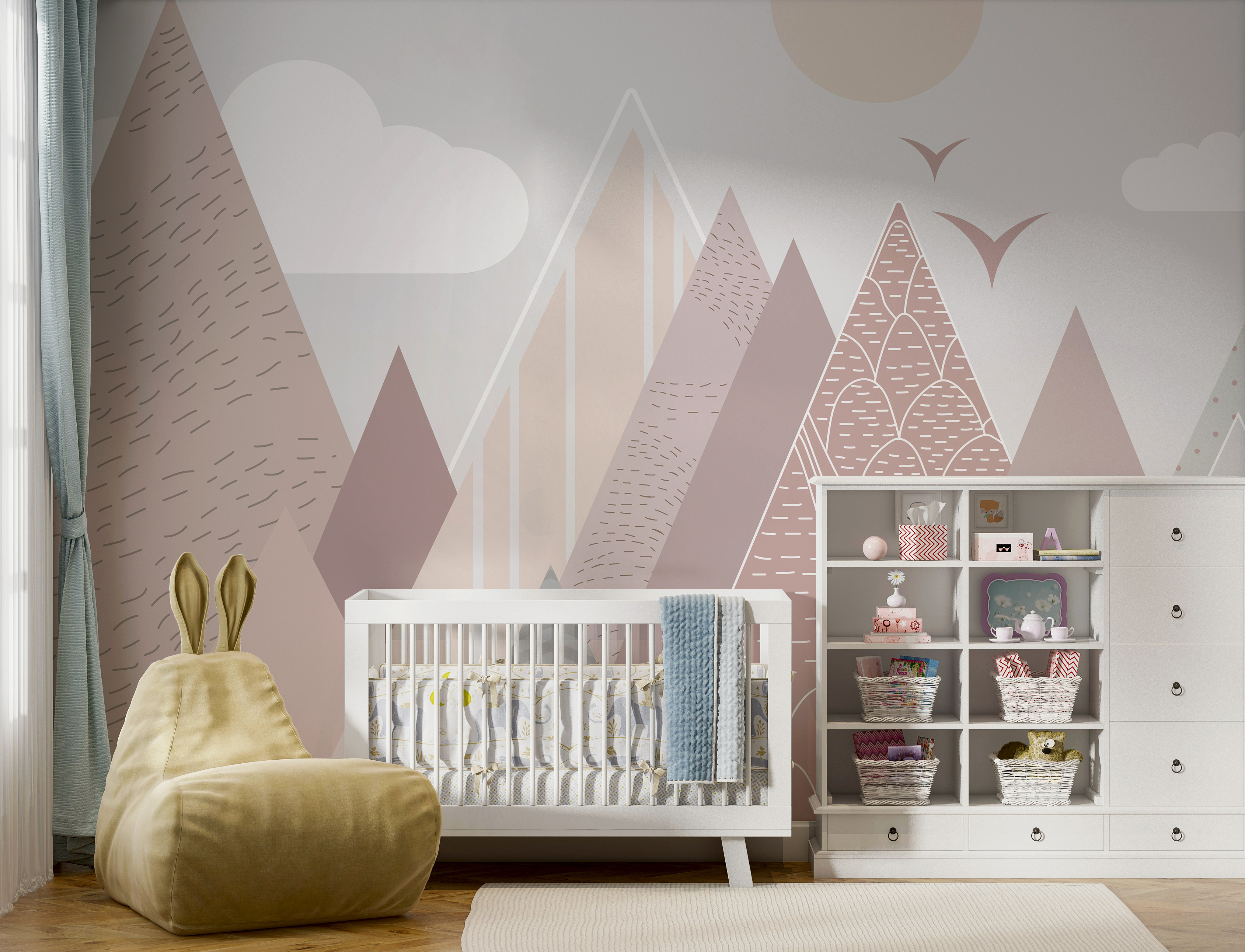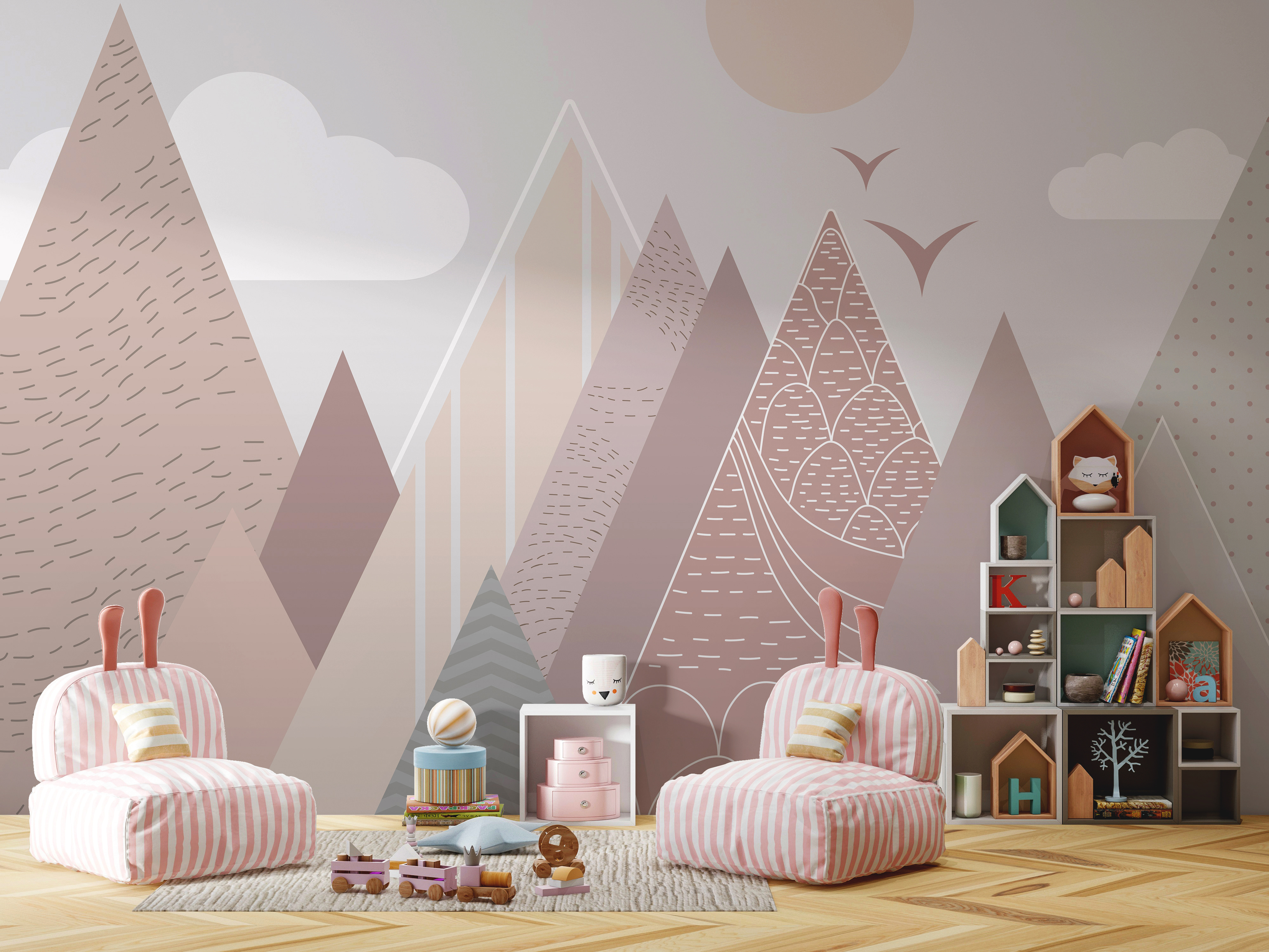 Φανταστείτε να μπαίνετε σε ένα δωμάτιο και να αισθάνεστε αμέσως μια αίσθηση ηρεμίας και ιδιοτροπίας – κάτι σαν ένα άνετο όνειρο της ημέρας. Η τοιχογραφία τοίχου “Γεωμετρικά βουνά με πουλιά που πετούν” κάνει ακριβώς αυτό. Φέρνει μια γλυκιά, γαλήνια ατμόσφαιρα σε κάθε παιδικό δωμάτιο με τα παιχνιδιάρικα, παστέλ βουνά και τα φιλικά πουλιά που πετούν. Ιδανική για παιδικούς σταθμούς και παιδικά υπνοδωμάτια, πασπαλίζει λίγη μαγεία χωρίς να είναι υπερβολικά δυνατή.