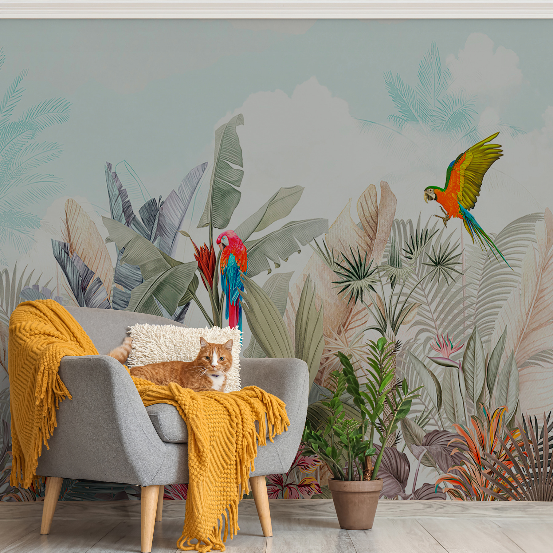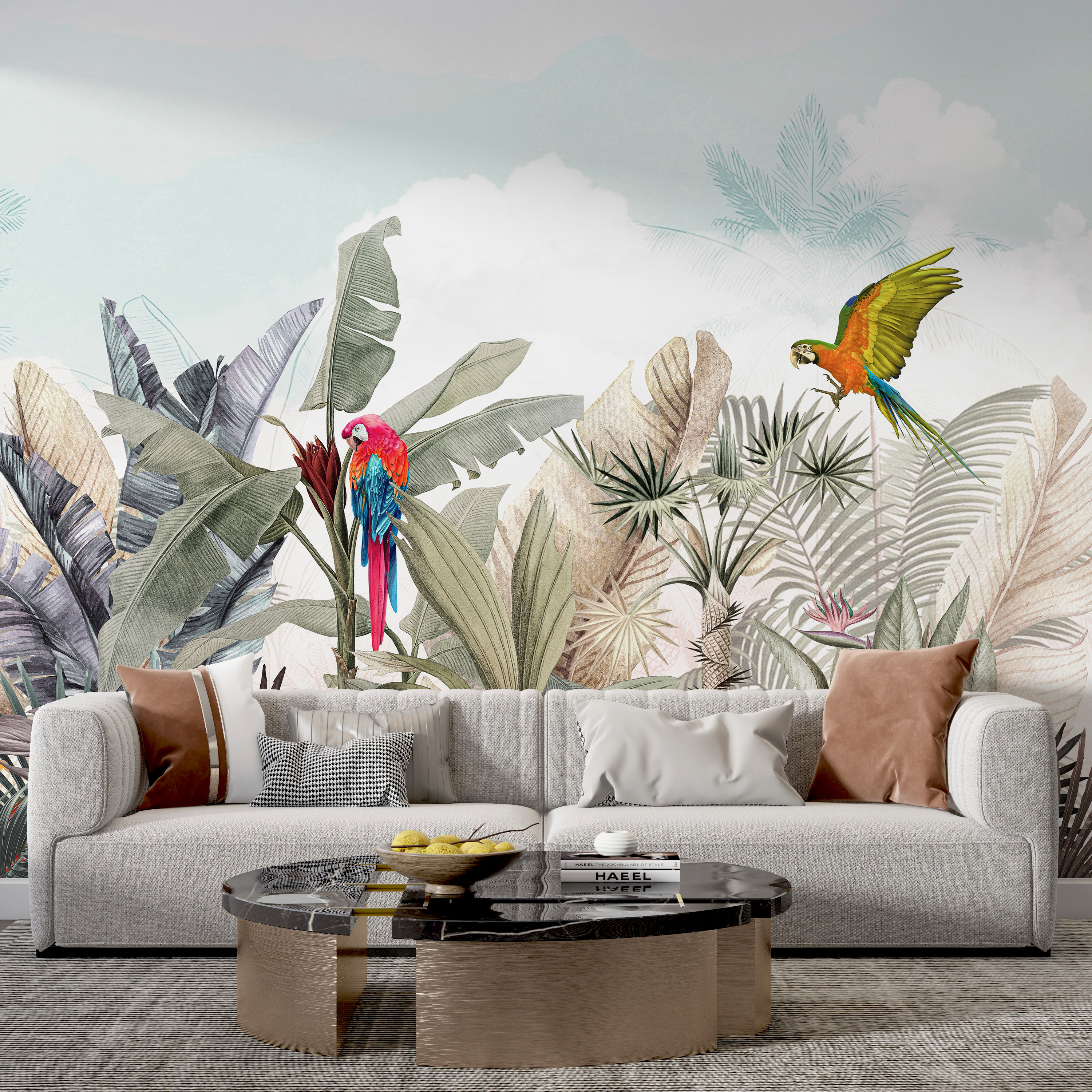 Γνωρίστε τη νέα σας εμμονή στον τοίχο: την τοιχογραφία “Πολύχρωμος παπαγάλος που πετάει στον αέρα”. Είναι σαν να βρίσκεις το όνειρο ενός παρατηρητή πουλιών να προσγειώνεται στο σαλόνι σου! Φανταστείτε δύο ζωηρούς παπαγάλους να γλιστρούν πάνω από φυλλώδη πράσινα και τροπικά λουλούδια. Είναι σαν μια μίνι-διακοπή στο τροπικό δάσος – χωρίς τα κουνούπια, δόξα τω Θεώ!