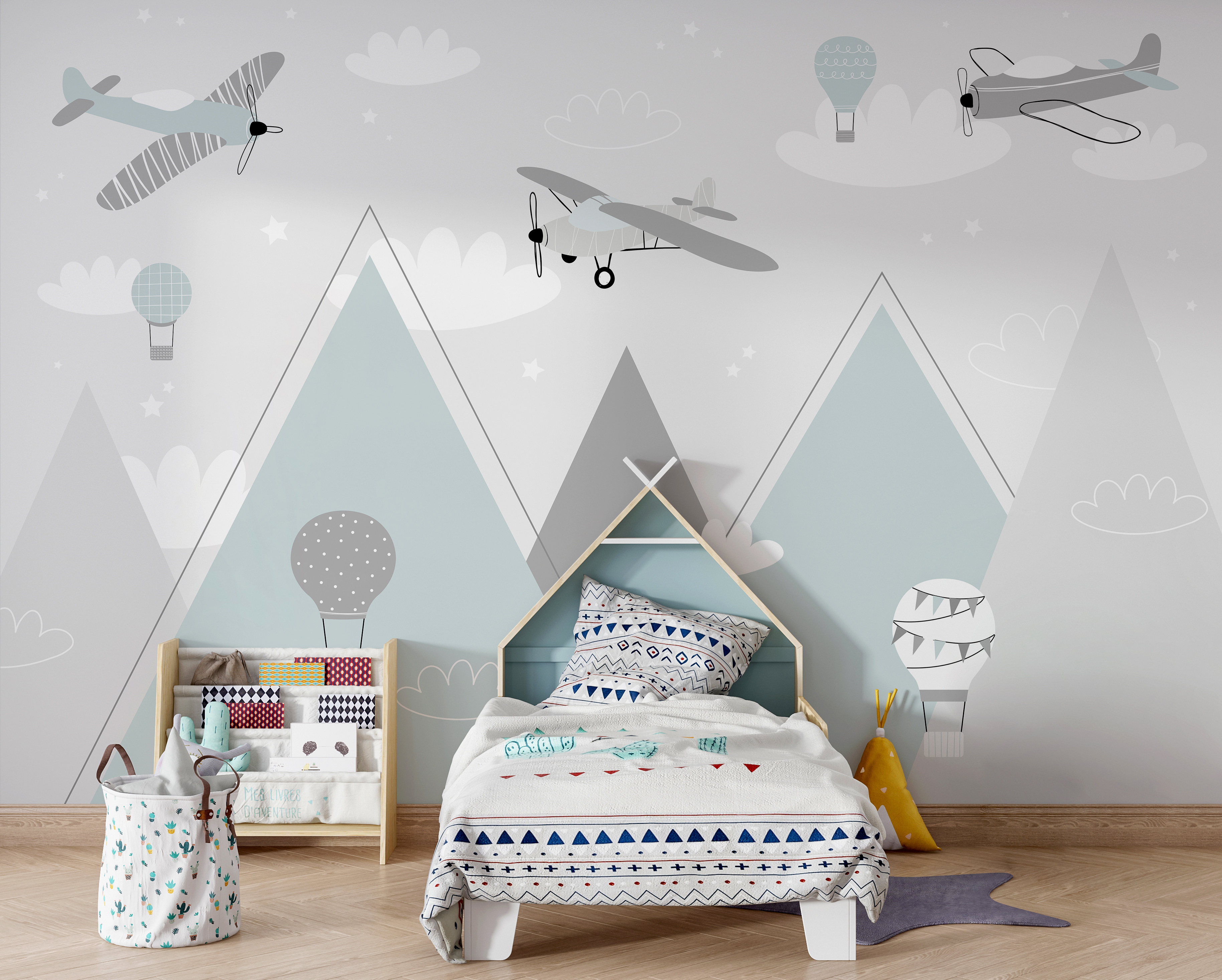 Φανταστείτε το δωμάτιο του παιδιού σας να μεταμορφώνεται αμέσως με αυτή την απολαυστική τοιχογραφία, γεμάτη vintage αεροπλάνα και ιδιόρρυθμα αερόστατα. Είναι σαν να μπαίνετε σε μια ονειρική, παστέλ χρωματιστή περιπέτεια – έναν ουρανό γεμάτο ευγενικές ιστορίες που περιμένουν να ξεδιπλωθούν. Κάθε φορά που το μικρό σας το κοιτάζει, η φαντασία του μπορεί να απογειωθεί και να πετάξει ψηλά πάνω από αυτά τα γοητευτικά βουνά. Ιδανικό για γιους, κόρες, βρέφη ή για όποιον απολαμβάνει λίγη ιδιόρρυθμη διασκέδαση. Επίσης, ποιος μπορεί να αντισταθεί σε αυτά τα αξιολάτρευτα σχέδια; Δεν είναι απλώς διακόσμηση – είναι ένα ταξίδι σε ένα δωμάτιο. Φανταστείτε τις ιστορίες για ύπνο να πετούν, περιτριγυρισμένες από αυτή τη γαλήνια και παιχνιδιάρικη σκηνή. Καλό ταξίδι στη χώρα των ονείρων!