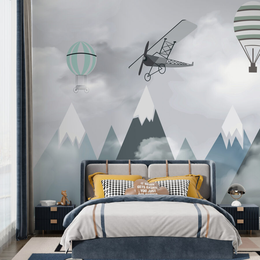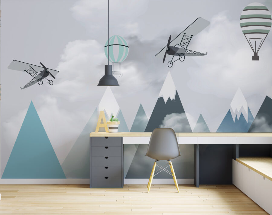 Φανταστείτε το δωμάτιο του παιδιού σας να μεταμορφώνεται σε μια ονειρική περιπέτεια στον ουρανό με αυτή την απολαυστική “Τοιχογραφία Αεροπλάνα και μπαλόνια πάνω από βουνά”. Είναι σαν να μπαίνετε σε ένα παραμύθι, όπου ιδιόρρυθμα αεροπλάνα και αερόστατα παρασύρονται νωχελικά πάνω από γαλήνιες βουνοκορφές. Ιδανική για τον μικρό σας αεροπόρο ή τον επίδοξο εξερευνητή, αυτή η τοιχογραφία πυροδοτεί την αίσθηση του θαύματος και των ατελείωτων δυνατοτήτων.