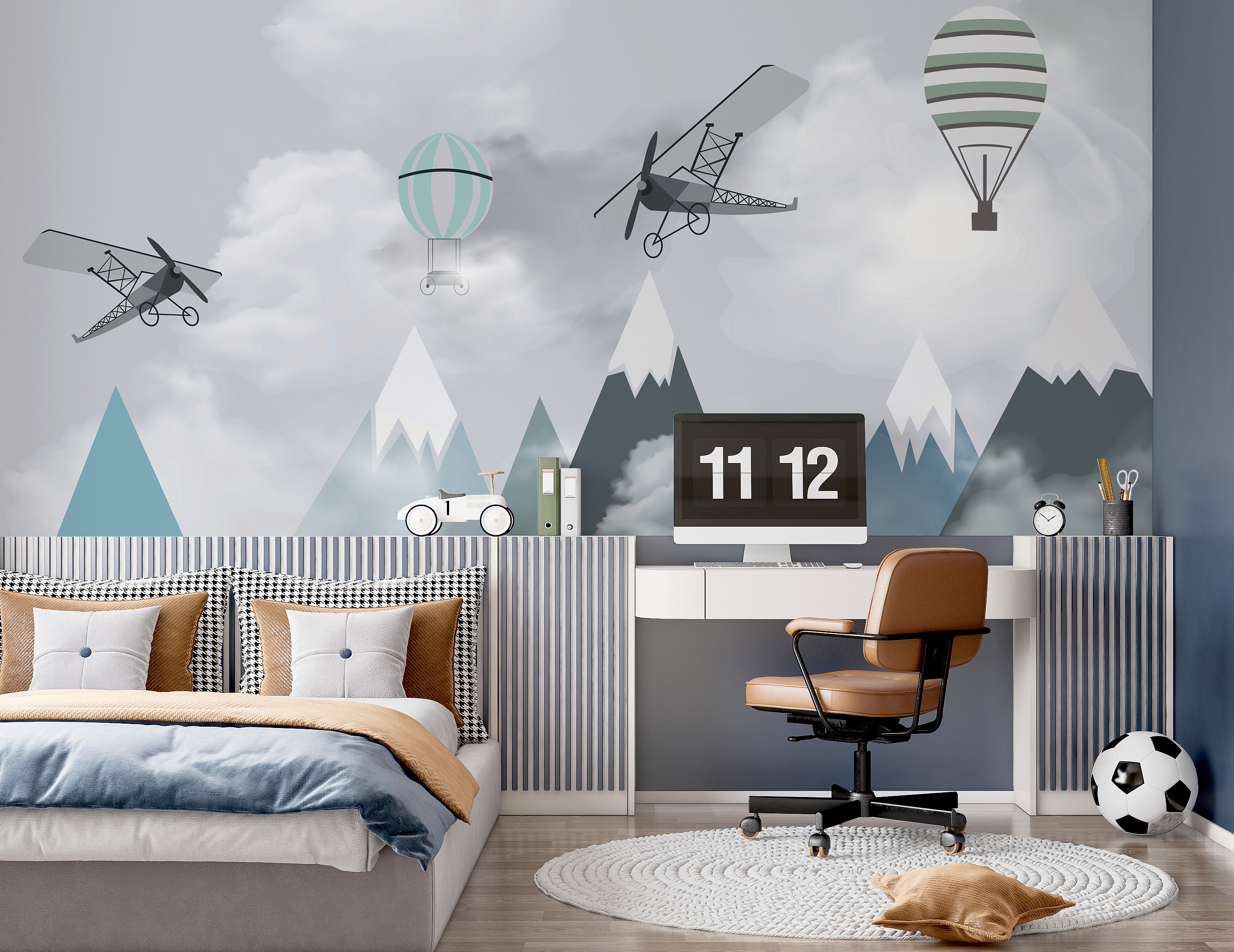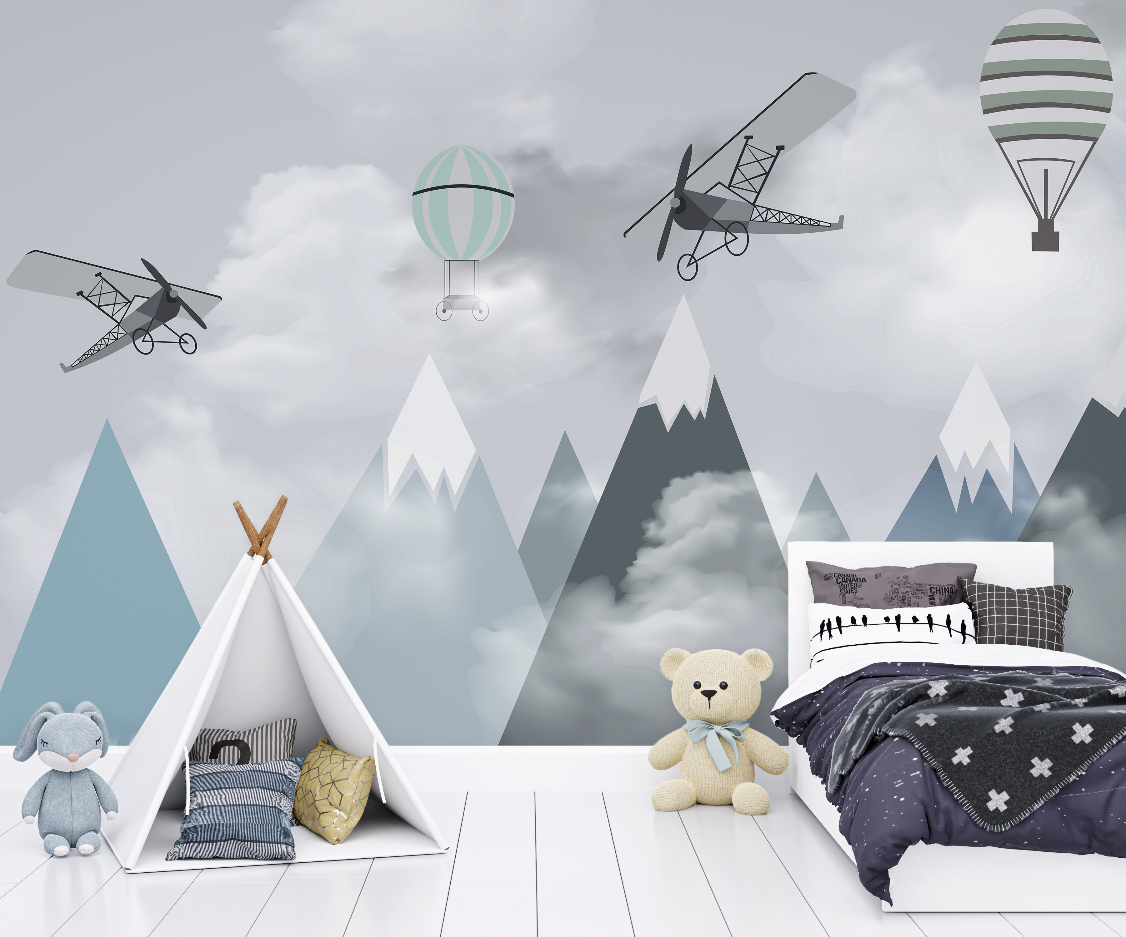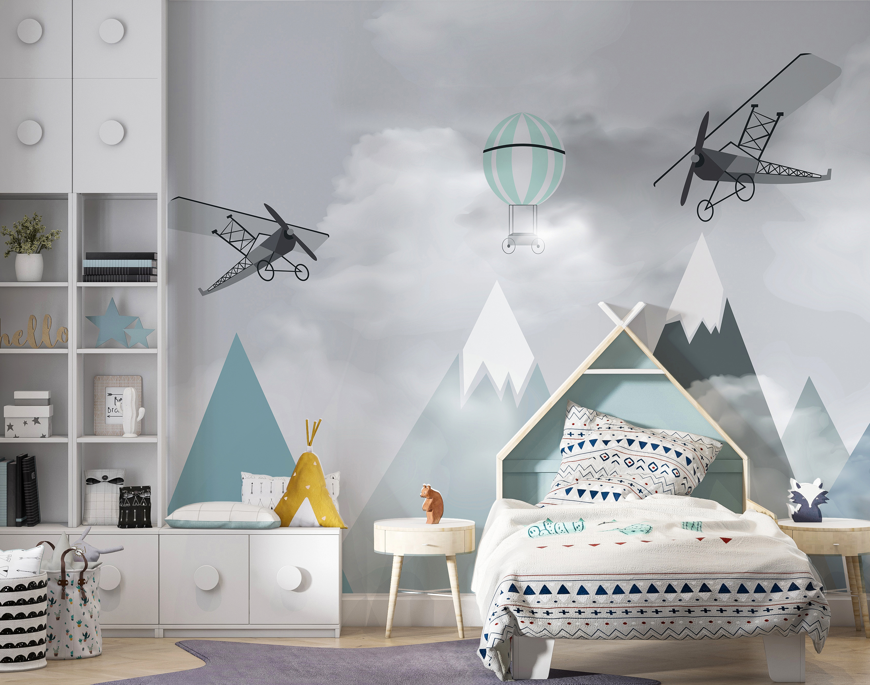 Φανταστείτε το δωμάτιο του παιδιού σας να μεταμορφώνεται σε μια ονειρική περιπέτεια στον ουρανό με αυτή την απολαυστική “Τοιχογραφία Αεροπλάνα και μπαλόνια πάνω από βουνά”. Είναι σαν να μπαίνετε σε ένα παραμύθι, όπου ιδιόρρυθμα αεροπλάνα και αερόστατα παρασύρονται νωχελικά πάνω από γαλήνιες βουνοκορφές. Ιδανική για τον μικρό σας αεροπόρο ή τον επίδοξο εξερευνητή, αυτή η τοιχογραφία πυροδοτεί την αίσθηση του θαύματος και των ατελείωτων δυνατοτήτων.