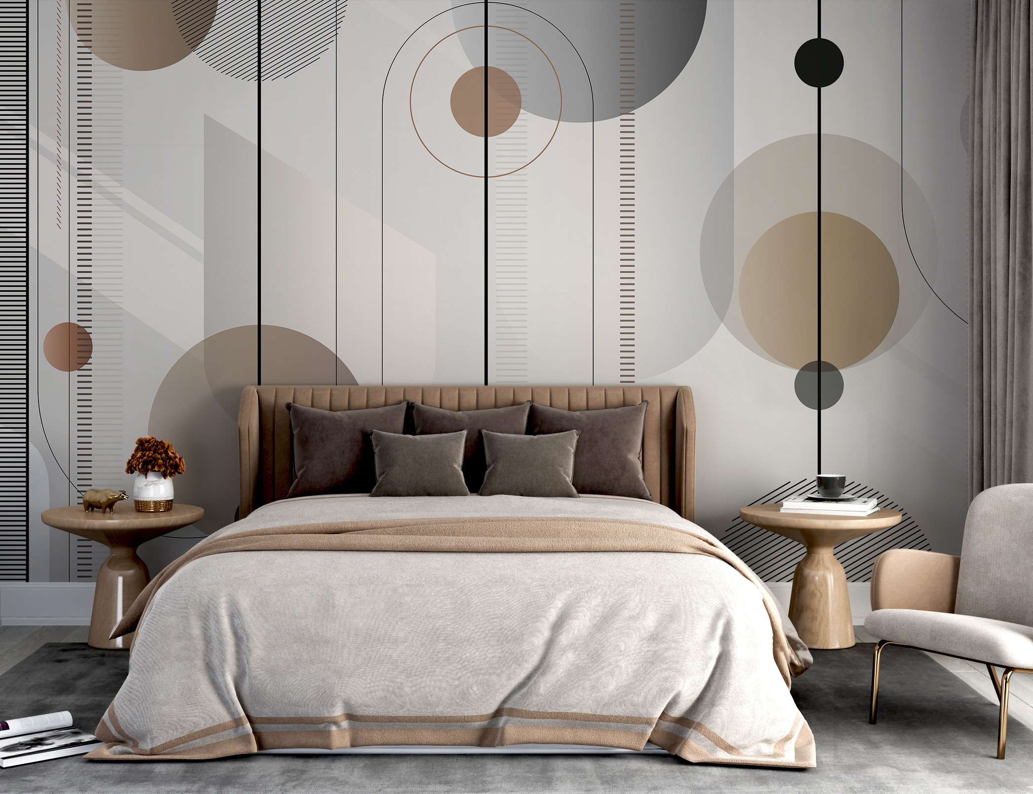 Μεταμορφώστε το χώρο σας με αυτή την εντυπωσιακή τοιχογραφία, με γεωμετρικά μοτίβα σε ζεστούς τόνους που χορεύουν στους τοίχους. Φανταστείτε να μπαίνετε σε ένα δωμάτιο που μοιάζει ταυτόχρονα ζεστό και κομψό, όπου οι καμπύλες και οι γραμμές δημιουργούν έναν ρυθμό που κάνει τα πάντα να μοιάζουν λίγο πιο ζωντανά. Είναι σαν να προσκαλείτε ένα έργο σύγχρονης τέχνης κατευθείαν στο σπίτι σας! Ιδανική για κάθε τοίχο που αισθάνεται λίγο μοναχικός, αυτή η τοιχογραφία μπορεί να εμπνεύσει λίγη δημιουργικότητα ή ίσως ακόμη και ένα διάλειμμα για χορό. Φέρτε μια αίσθηση ζεστασιάς και παιχνιδιάρικη διάθεση στη διακόσμησή σας – οι τοίχοι σας θα σας ευχαριστήσουν!