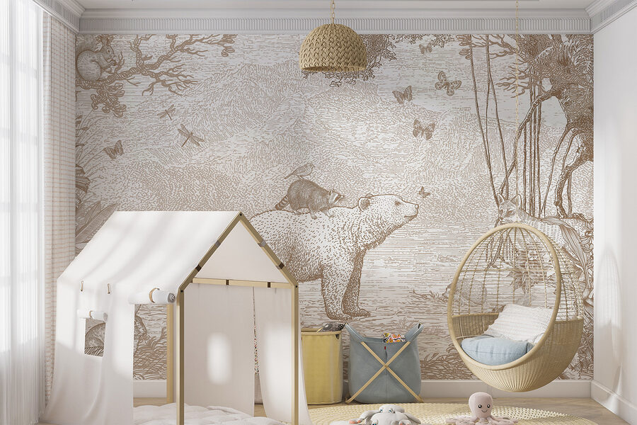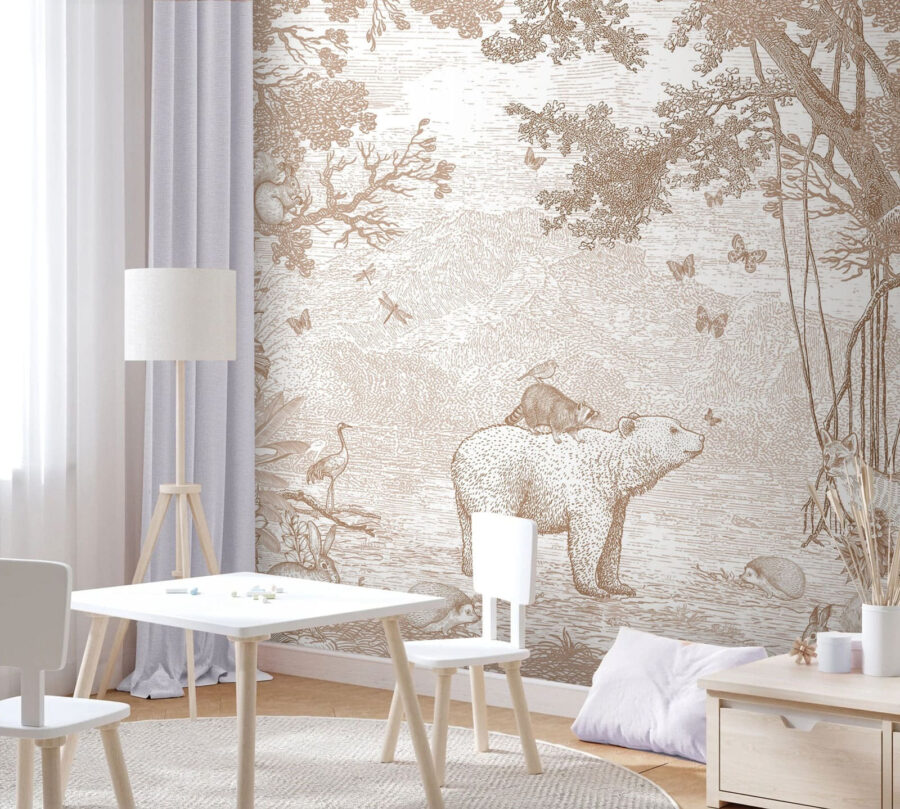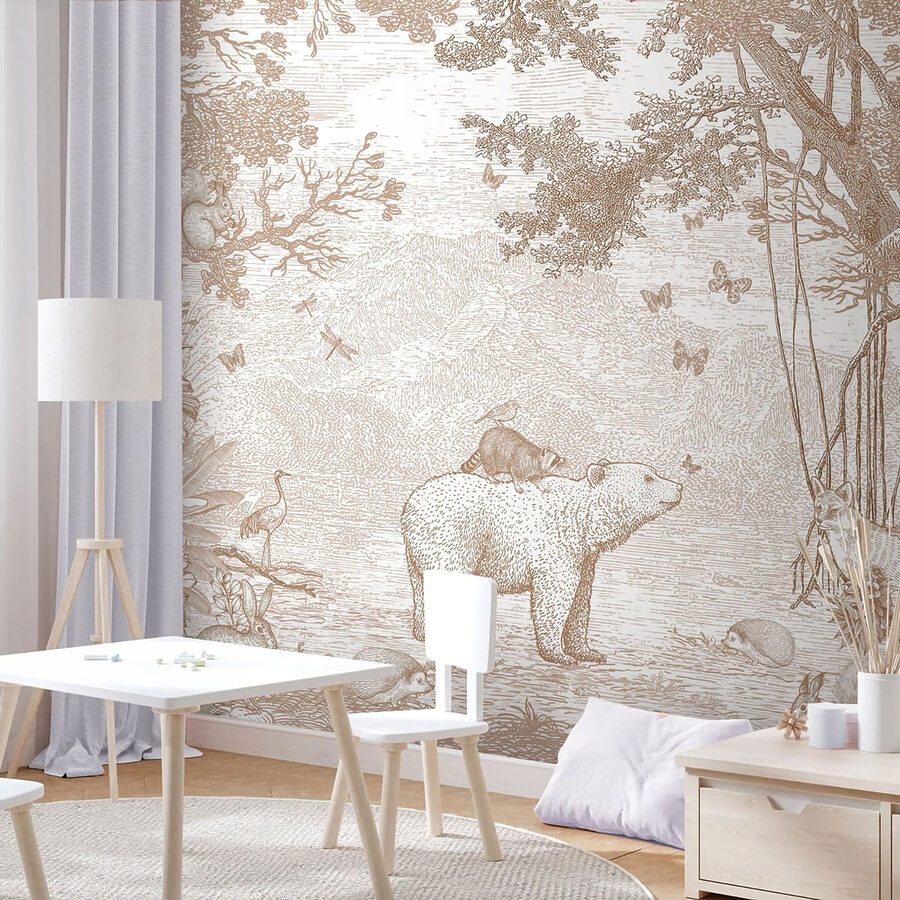 Φανταστείτε αυτό: ένα γοητευτικό ρακούν που κάθεται ευτυχισμένο στην πλάτη μιας αρκούδας, περιτριγυρισμένο από φίλους του δάσους. Αυτή η τοιχογραφία τοίχου, ιδανική για κάθε παιδικό δωμάτιο, μοιάζει σαν μια σελίδα κατευθείαν από ένα μαγευτικό παραμύθι. Οι υποτονικοί, σέπια τόνοι της δίνουν μια διαχρονική αίσθηση, καθιστώντας την καταπραϋντική και φιλόξενη – σαν μια απαλή αγκαλιά για τα μάτια. Θα πυροδοτήσει ατελείωτες ιστορίες για ύπνο και παιχνιδιάρικη φαντασία. Φανταστείτε τα μάτια του μικρού σας να φωτίζονται κάθε βράδυ. Ένα τέλειο σκηνικό για την ώρα του παιχνιδιού, του μεσημεριανού ύπνου και για όλες τις ζεστές στιγμές που μεσολαβούν. Συναρπαστικό, ιδιόρρυθμο και τόσο αξιαγάπητο!