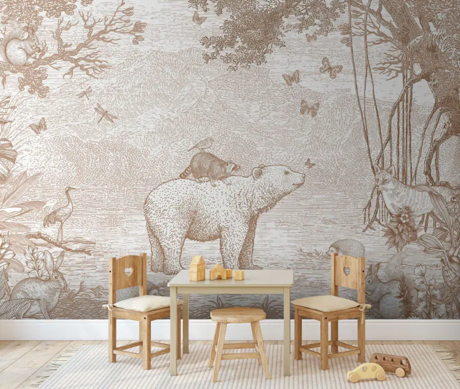 Φανταστείτε αυτό: ένα γοητευτικό ρακούν που κάθεται ευτυχισμένο στην πλάτη μιας αρκούδας, περιτριγυρισμένο από φίλους του δάσους. Αυτή η τοιχογραφία τοίχου, ιδανική για κάθε παιδικό δωμάτιο, μοιάζει σαν μια σελίδα κατευθείαν από ένα μαγευτικό παραμύθι. Οι υποτονικοί, σέπια τόνοι της δίνουν μια διαχρονική αίσθηση, καθιστώντας την καταπραϋντική και φιλόξενη – σαν μια απαλή αγκαλιά για τα μάτια. Θα πυροδοτήσει ατελείωτες ιστορίες για ύπνο και παιχνιδιάρικη φαντασία. Φανταστείτε τα μάτια του μικρού σας να φωτίζονται κάθε βράδυ. Ένα τέλειο σκηνικό για την ώρα του παιχνιδιού, του μεσημεριανού ύπνου και για όλες τις ζεστές στιγμές που μεσολαβούν. Συναρπαστικό, ιδιόρρυθμο και τόσο αξιαγάπητο!