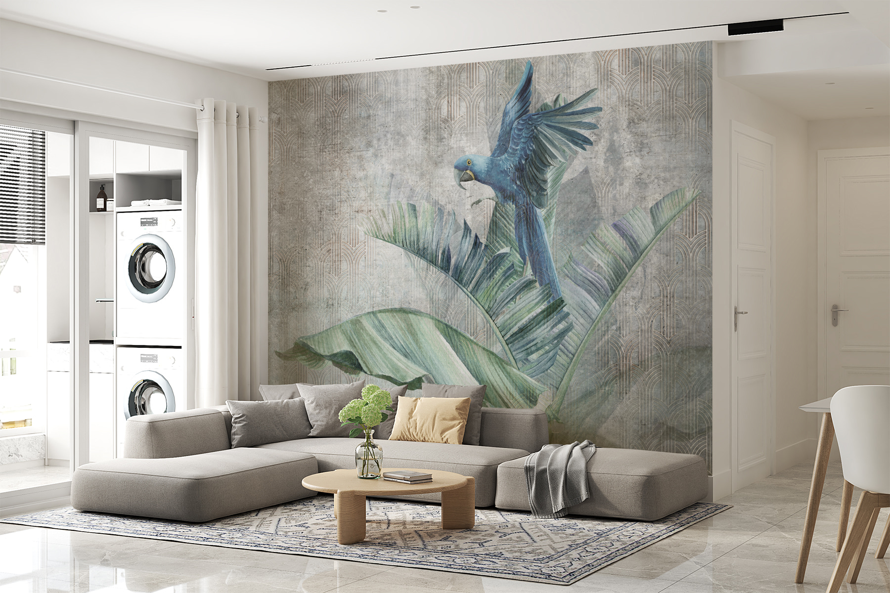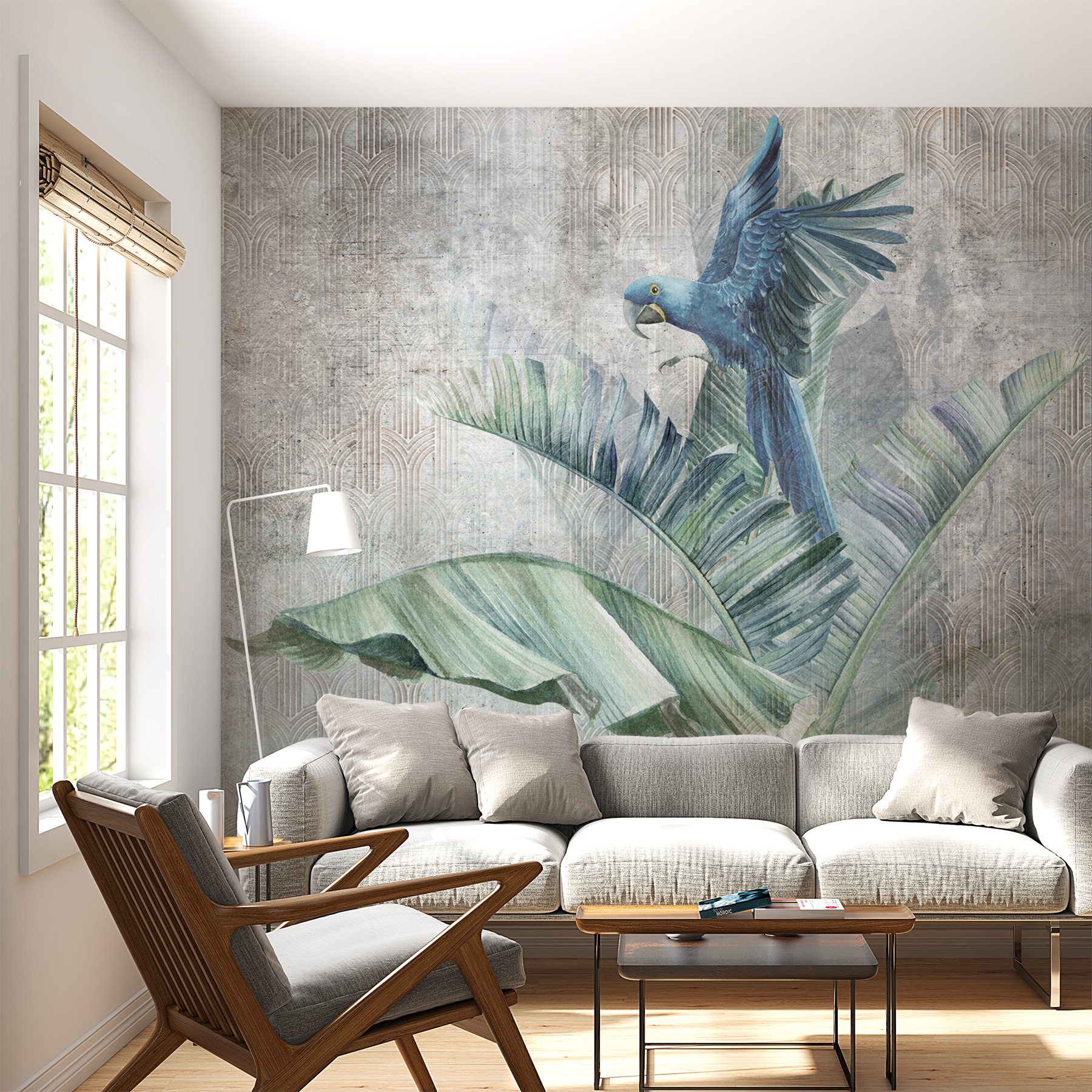 Φανταστείτε να μπαίνετε στο σαλόνι σας και να σας υποδέχεται ένας εντυπωσιακός μπλε παπαγάλος σκαρφαλωμένος σε πλούσια, φυλλώδη κλαδιά. Αυτή η τοιχογραφία τοίχου είναι κάτι περισσότερο από απλή διακόσμηση – είναι μια τροπική απόδραση. Το ζωηρό μπλε του παπαγάλου αναδύεται σε ένα φόντο από καταπραϋντικά πράσινα, κάνοντας το χώρο σας να μοιάζει με όαση τροπικού δάσους. Είναι ιδανική για όποιον αγαπάει τα πουλιά ή απλά χρειάζεται λίγη περισσότερη φύση στη ζωή του. Φανταστείτε το στην τραπεζαρία σας, προσθέτοντας μια φρέσκια ατμόσφαιρα στον πρωινό σας καφέ ή στους καλεσμένους σας για δείπνο, που συμπληρώνει το μοναδικό σας στυλ. Επιπλέον, έχει ακριβώς τη σωστή πινελιά κομψότητας με αυτά τα φύλλα φοίνικα που πλαισιώνουν τη σκηνή. Γιατί να συμβιβαστείτε με απλούς τοίχους όταν μπορείτε να έχετε ένα έργο τέχνης που σας μεταφέρει σε έναν τροπικό παράδεισο κάθε μέρα;