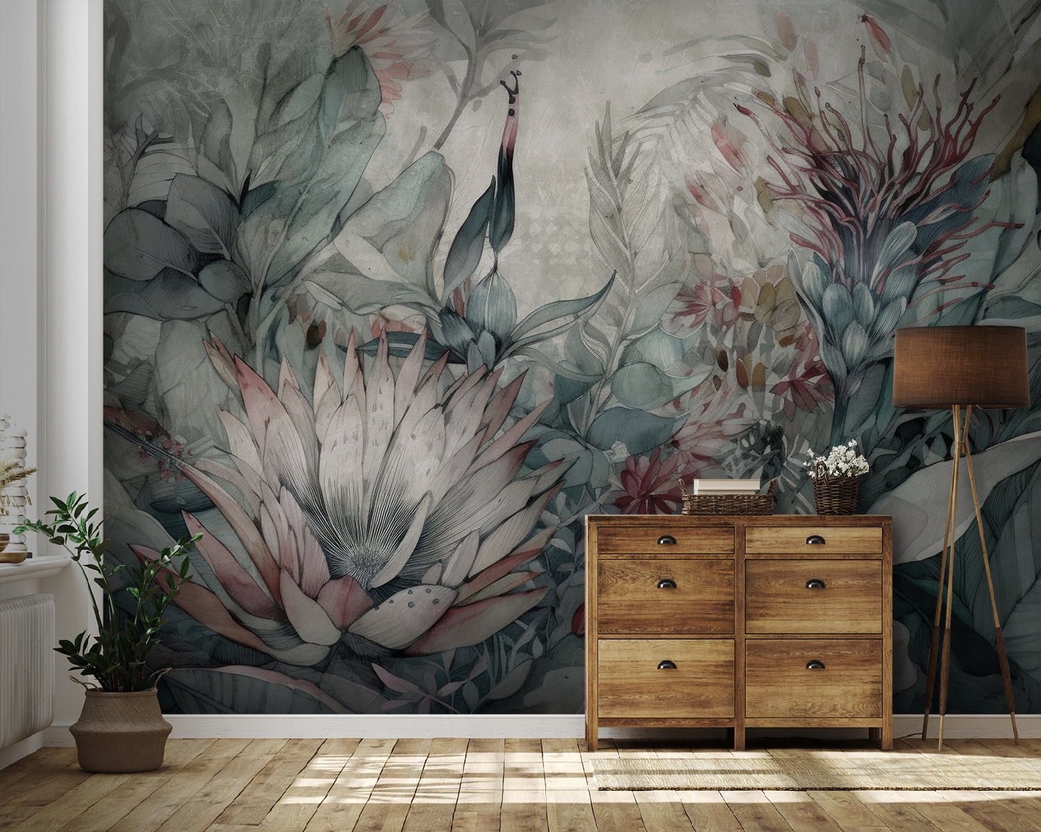 Αυτή η τοιχογραφία ταιριάζει απόλυτα με boho-chic vibes ή ακόμα και με ένα μοντέρνο μινιμαλιστικό στυλ, προσθέτοντας ακριβώς το σωστό pop της τέχνης εμπνευσμένης από τη φύση. Σκεφτείτε τον πρωινό σας καφέ – τώρα φανταστείτε να τον πίνετε περιτριγυρισμένοι από αυτό το γαλήνιο, όμορφο χρώμα βοτανικής ευτυχίας. Το δωμάτιό σας θα μοιάζει με μια καταπραϋντική απόδραση, ένα μέρος όπου μπορείτε να χαλαρώσετε και να αφήσετε το μυαλό σας να περιπλανηθεί. Επιπλέον, οι φίλοι σας σίγουρα θα ζηλέψουν λιγάκι.