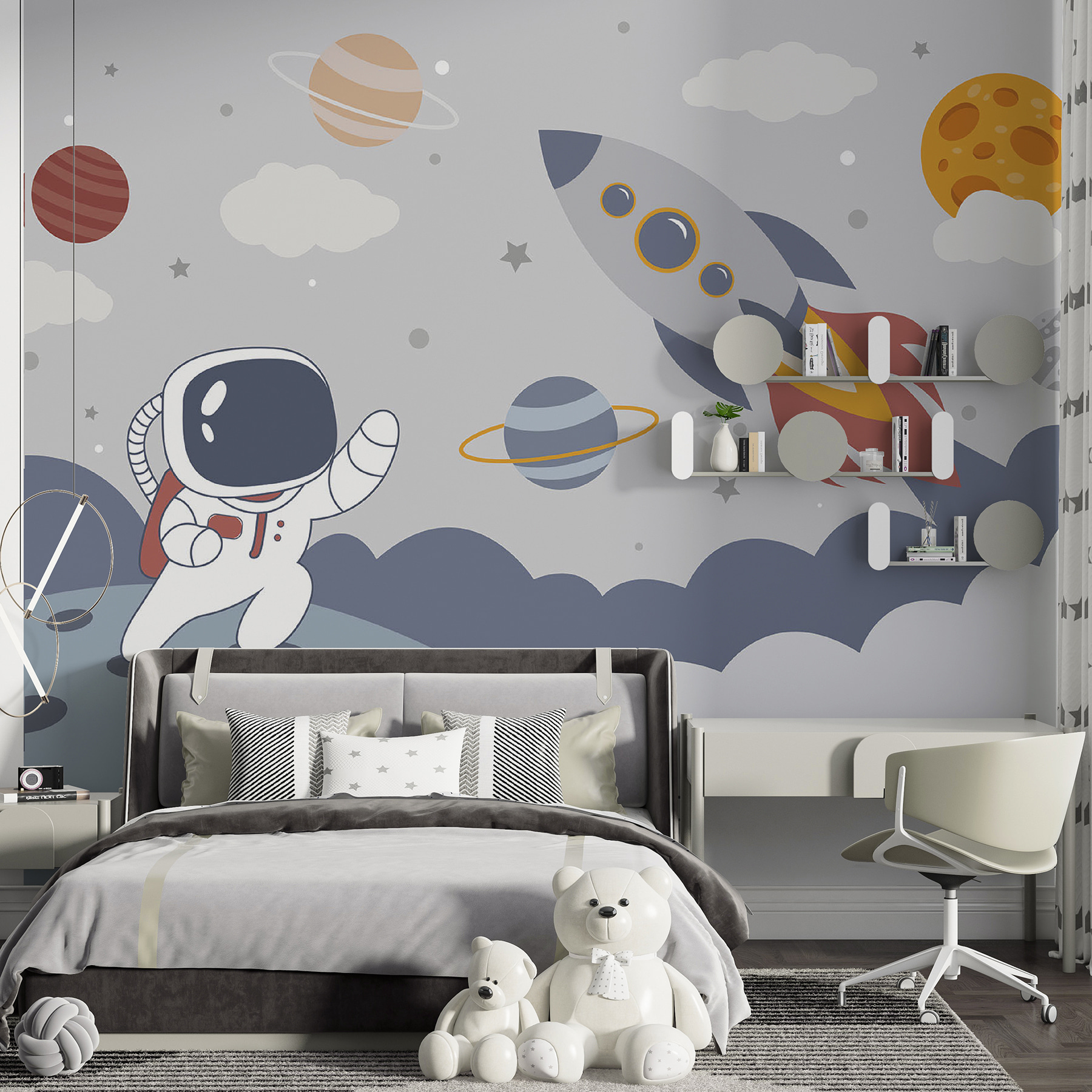 Η μετατροπή του χώρου ενός παιδιού σε μια κοσμική περιπέτεια είναι τόσο εύκολη όσο αυτή η τοιχογραφία με έναν γοητευτικό αστροναύτη και ζωντανούς πλανήτες. Απλά φανταστείτε ένα μικρό παιδί να ατενίζει αυτή την εξωπραγματική σκηνή και να ονειρεύεται διαστημικά ταξίδια και διαγαλαξιακές αποδράσεις. Το παιχνιδιάρικο σχέδιο φέρνει μια δόση φαντασίας, ιδανική για να κεντρίσει την περιέργεια για το σύμπαν. Αυτά τα πολύχρωμα δαχτυλίδια και τα ιδιόρρυθμα σύννεφα προσκαλούν σε ονειροπολήσεις και ταξίδια για παραμύθια, κάνοντας την ώρα του ύπνου λίγο λιγότερο συνηθισμένη. Δεν είναι απλώς μια διακόσμηση- είναι μια πύλη σε έναν γαλαξία γεμάτο θαύματα και χαρά!