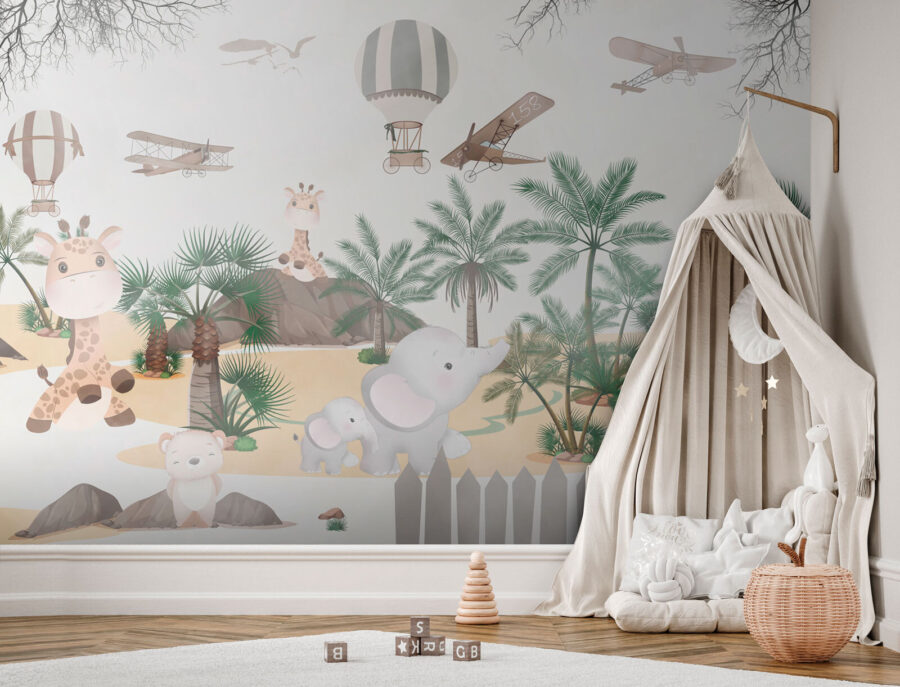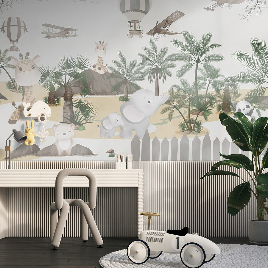 Μπορείτε σχεδόν να ακούσετε το θρόισμα των φοινικόφυλλων και να δείτε τα πρόσωπα των μικρών σας να φωτίζονται από ενθουσιασμό και περιέργεια. Ζωντανέψτε τη φαντασία με αυτή την απολαυστική τοιχογραφία, ιδανική για να προκαλέσει χαρά και έμπνευση σε κάθε παιδικό χώρο.