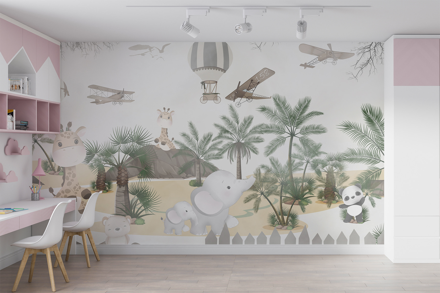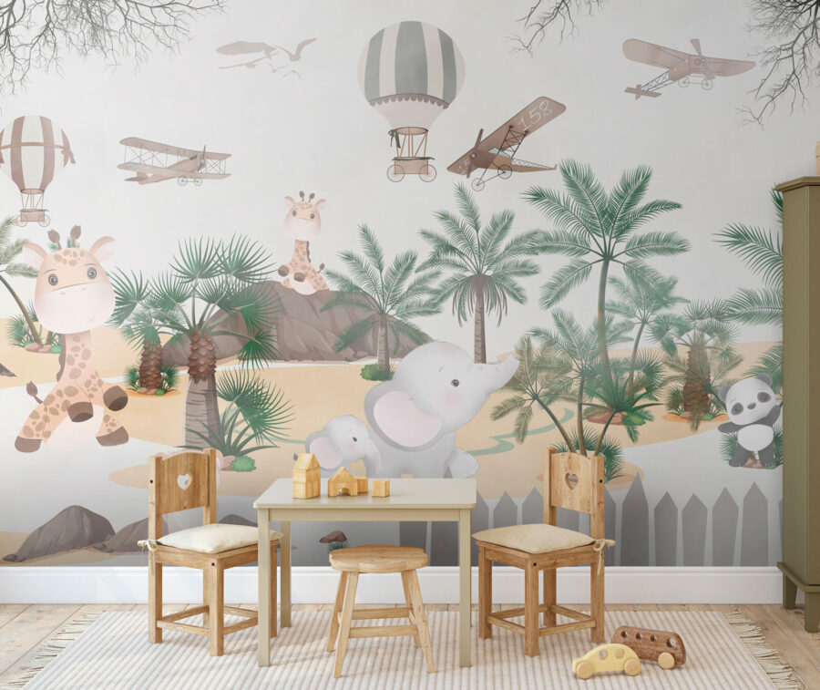 Φανταστείτε να μετατρέψετε το δωμάτιο του παιδιού σας σε μια ονειρική περιπέτεια σαφάρι! Αυτό ακριβώς θα έχετε με τις “Τοιχογραφίες τοίχου Καμηλοπάρδαλη με φοινικόδεντρα”. Αυτή η γοητευτική τοιχογραφία διαθέτει αξιολάτρευτες καμηλοπαρδάλεις, με φόντο καταπράσινους φοίνικες, παιχνιδιάρικους ελέφαντες, ακόμα και μπαλόνια και αεροπλάνα που επιπλέουν. Είναι σαν να μπαίνετε σε μια ευγενική ζούγκλα κατευθείαν από ένα παραμύθι.