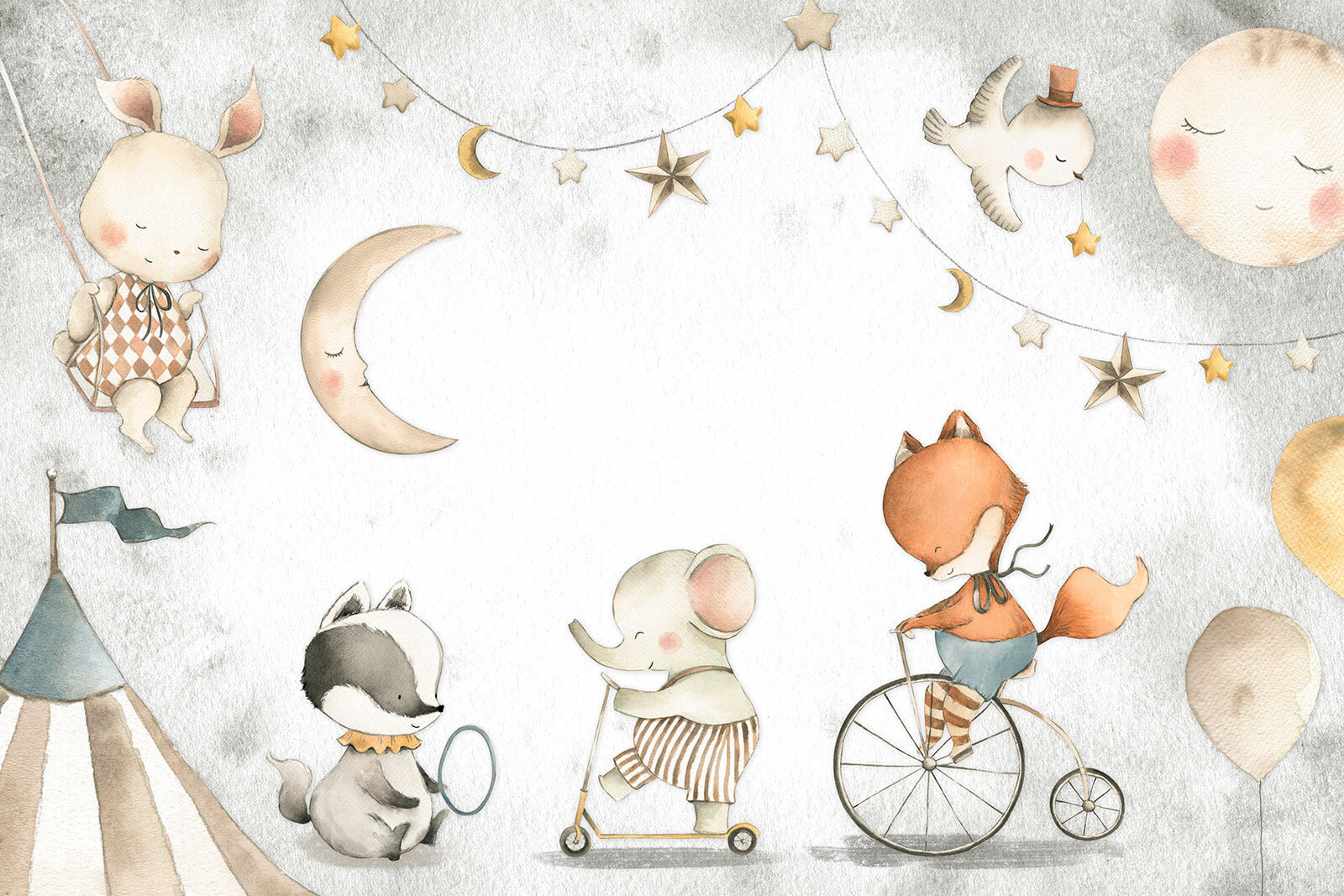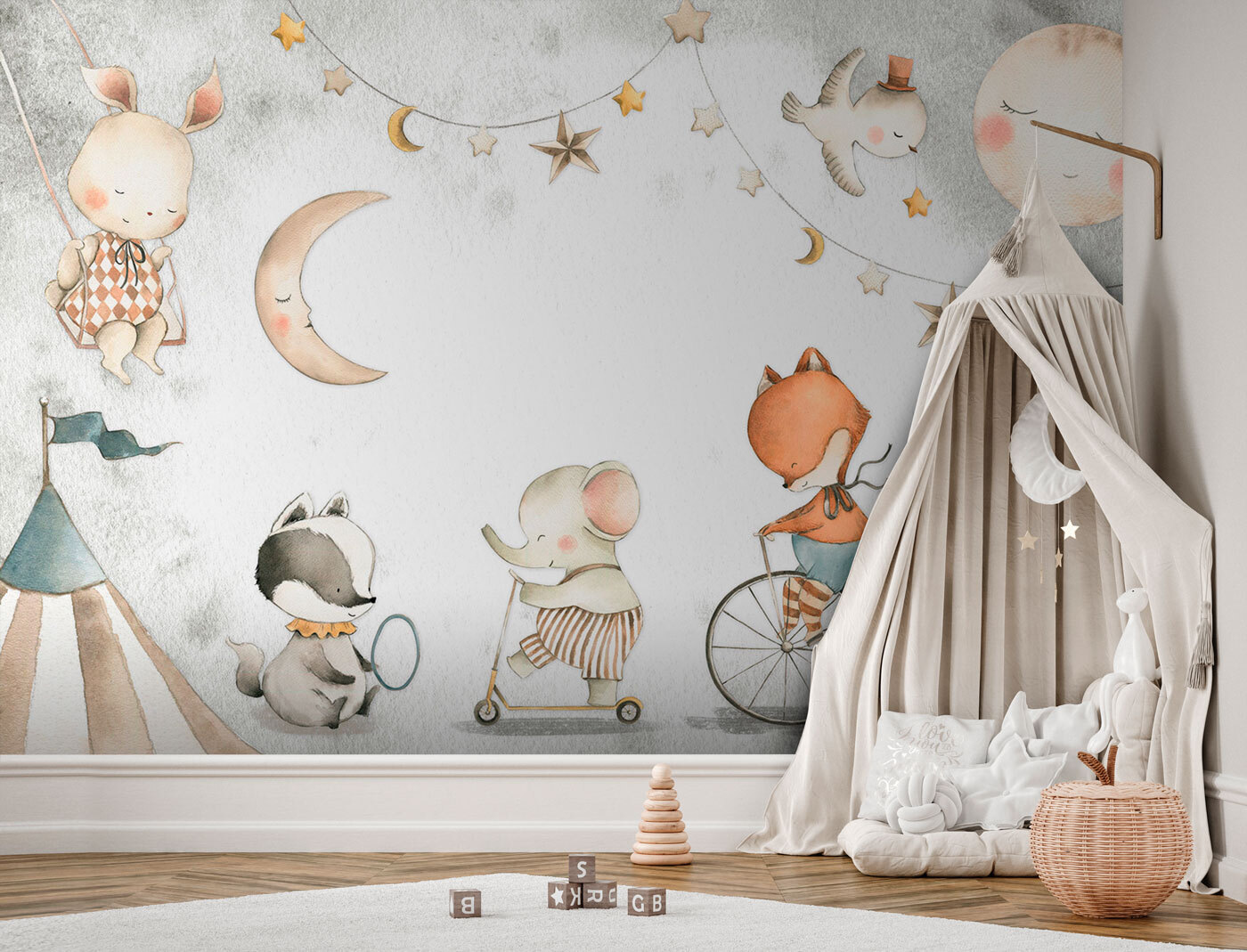 Μεταμορφώστε το δωμάτιο του παιδιού σας σε μια παράξενη χώρα θαυμάτων με την τοιχογραφία “Παιχνιδιάρικα ζώα στο καρναβάλι του τσίρκου”. Αυτή η μαγευτική εκτύπωση σας ταξιδεύει σε ένα ζεστό, ονειρικό καρναβάλι, όπου γοητευτικά ζώα παίζουν και ξεφαντώνουν κάτω από έναν έναστρο ουρανό. Ιδανική για να προσθέσετε μια δόση μαγείας σε υπνοδωμάτια ή χώρους παιχνιδιού, διαθέτει ένα γλυκό λαγουδάκι, μια παιχνιδιάρα αλεπού και άλλους αξιολάτρευτους φίλους που διασκεδάζουν σε διάφορες καρναβαλικές βόλτες. Θα λατρέψετε να βλέπετε το πρόσωπο του μικρού σας να φωτίζεται καθώς ανακαλύπτει τις απολαυστικές σκηνές. Δεν είναι απλώς διακόσμηση τοίχου, είναι μια καθημερινή δόση χαράς. Φανταστείτε παραμύθια για ύπνο με φόντο αυτό το σκηνικό – καθαρή μαγεία!