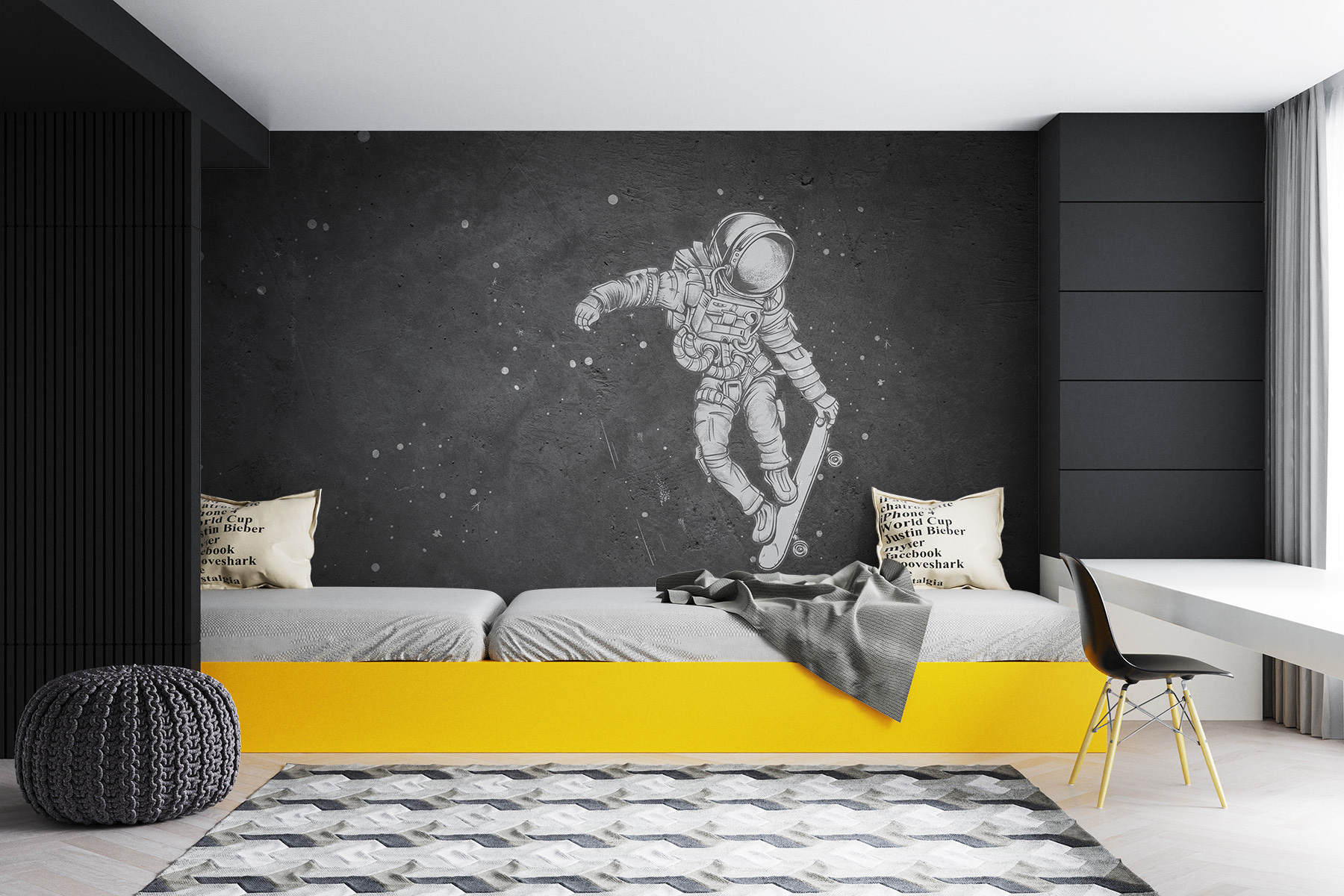 Μεταμορφώστε το χώρο σας με αυτή την ιδιόμορφη τοιχογραφία που απεικονίζει έναν αστροναύτη να διασχίζει αβίαστα το σύμπαν με ένα σκέιτμπορντ. Πρόκειται για μια παιχνιδιάρικη ανατροπή που θα εξάψει τη φαντασία του καθενός, υπενθυμίζοντάς μας ότι η ζωή πρέπει να είναι τόσο περιπετειώδης όσο μια διαστημική βόλτα. Φανταστείτε να φιλοξενείτε φίλους και τα μάτια τους να ανοίγουν καθώς βλέπουν αυτό το μοναδικό κομμάτι – είναι βέβαιο ότι θα προκαλέσει συζητήσεις! Η τοιχογραφία συνδυάζει τη συγκίνηση του σκέιτμπορντ με το θαύμα του διαστήματος, προσδίδοντας μια διασκεδαστική ατμόσφαιρα που είναι ταυτόχρονα χαλαρή και κοσμική. Ιδανικό για το δωμάτιο ενός παιδιού ή για οποιονδήποτε χώρο επιθυμεί μια πινελιά δροσιάς!