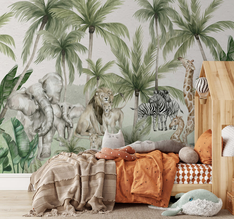 Μεταμορφώστε το δωμάτιο του παιδιού σας σε μια μαγική περιπέτεια στη ζούγκλα με τις “Τοιχογραφίες Ζωάκια της ζούγκλας κάτω από τους φοίνικες”. Είναι σαν να μπαίνεις σε ένα παραμύθι, με φιλικούς ελέφαντες, παιχνιδιάρικες ζέβρες και μεγαλοπρεπή λιοντάρια ακριβώς κάτω από τους φοίνικες που λικνίζονται. Ιδανική για βρέφη, γιους ή κόρες, αυτή η τοιχογραφία φέρνει μια ήρεμη αλλά και συναρπαστική ατμόσφαιρα σε κάθε παιδικό δωμάτιο ή δωμάτιο παιχνιδιού. Φανταστείτε τα παραμύθια που μπορείτε να πλέξετε με αυτό το σκηνικό! Τα παιδιά λατρεύουν να εντοπίζουν τις ψηλές καμηλοπαρδάλεις που κρυφοκοιτάζουν πάνω από το πλούσιο πράσινο. Είναι γοητευτικό, ελκυστικό και υπέροχα άγριο – ένα άμεσο αγαπημένο για τους μικρούς εξερευνητές.