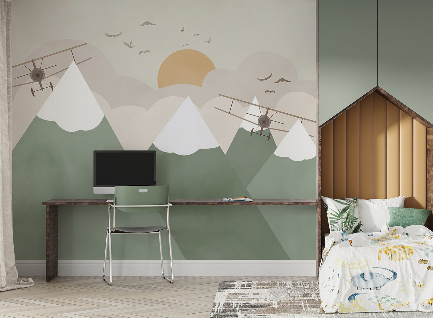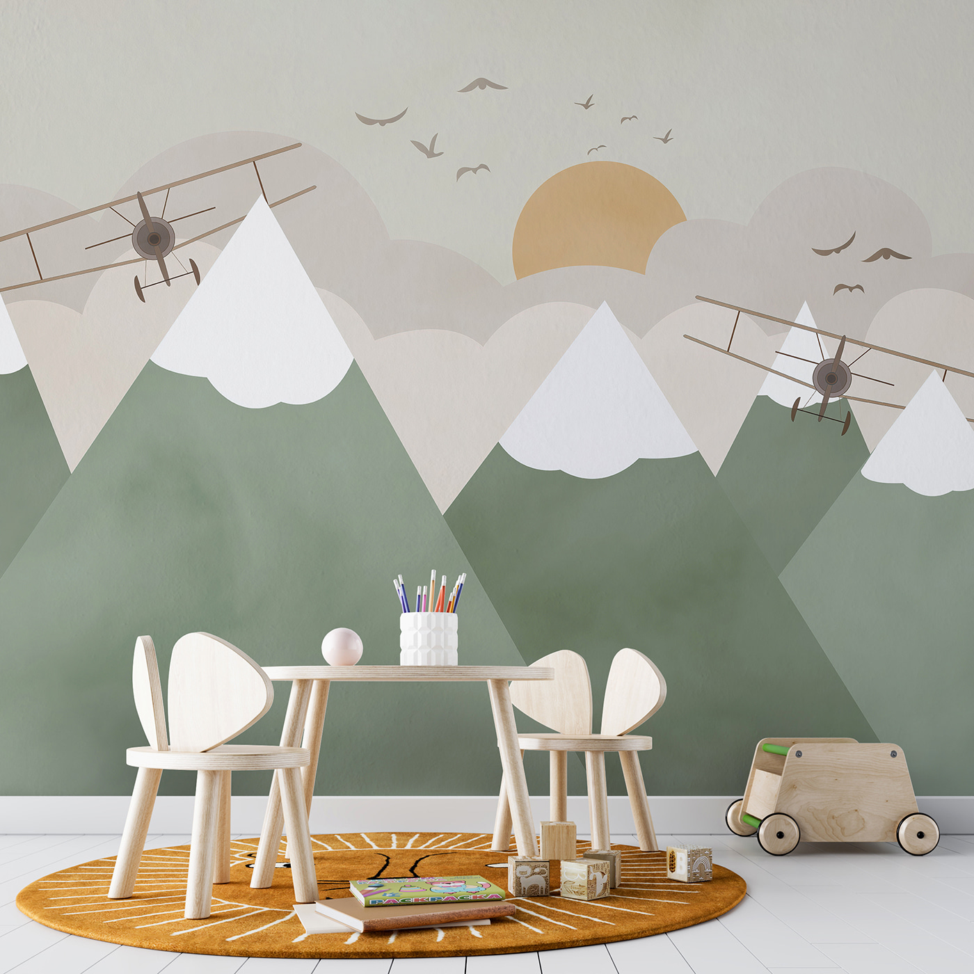 Μεταμορφώστε οποιοδήποτε δωμάτιο σε μια ιδιόρρυθμη περιπέτεια με αυτή τη γοητευτική τοιχογραφία με διπλάνα που πετούν πάνω από χιονισμένες κορυφές. Φανταστείτε το: μια ζεστή γωνιά όπου τα μικρά παιδιά μπορούν να κάνουν μεγάλα όνειρα, πετώντας μέσα από τα σύννεφα και κατακτώντας βουνά απευθείας από το υπνοδωμάτιό τους. Τα απαλά χρώματα και οι απαλές γραμμές το κάνουν να μοιάζει με μια ζεστή αγκαλιά, προσκαλώντας τη φαντασία και δημιουργώντας παράλληλα μια γαλήνια ατμόσφαιρα. Είναι ιδανικό για να πυροδοτήσει την αίσθηση του θαύματος κατά τη διάρκεια του παραμυθιού ή του παιχνιδιού. Ποιος ξέρει, μπορεί να εμπνεύσει ακόμα και μελλοντικούς πιλότους! Φανταστείτε μόνο τις ιστορίες που θα μπορούσαν να εκτυλιχθούν εδώ. Ιδανική για ένα παιδικό δωμάτιο ή ένα διασκεδαστικό δωμάτιο παιχνιδιού, αυτή η τοιχογραφία φέρνει μια πινελιά μαγείας που μοιάζει τόσο περιπετειώδης όσο και ζεστή.