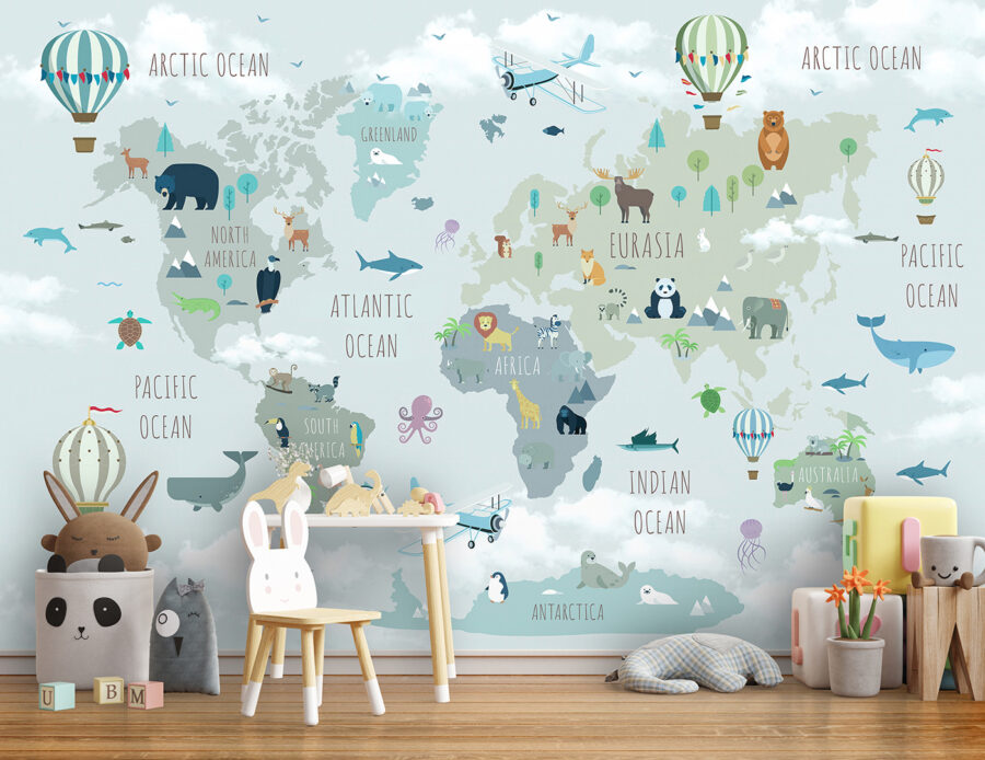 Σκεφτήκατε ποτέ να κάνετε με το μικρό σας παιδί ένα ταξίδι σε όλο τον κόσμο χωρίς να βγείτε από το δωμάτιό του; Αυτή η τοιχογραφία τοίχου “Αερόστατο με σημαίες” το κάνει εφικτό – και πολύ διασκεδαστικό! Δεν είναι απλώς ένας χάρτης, είναι μια περιπέτεια. Φανταστείτε να ταξιδεύετε μέσα από τα σύννεφα σε ένα πολύχρωμο αερόστατο, να εντοπίζετε χαριτωμένα ζώα και να εξερευνείτε ηπείρους. Είναι ιδανικό για περίεργα μυαλά και ονειροπόλους.